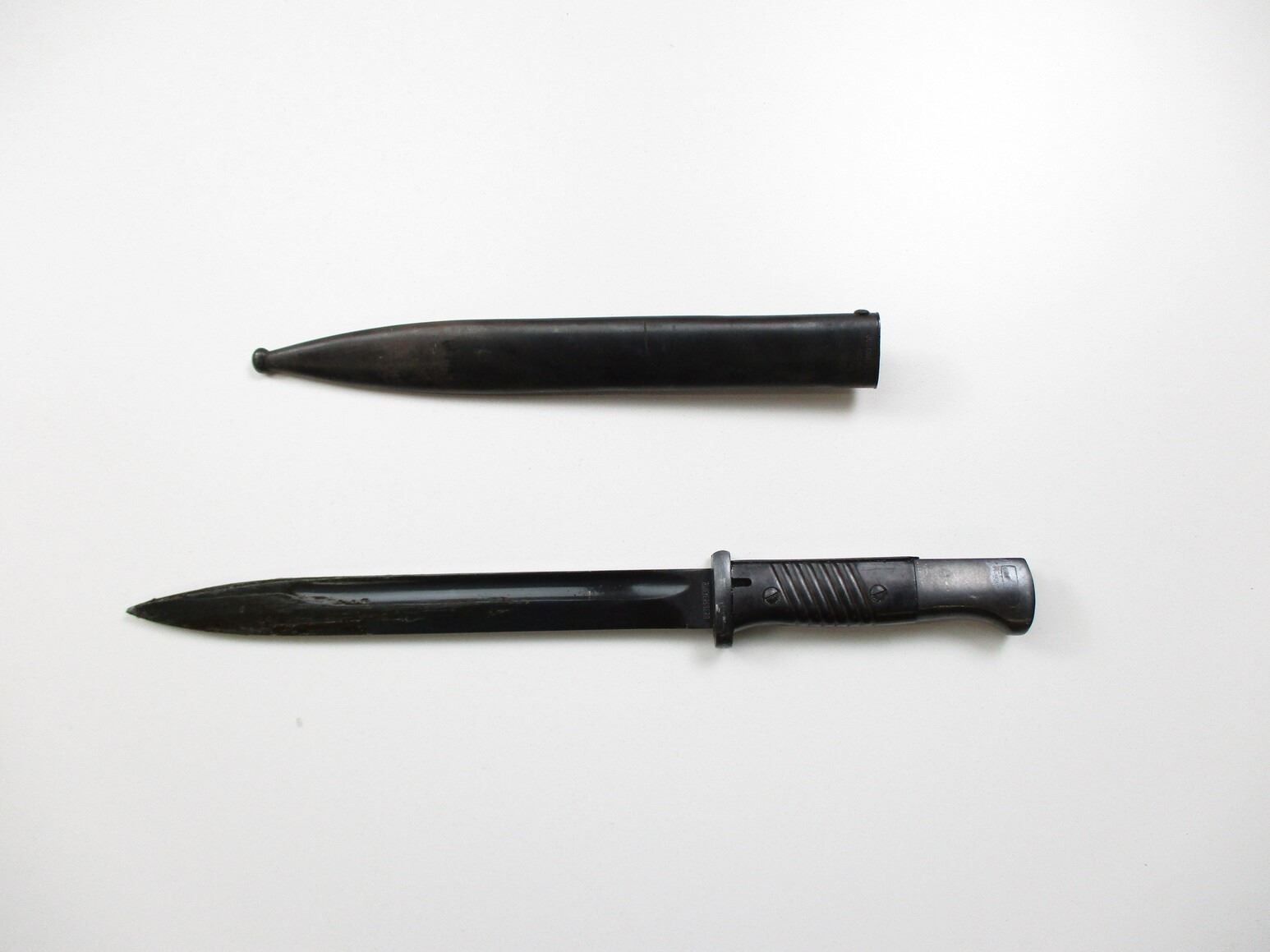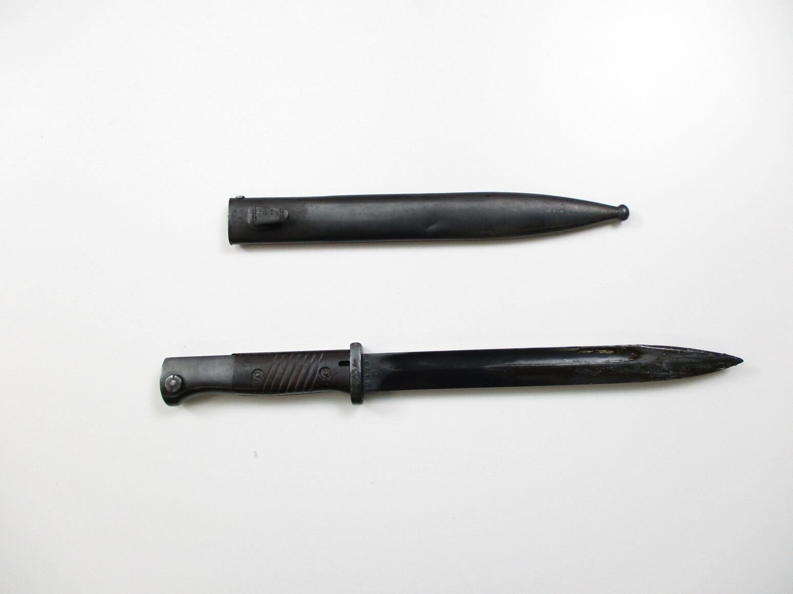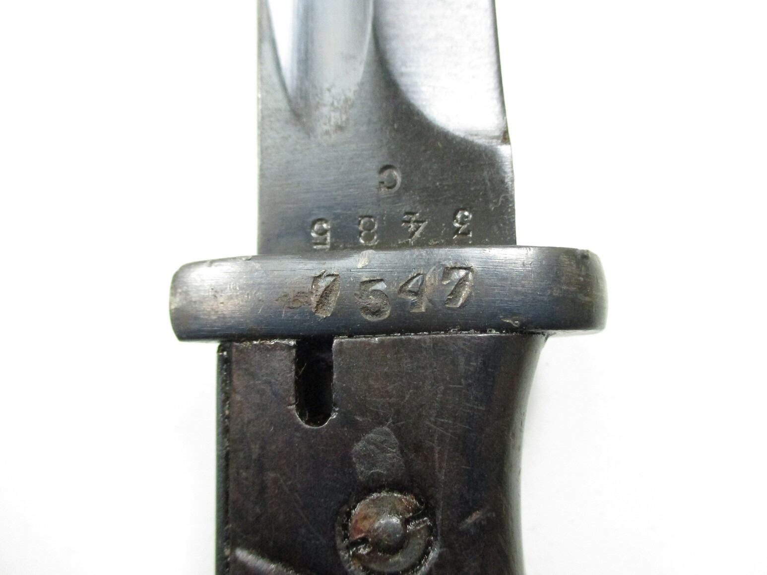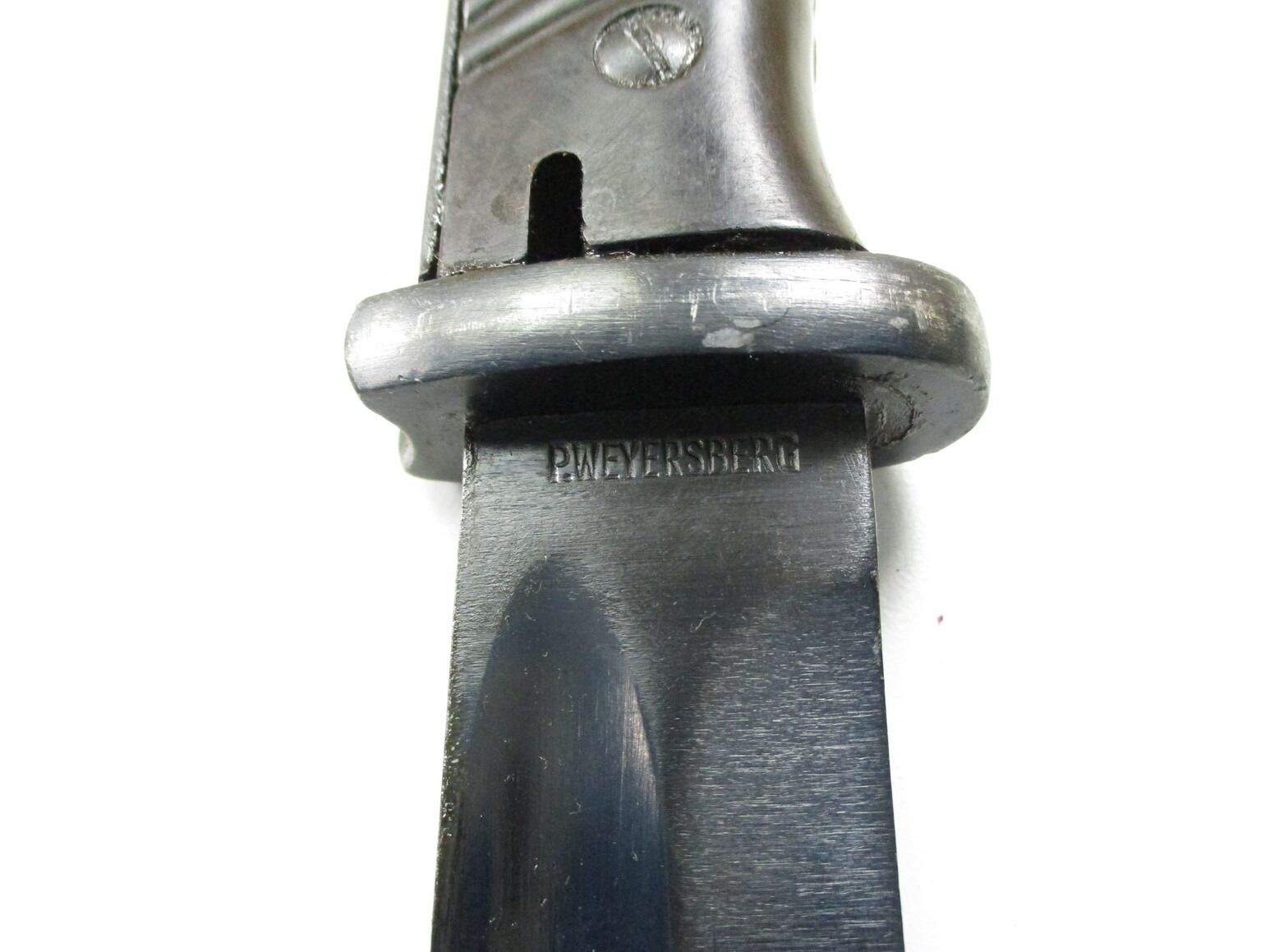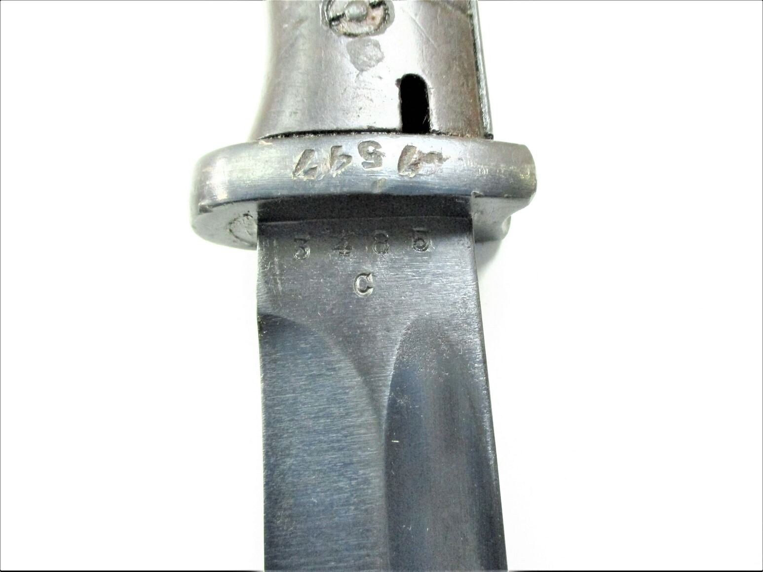 YUGOSLAVIAN REWORK M1884/98 III BAYONET, (1) FITS K98 / M48 MAUSER RIFLES, RICASSO MARKED: "P.WEYERSBERG", OTHER-SIDE MARKED: "3485" OVER "C", CROSS-PIECE MARKED: "7547" (RE-NUMBERED BY YUGOSLAVIA), BLACK BAKELITE GRIP, METAL POMMEL, NO VISIBLE MARKINGS, METAL SCABBARD MARKED: "5523" OVER "I", "JOS.CORTS SN, 1938" & "7547" (RE-NUMBERED BY YUGOSLAVIA), BLADE APPROX. 10" & OAL APPROX. 15 1/8".