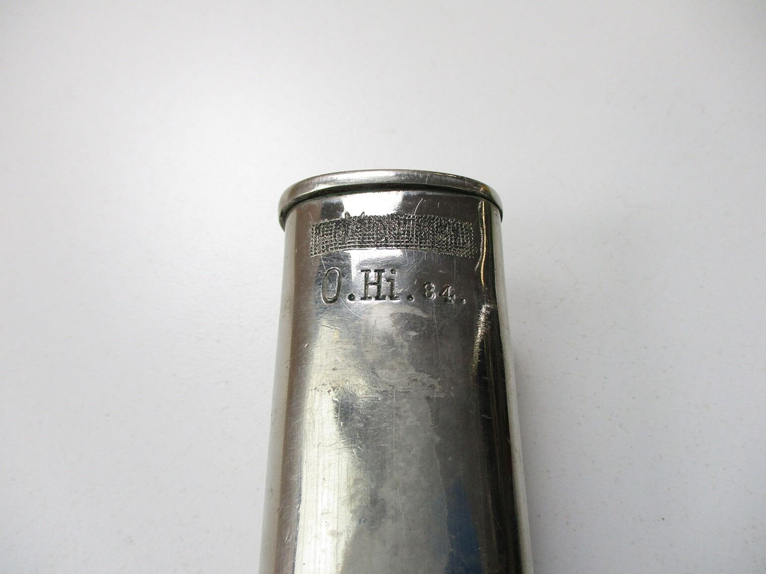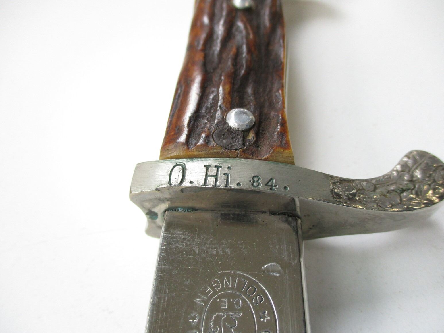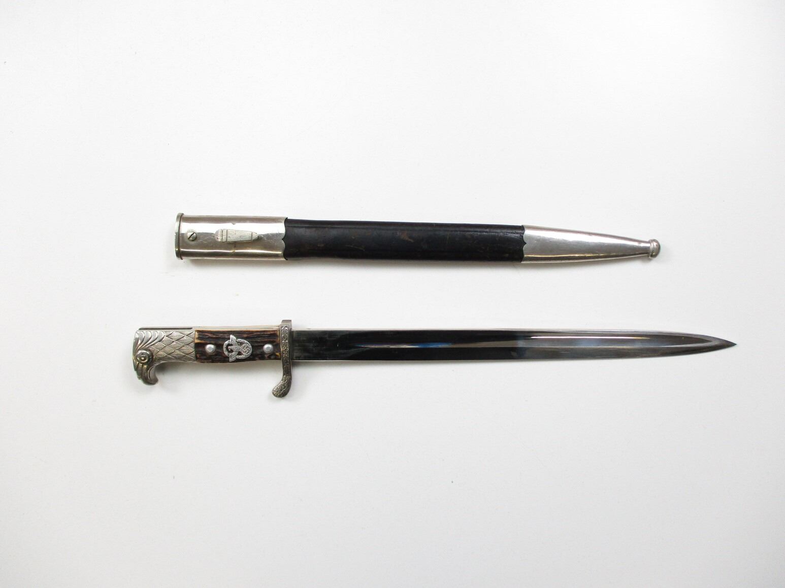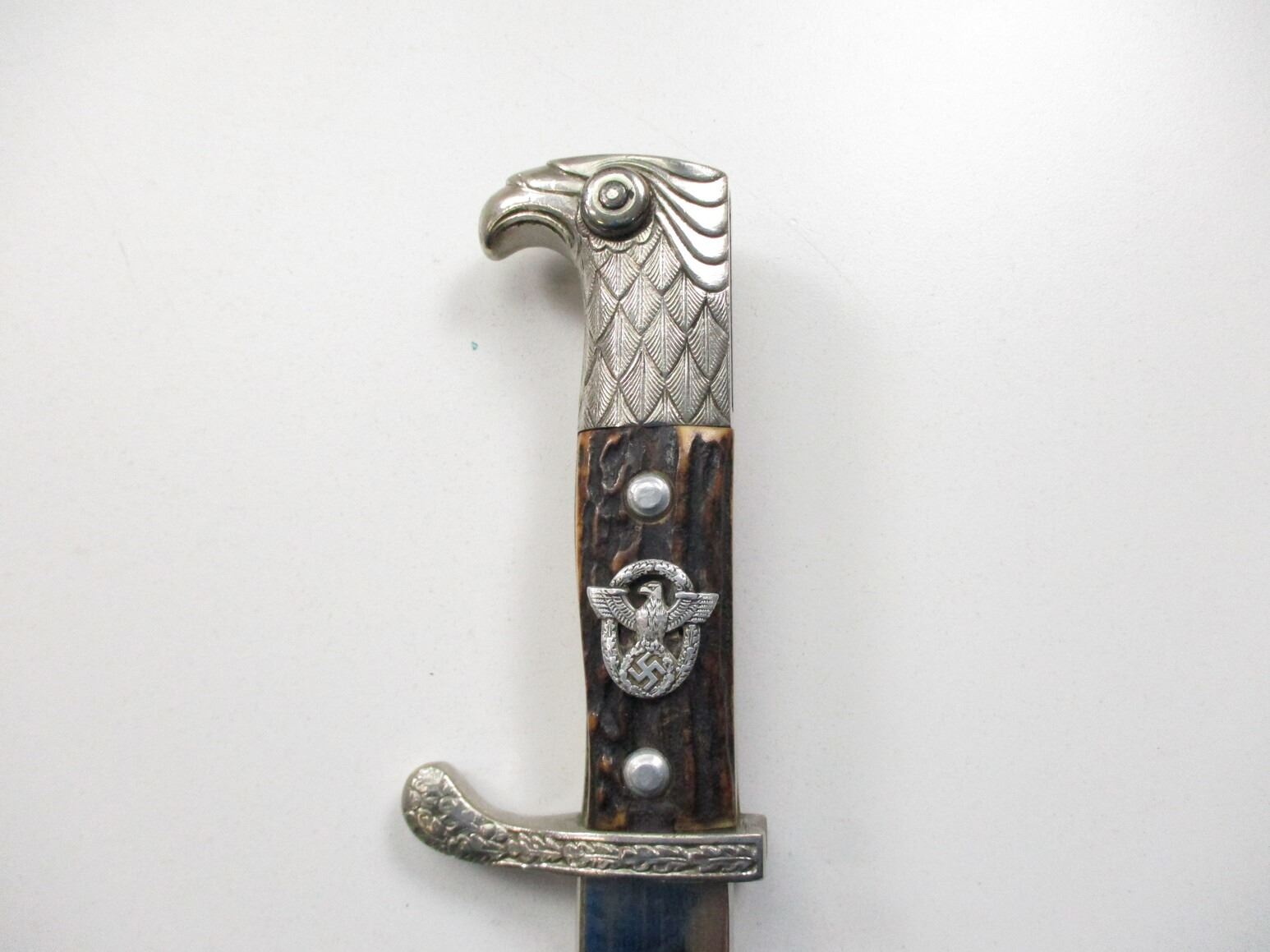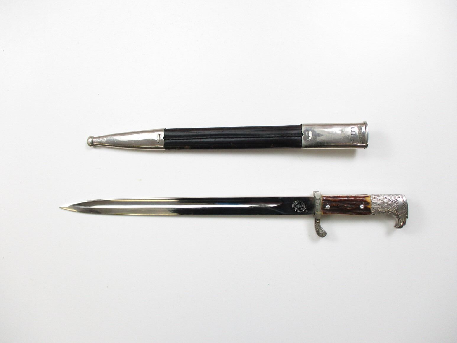 WWII GERMAN UNIT MARKED DRESS BAYONET, (1) BLADE MARKED: "CARL EICKHORN, SOLINGEN" (1933-1935 CIRCULAR LOGO), CROSS-PIECE MARKED: "O.HI.84." & LEAF DESIGN, 2-PIECE STAG HORN GRIP WITH EAGLE & SWASTIKA SYMBOL, METAL POMMEL WITH EAGLE HEAD DESIGN, LEATHER & NICKEL PLATED SCABBARD, MARKED: "O.HI.84." & SOMETHING CROSSED-OUT, BLADE APPROX. 13 1/8" & OAL APPROX. 17 3/8".