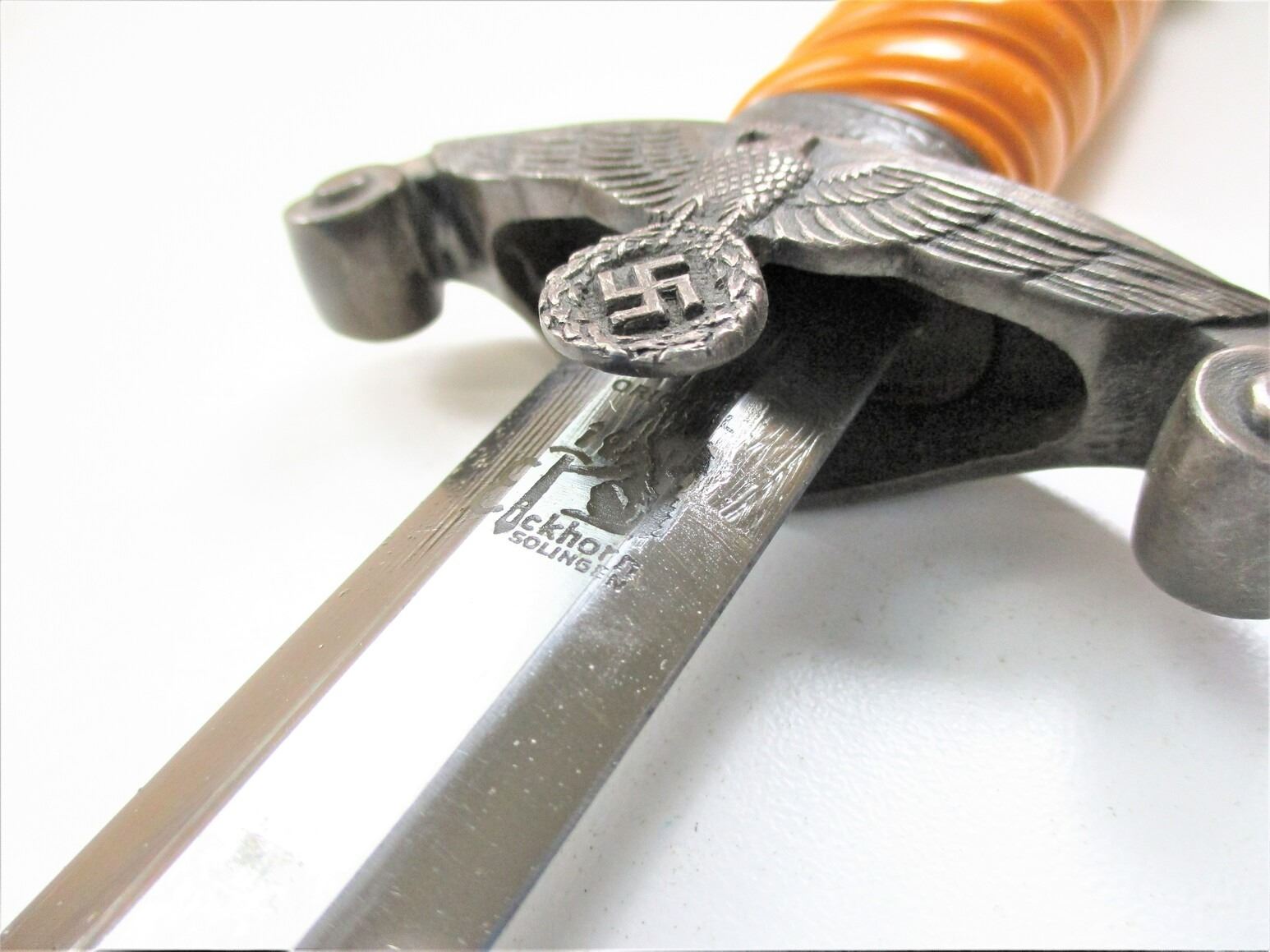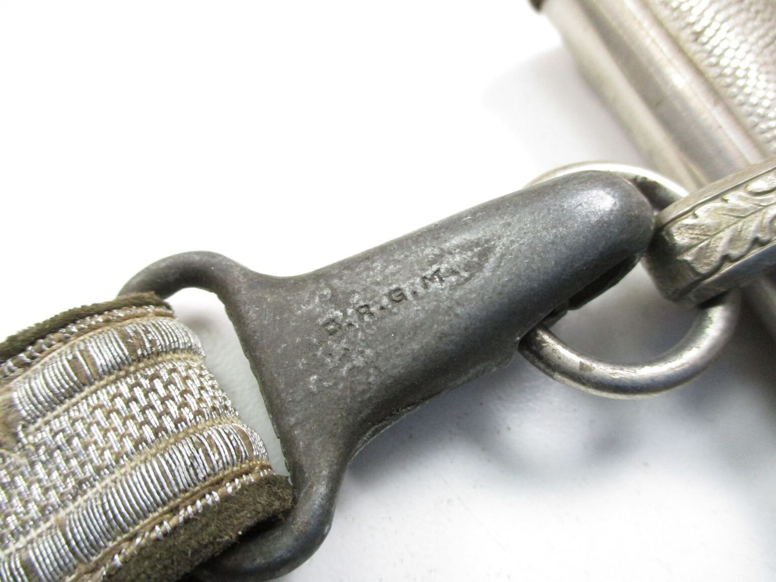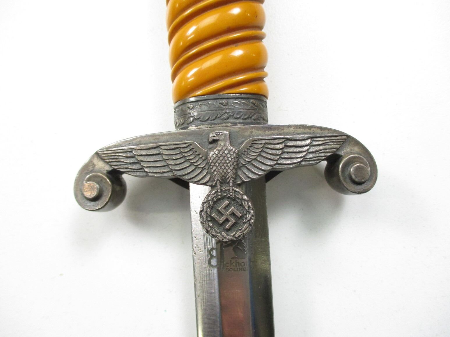 WWII GERMAN THIRD REICH OFFICERS HEER DAGGER WITH PORTEPEE, (1) BLADE MARKED: "ORIGINAL EICKHORN, SOLINGEN", CROSS-PIECE HAS WEHRMACHT EAGLE & OAK LEAF RING, WRAPPED GRIP MISSING WIRE, METAL POMMEL, METAL SCABBARD WITH HANGERS & PORTEPEE, HANGERS ARE NON-FLUORESCING GREEN & SILVER INDICATING LIEUTENANT(?), HANGERS MARKED: "D.R.G.M.", SILVER THREAD POMPEII, BLADE APPROX. 10" & OAL APPROX. 14.5".