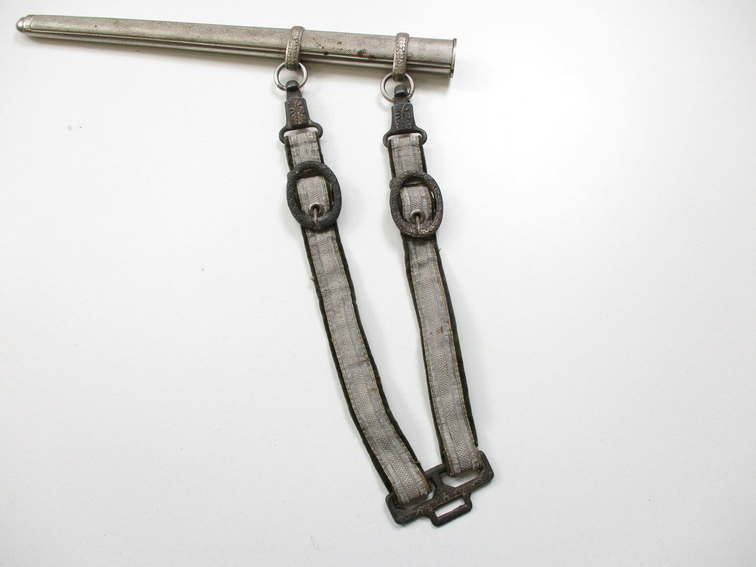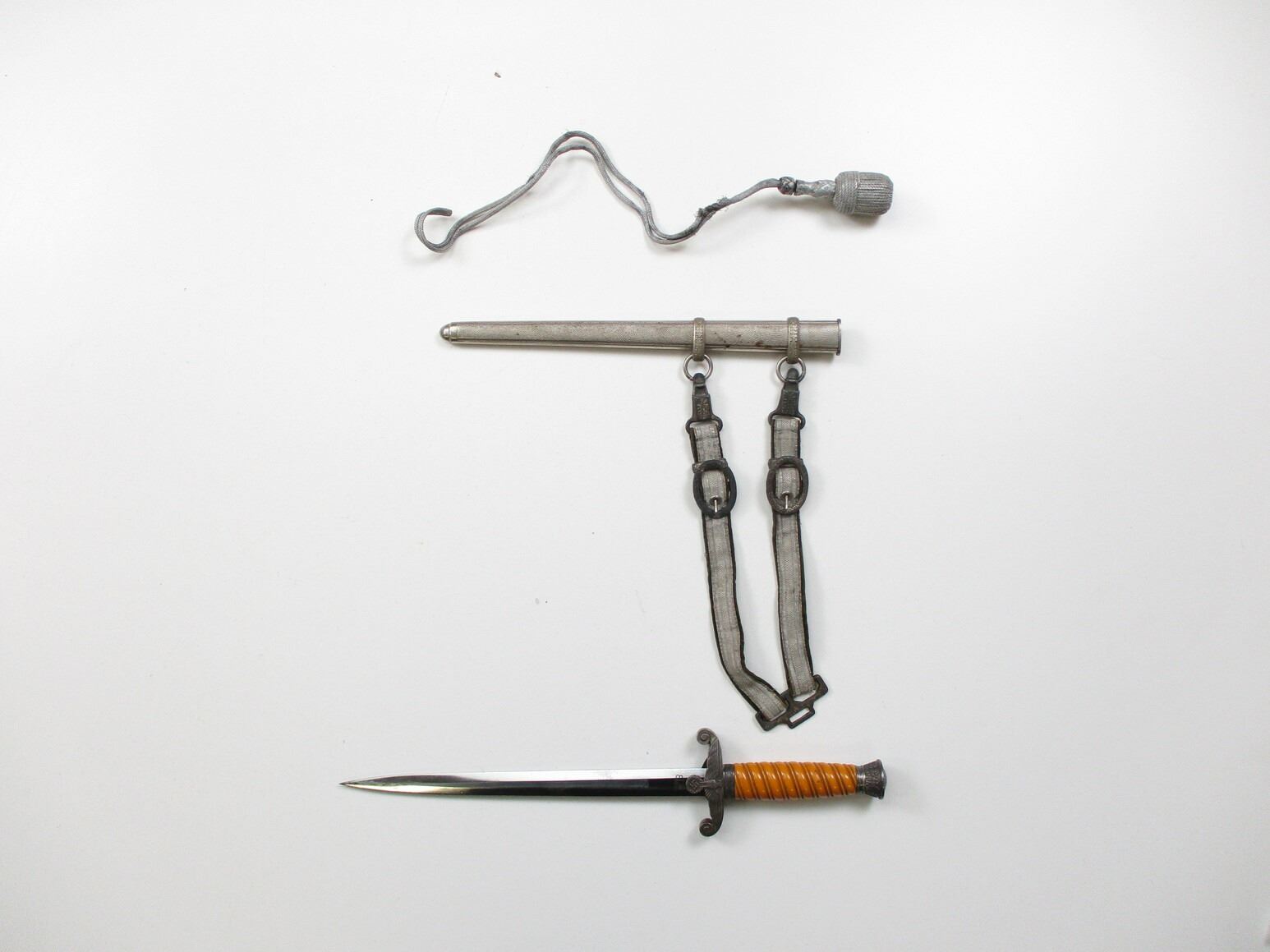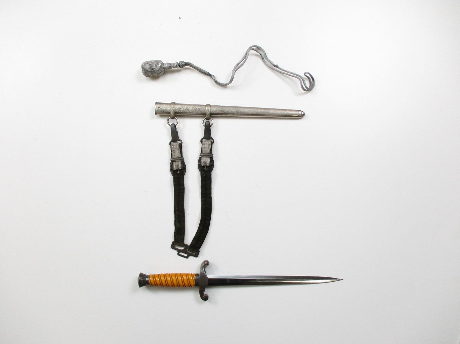 WWII GERMAN THIRD REICH OFFICERS HEER DAGGER WITH PORTEPEE, (1) BLADE MARKED: "ORIGINAL EICKHORN, SOLINGEN", CROSS-PIECE HAS WEHRMACHT EAGLE & OAK LEAF RING, WRAPPED GRIP MISSING WIRE, METAL POMMEL, METAL SCABBARD WITH HANGERS & PORTEPEE, HANGERS ARE NON-FLUORESCING GREEN & SILVER INDICATING LIEUTENANT(?), HANGERS MARKED: "D.R.G.M.", SILVER THREAD POMPEII, BLADE APPROX. 10" & OAL APPROX. 14.5".
