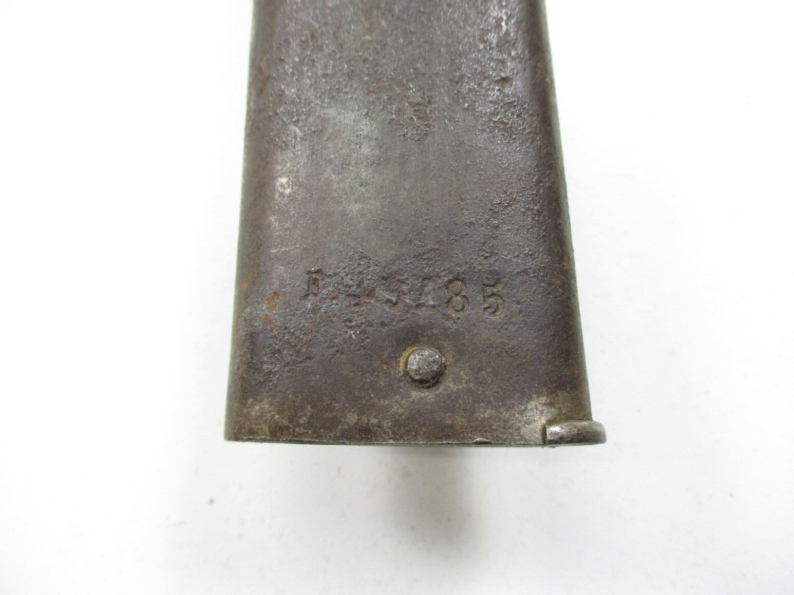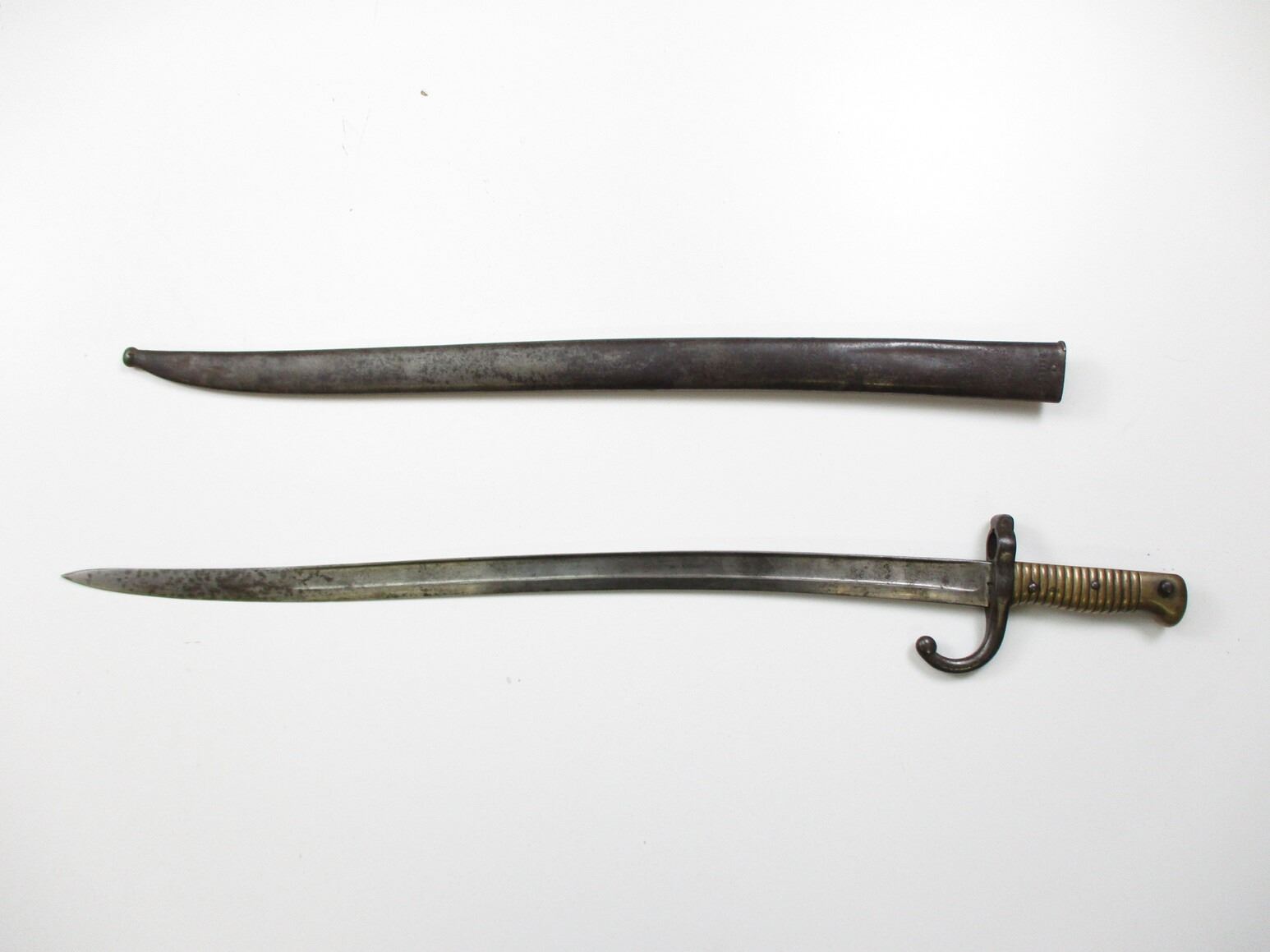 FRENCH 1866 PATTERN YATAGHAN SWORD-BAYONET , (1) FITS 11MM M1866 CHASSEPOT & M1874 GRAS RIFLES, BLADE MARKED WITH MAKER'S MARK, SPINE MARKED: "1871", CROSS-PIECE MARKED: "L.43853" & MAKER'S MARK, BENT QUILLON, METAL GRIP/POMMEL, METAL SCABBARD MARKED: "F 49185", BLADE APPROX. 22 7/8" & OAL APPROX. 27 3/8".