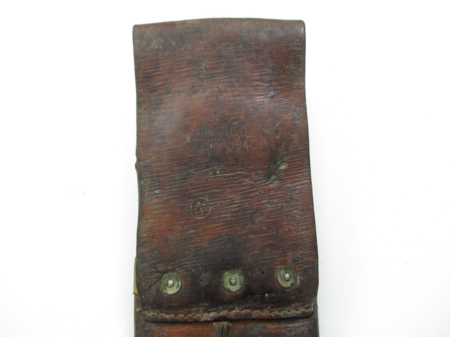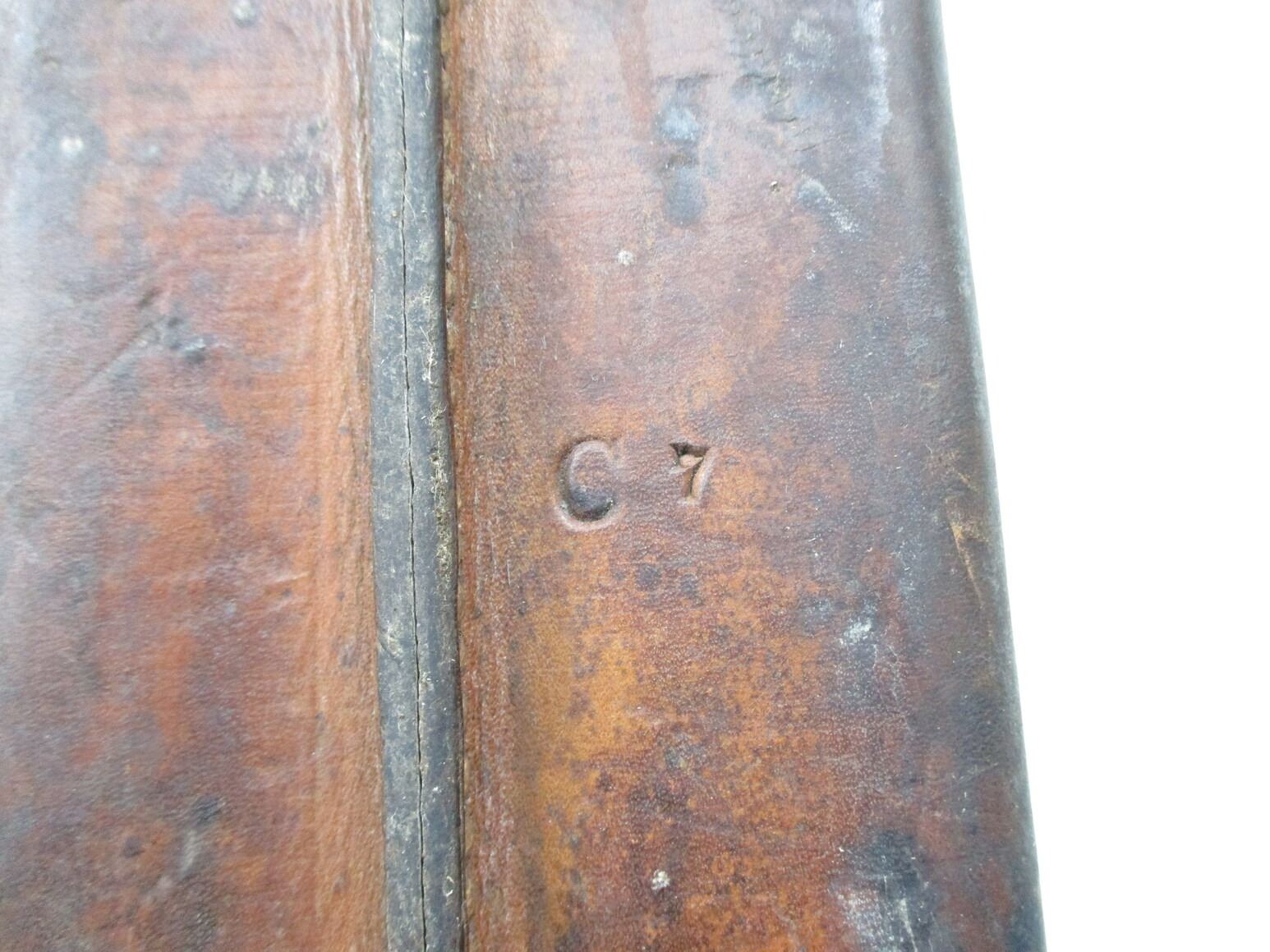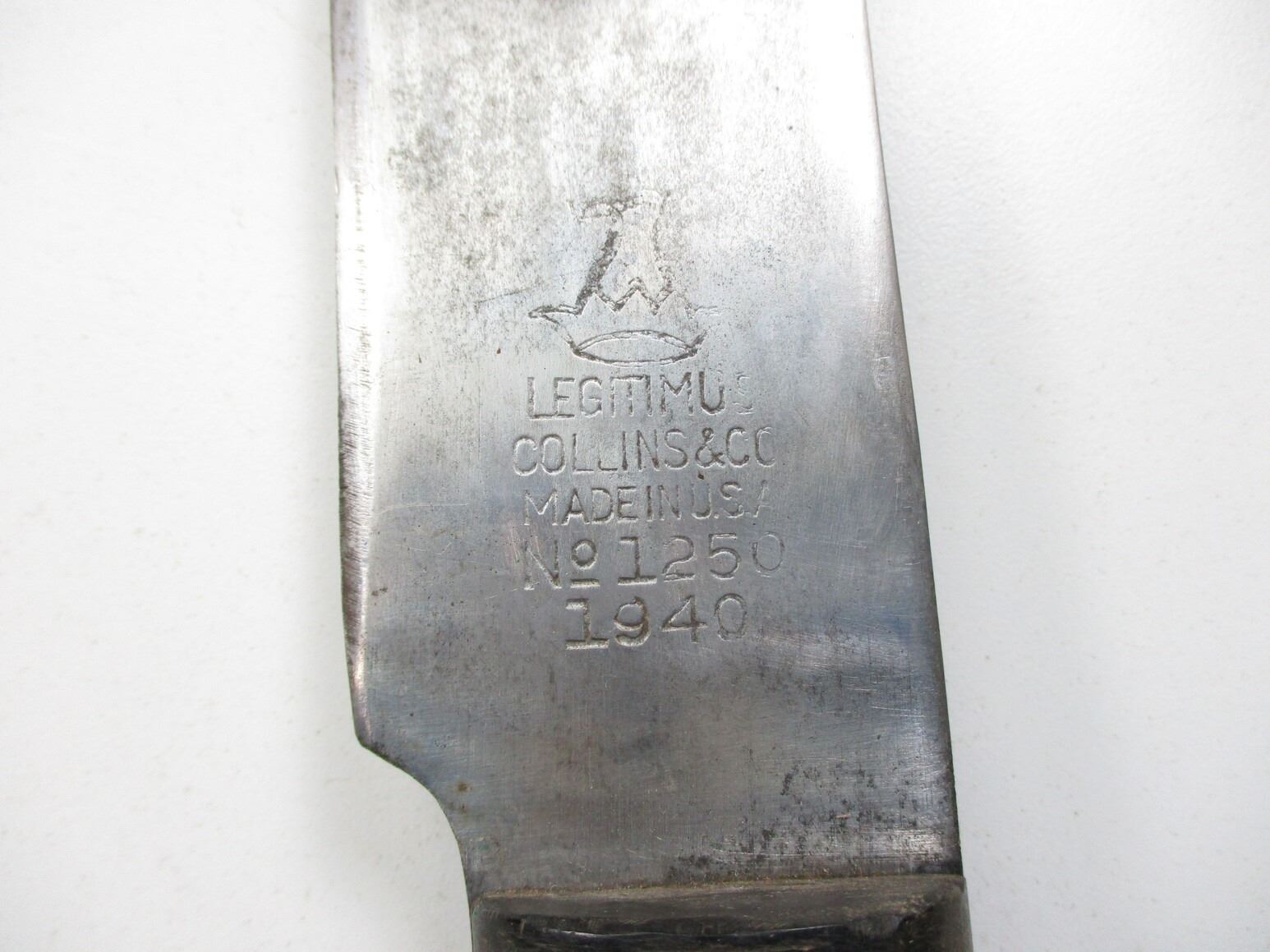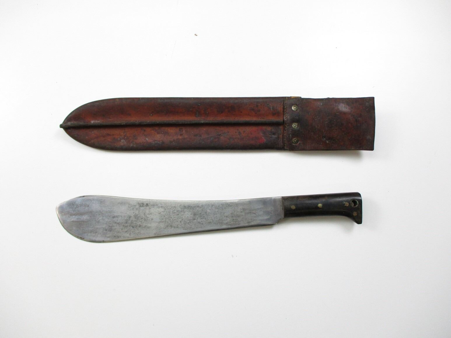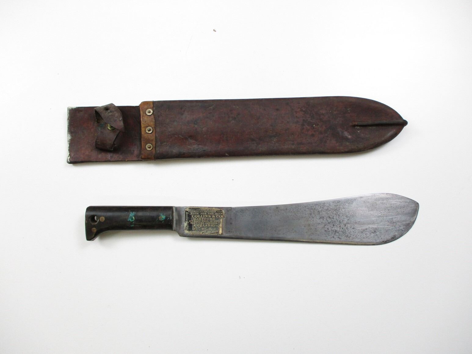 WWII CANADIAN MILITARY MACHETE, (1) BLADE MARKED: CROWN OVER "LEGITIMUS COLLINS & CO., MADE IN U.S.A., NO.1250, 1940", OTHER-SIDE WITH MAKER'S STICKER, 2-PIECE WOOD GRIP, LEATHER SHEATH MARKED: "CARSON CO. LTD., OTTAWA 1940", C-BROAD ARROW & "C 7", BLADE APPROX. 14.75" & OAL APPROX. 19 7/8".