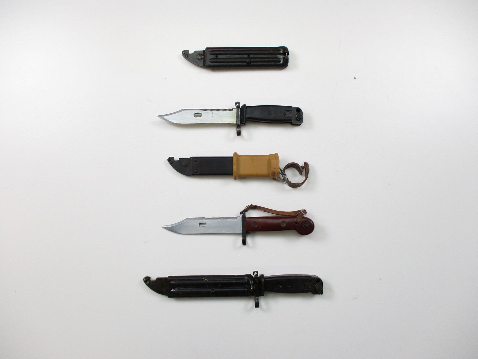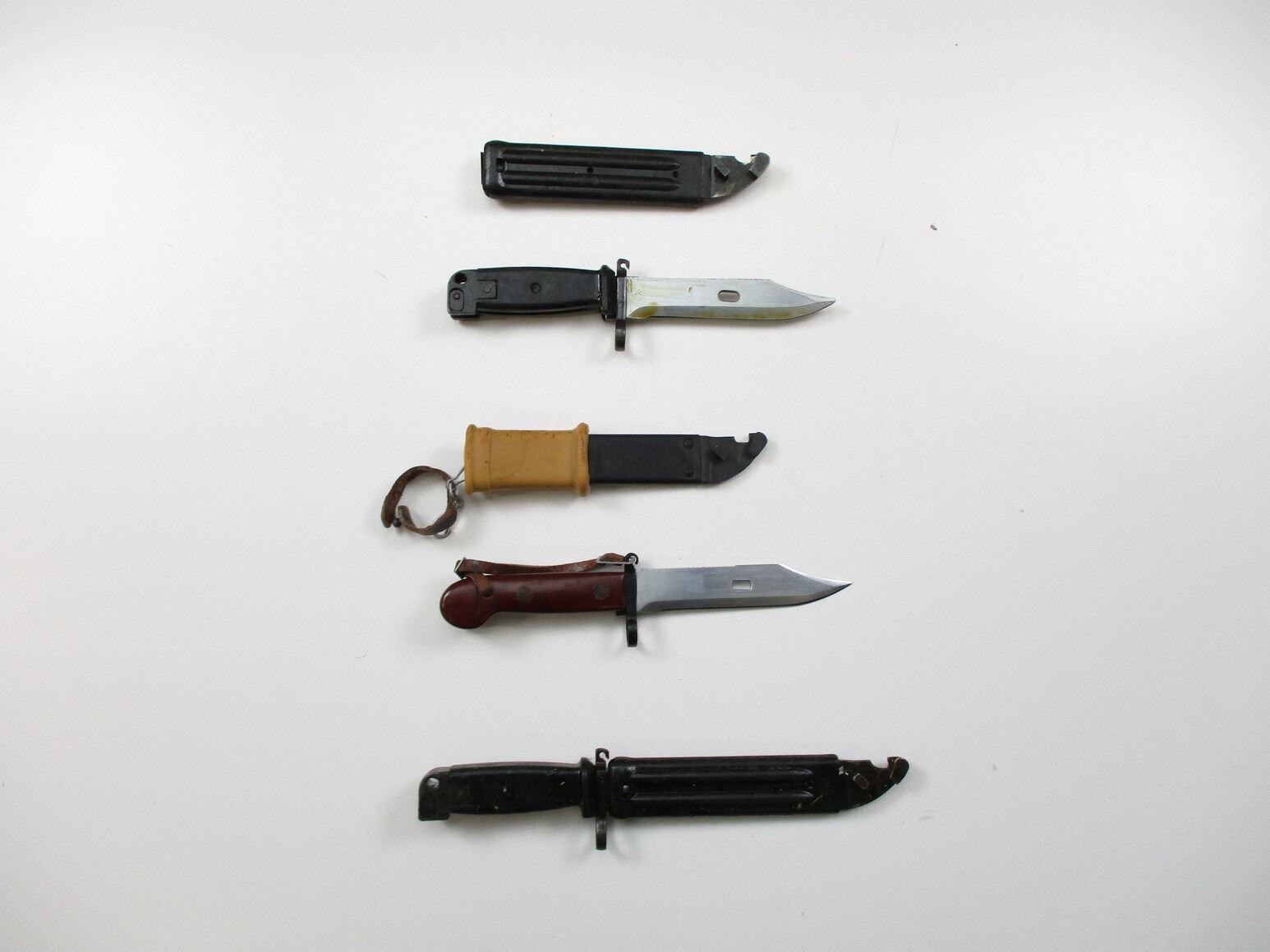 ASSORTED AK / AKM BAYONET LOT, LOT INCLUDES; (1) WITH LEATHER THONG, NO VISIBLE MARKINGS, METAL & RUBBER SCABBARD CAN BE USED AS WIRE CUTTERS, BLADE APPROX. 6" & OAL APPROX. 11" & (2)BLACK GRIP WITH BLACK SCABBARDS, ONE SCABBARD IS STUCK DUE TO GREASE(?), VARIOUS MARKINGS, BLADE APPROX. 6" & OAL APPROX. 10 5/8". SEE PHOTOS.