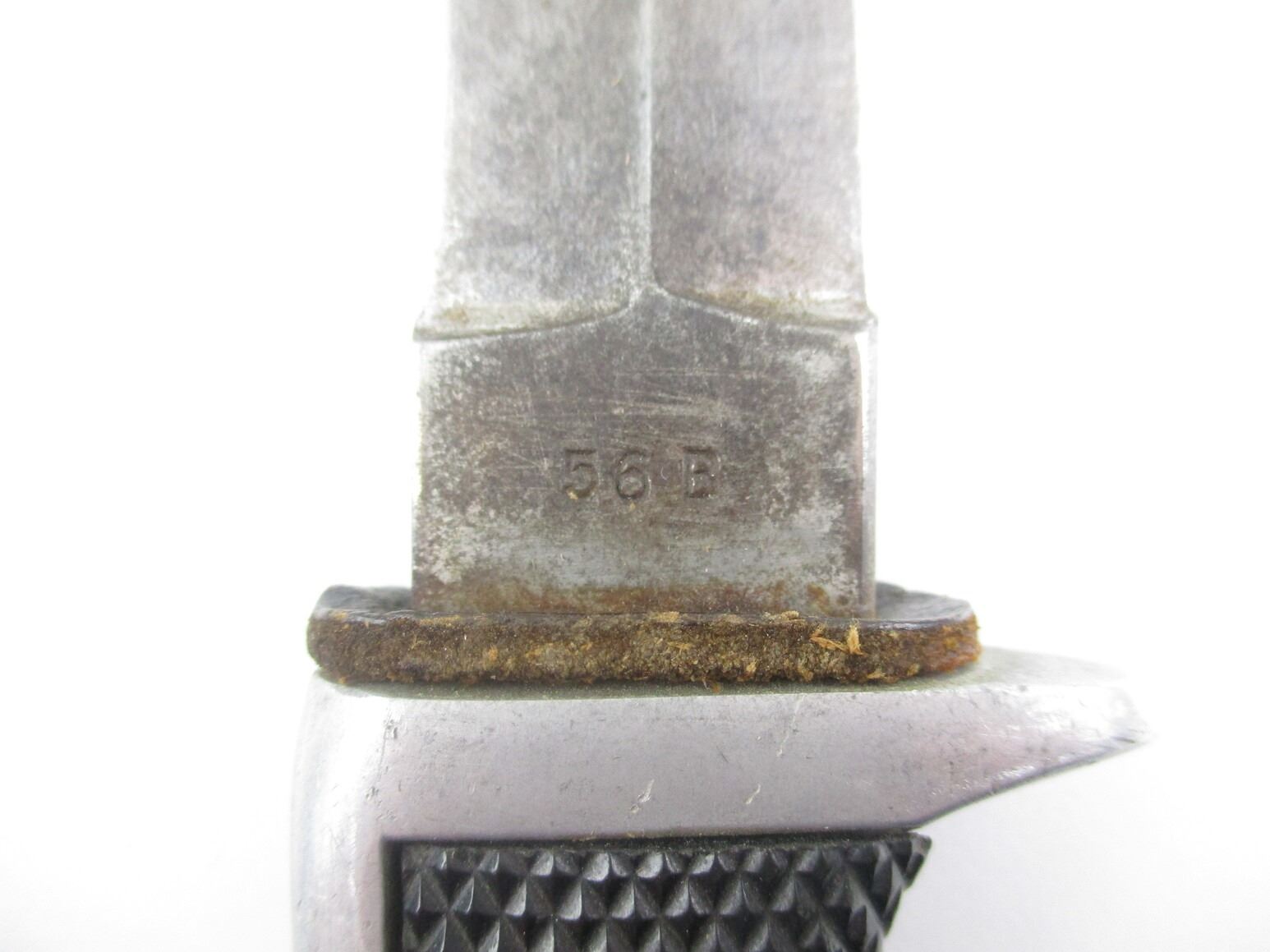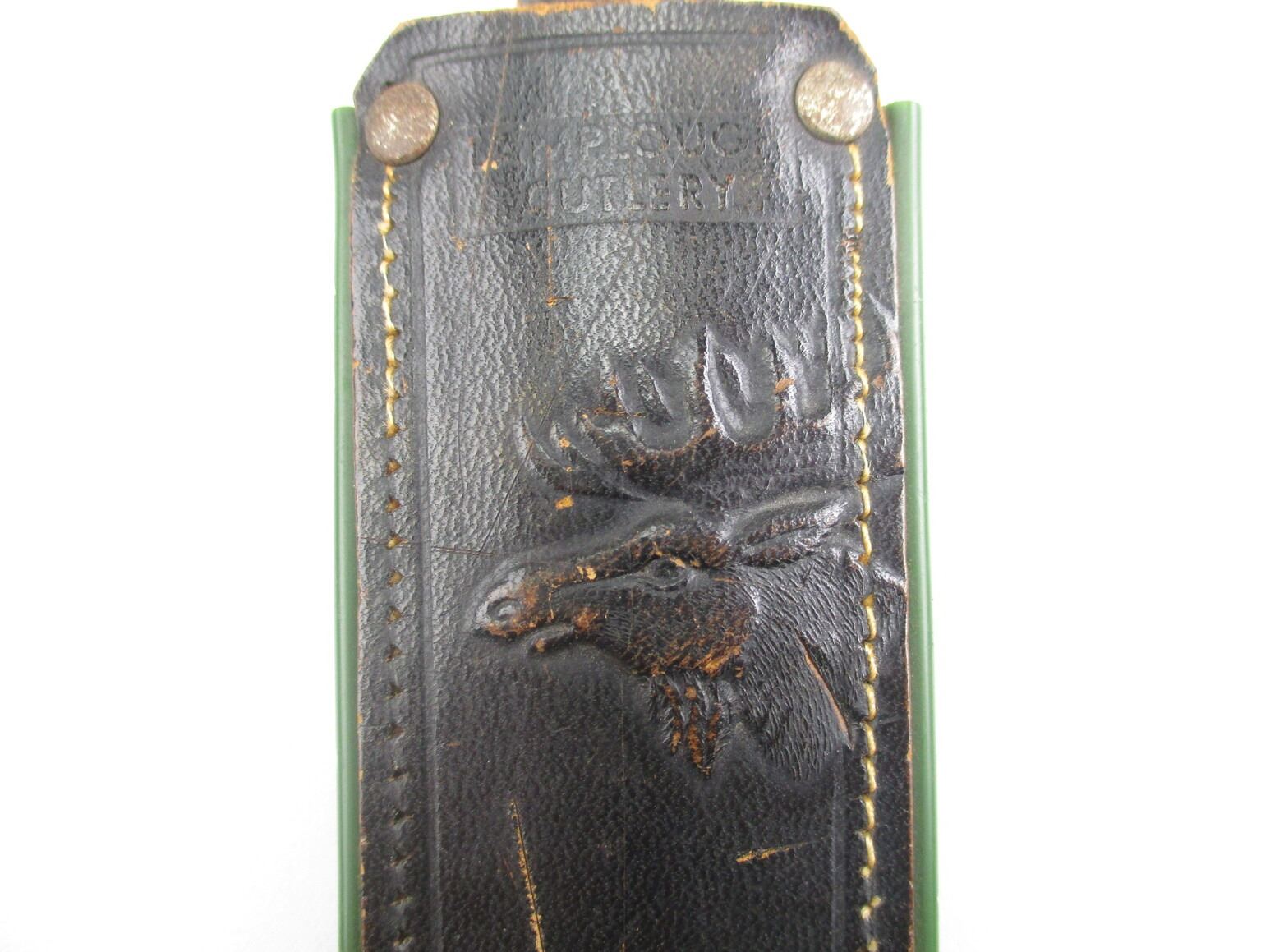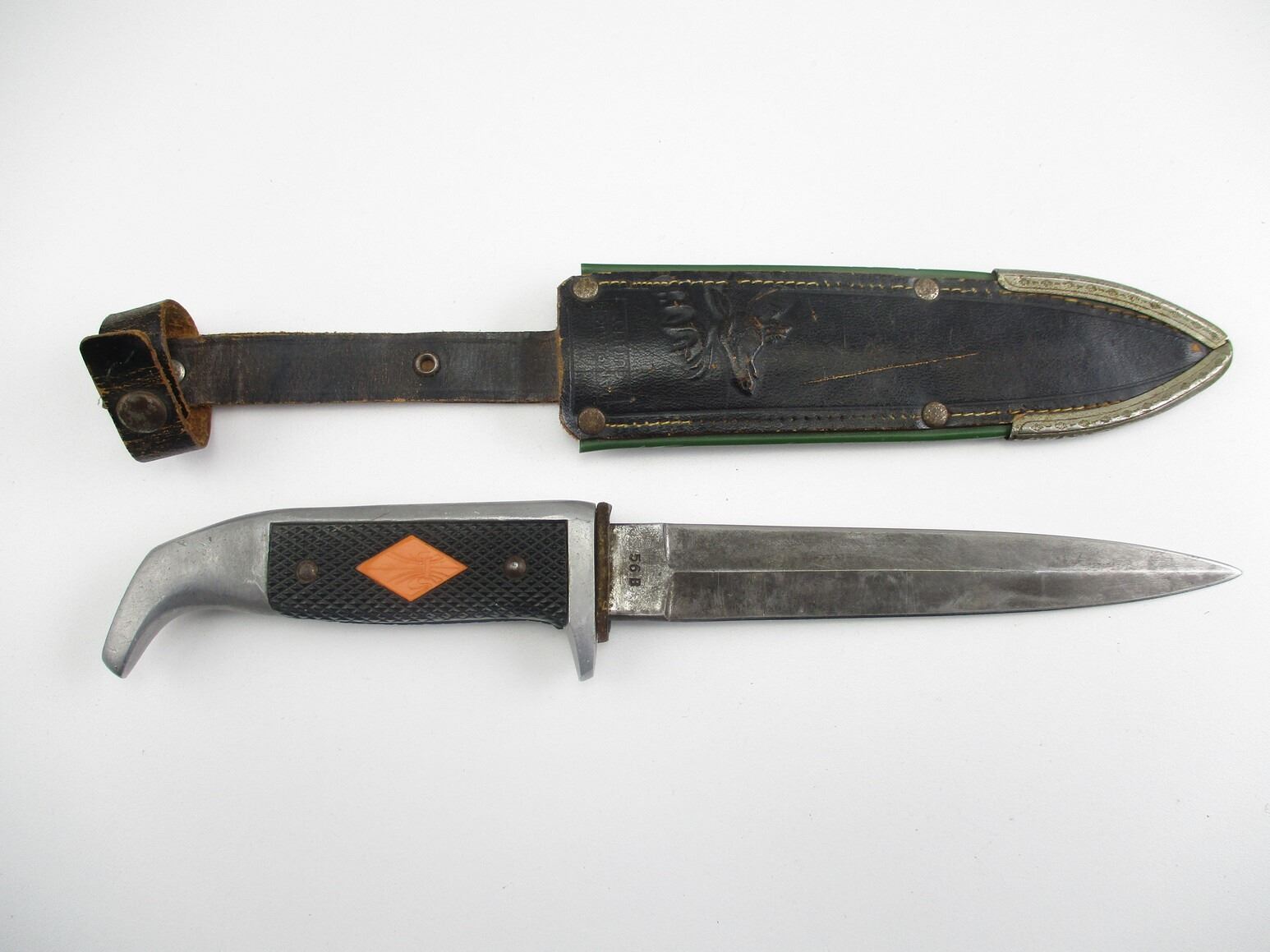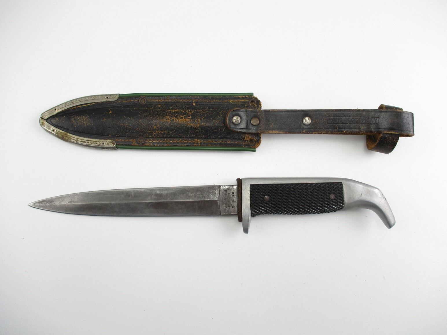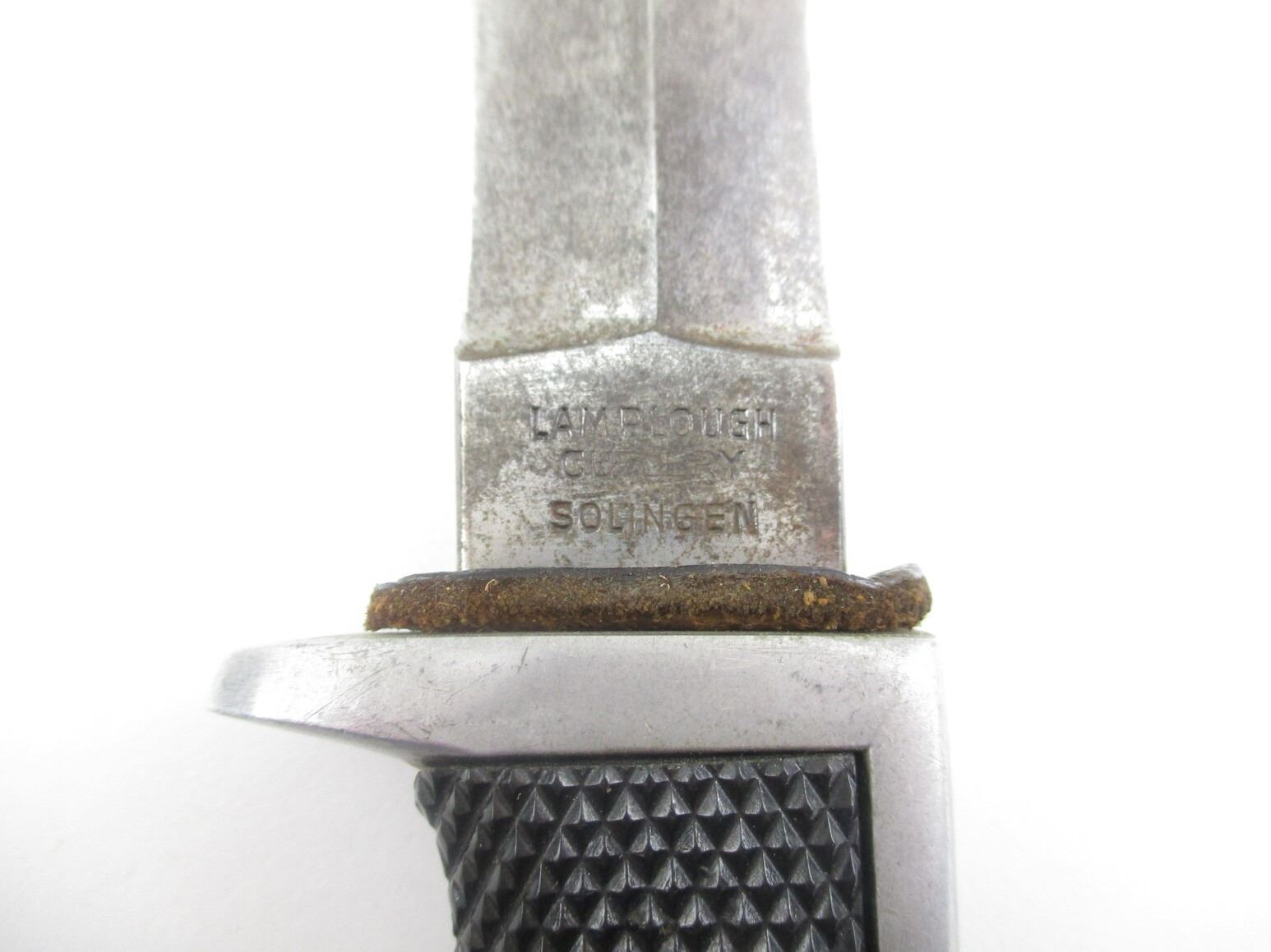 VINTAGE LAMPLOUGH BOY SCOUT TYPE DAGGER, (1) BLADE MARKED: "56 B", OTHER-SIDE MARKED: "LAMPLOUGH CUTLERY, SOLINGEN", NO QUILLON, ALLOY & BLACK CHECKERED GRIP, ALLOY POMMEL, LEATHER & METAL SCABBARD, BLADE APPROX. 6" & OAL APPROX. 10 3/8".