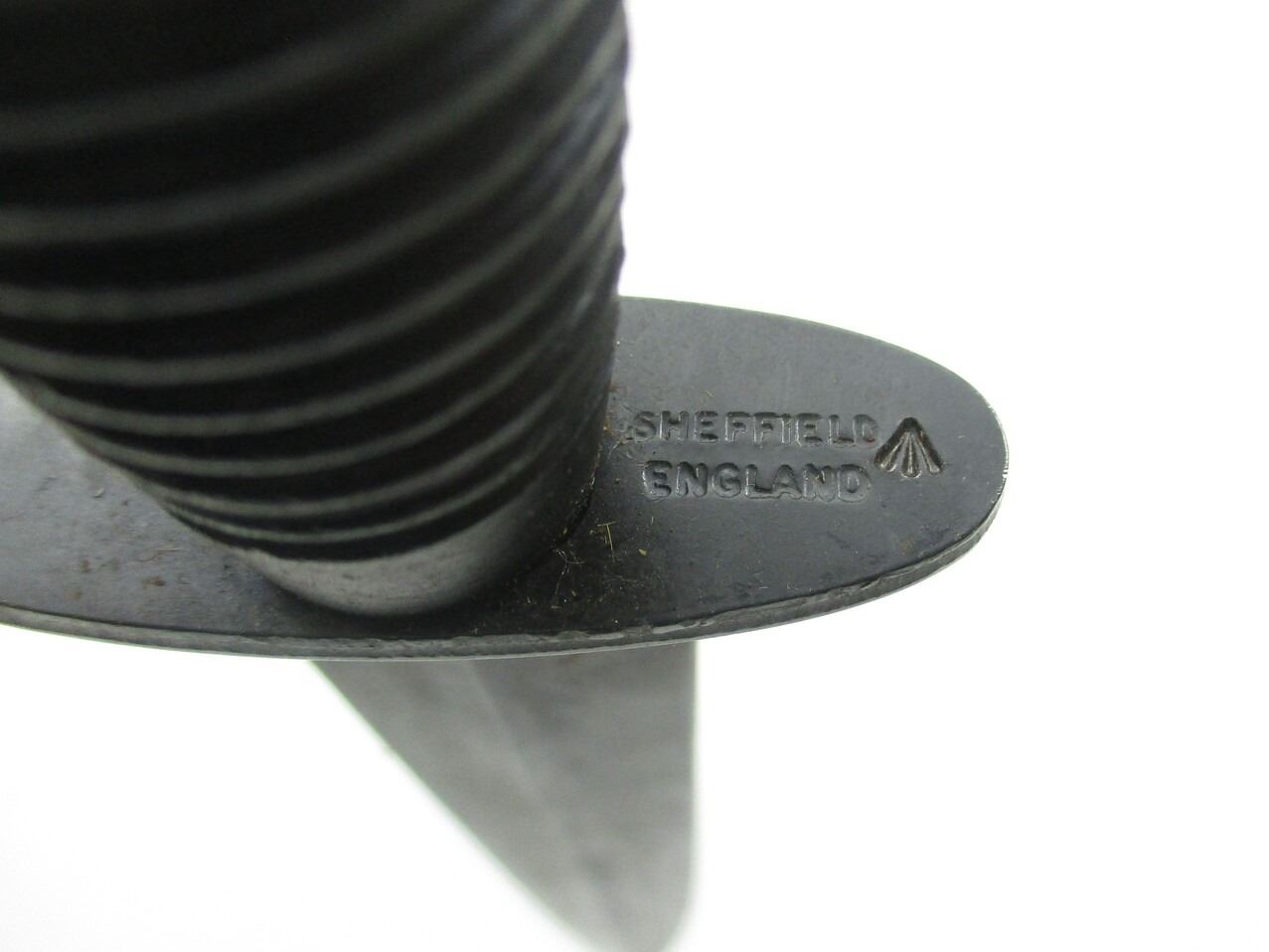 RARE FAIRBAIRN SYKES 3RD PATTERN DAGGER, (1) CROSS-PIECE MARKED: "SHEFFIELD, ENGLAND" & BROAD ARROW, BLACK RING ALLOY GRIP, METAL POMMEL, NO VISIBLE MARKINGS, BROWN LEATHER SCABBARD WITH STEEL CAP & BROWN LEATHER FROG, NO VISIBLE MARKINGS, BLADE APPROX. 6 7/8" & OAL APPROX. 11.5".