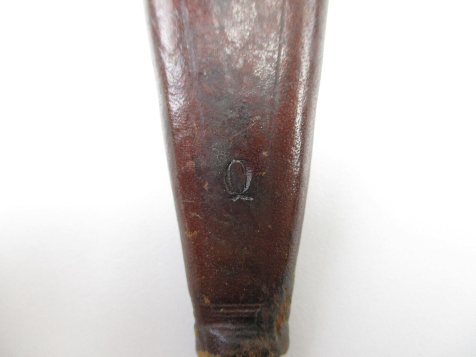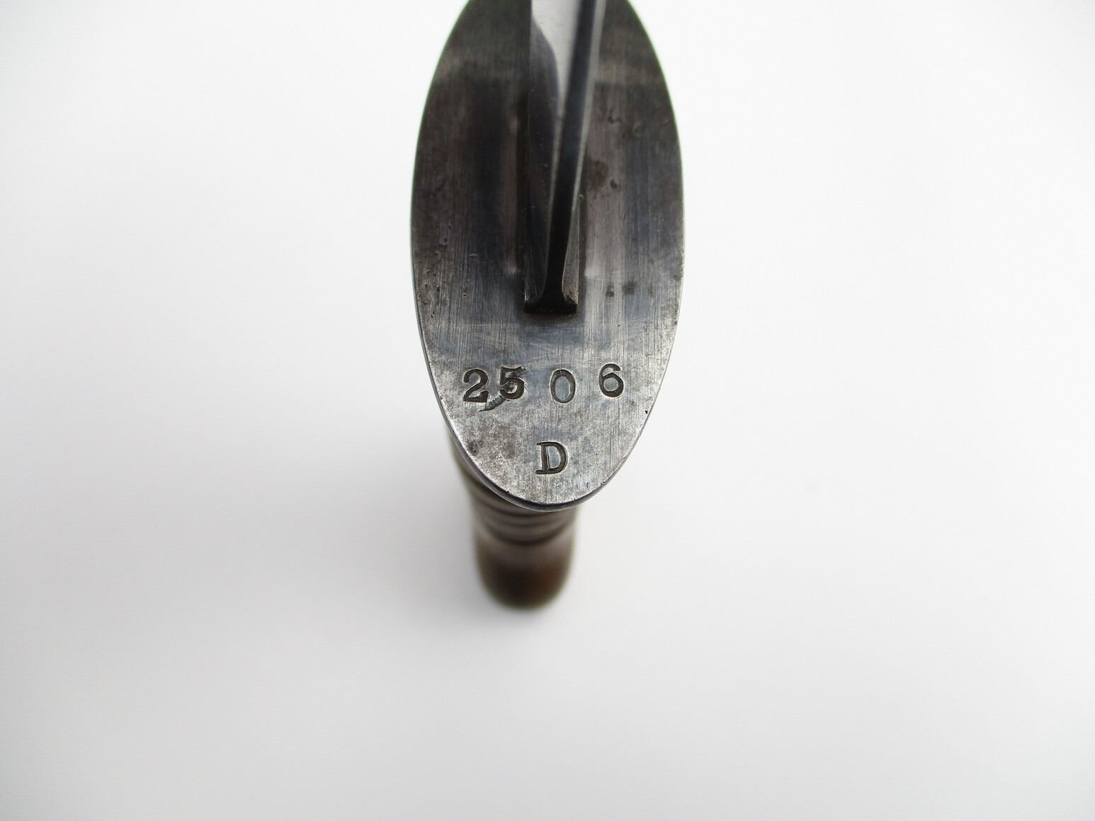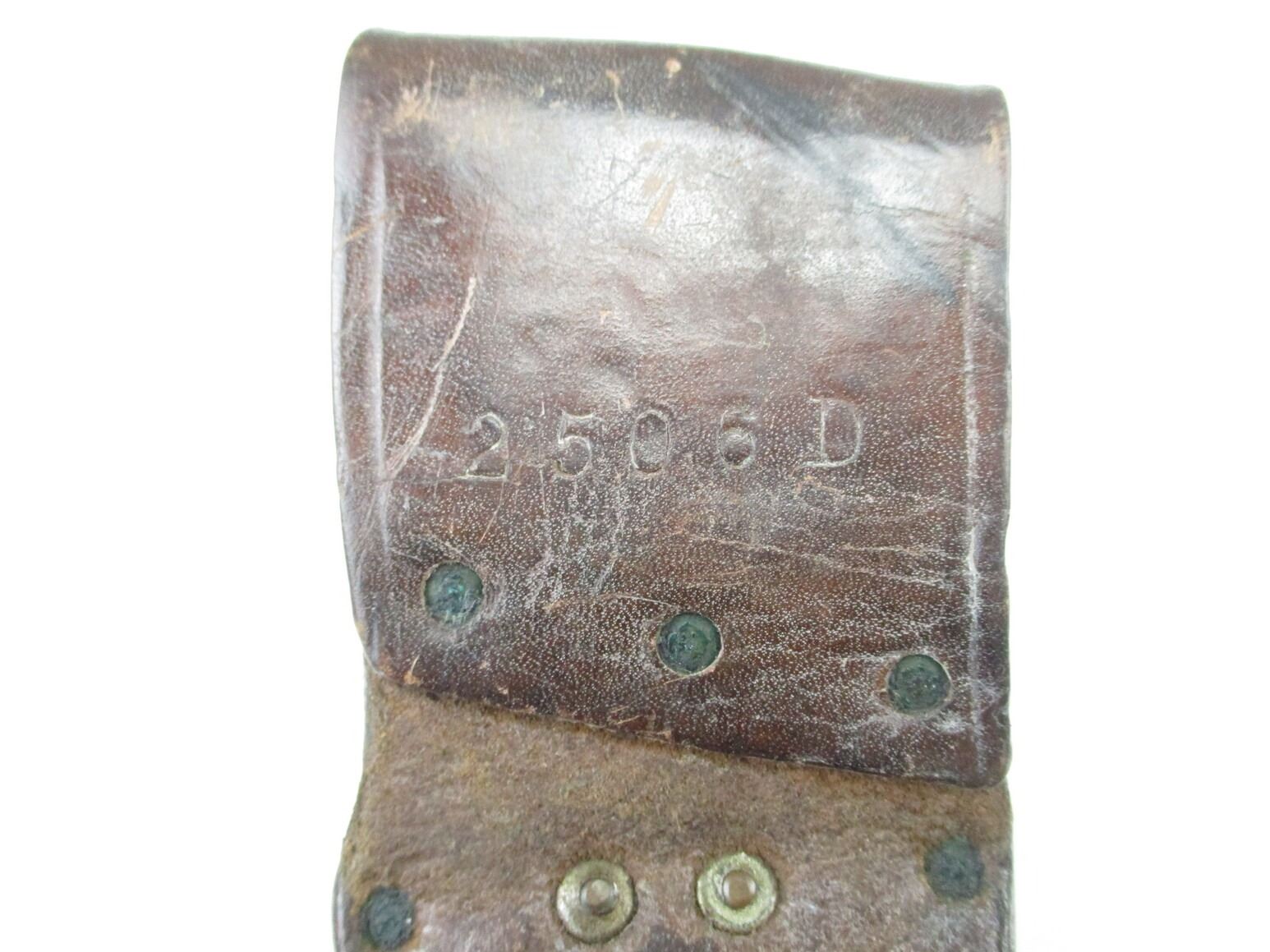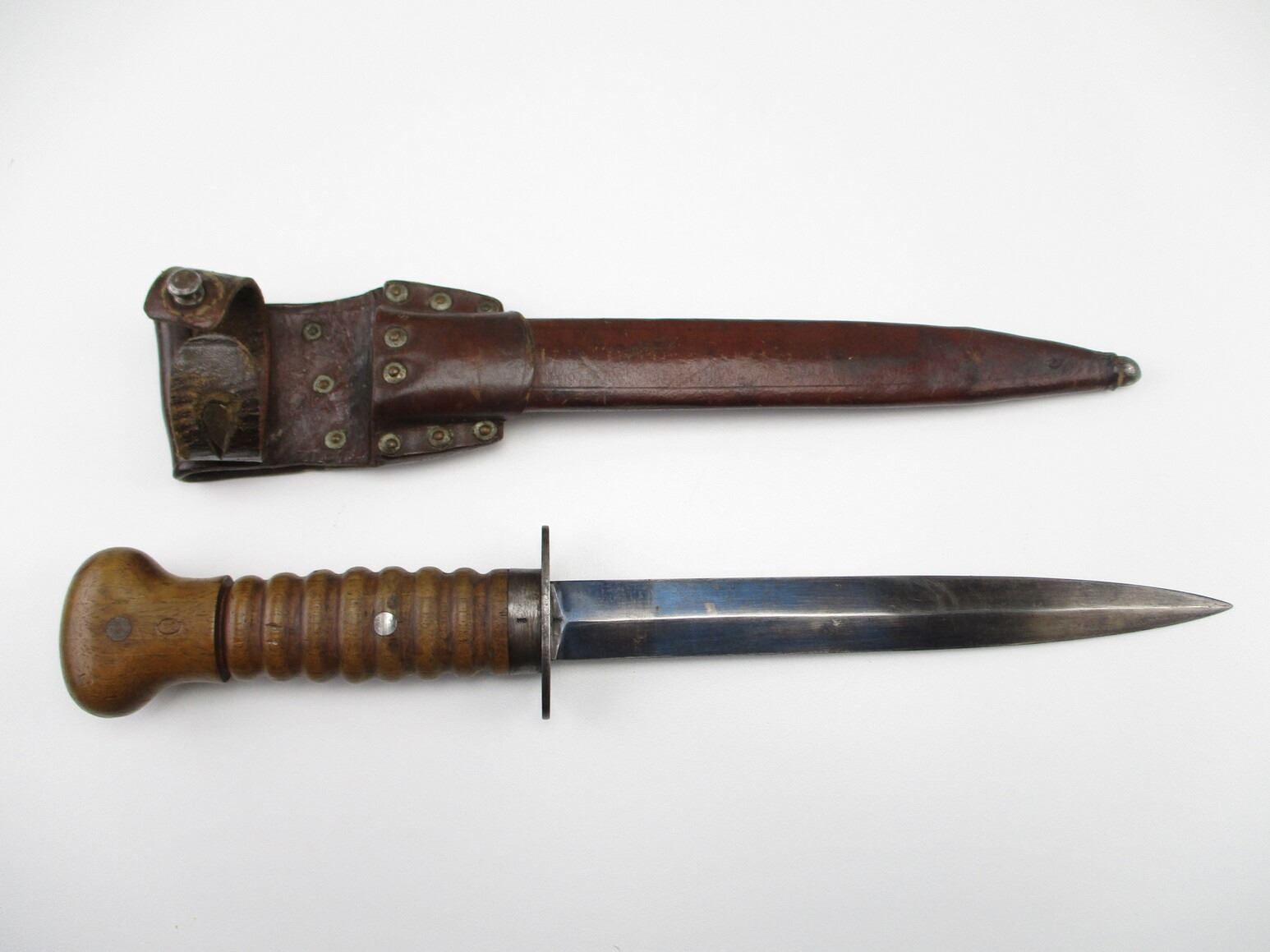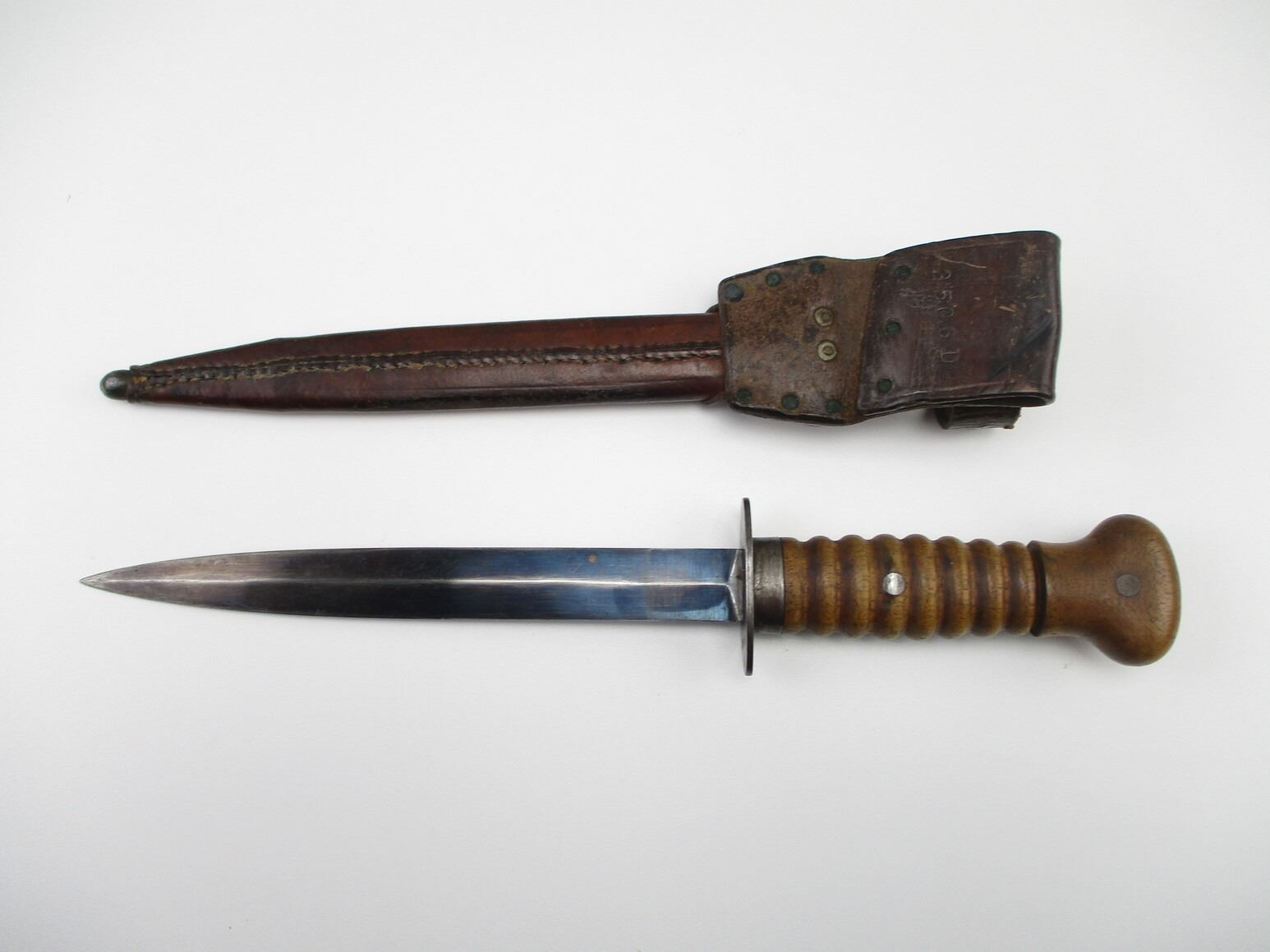 DUTCH 1915 TRENCH KNIFE, (1) WWI TO WWII 1940 ISSUED, AKA "STORMDELK", BLUED DOUBLE-EDGED BLADE, CROSS-PIECE MARKED: "2506 D", WOOD GRIP WITH EIGHT GROOVES MARKED: CROWN OVER "3", BROWN LEATHER SCABBARD WITH BELT LOOP & MATCHING NUMBERS, MARKED: "2506 D", BLADE APPROX. 8 1/8" & OAL APPROX 13.25".