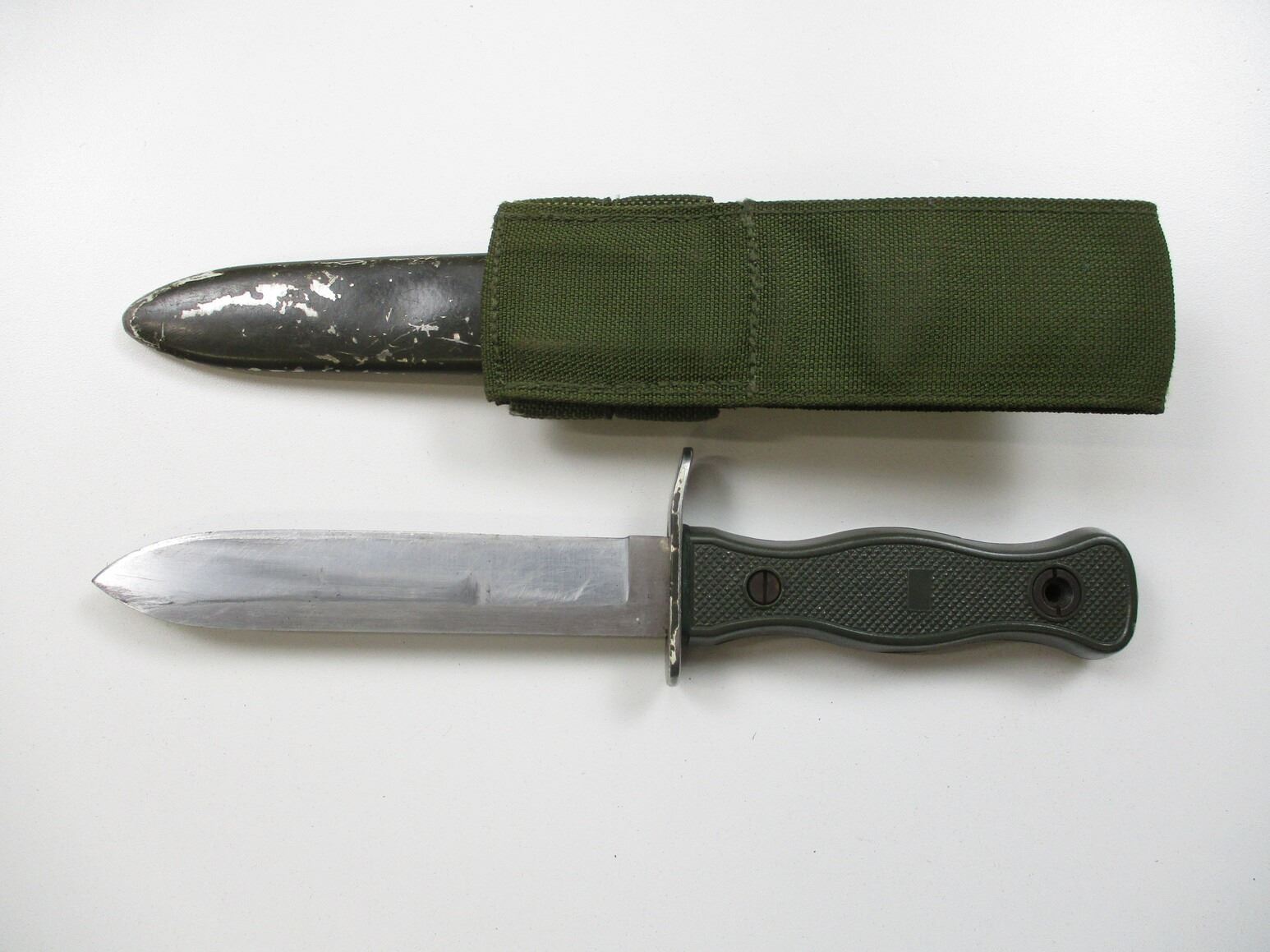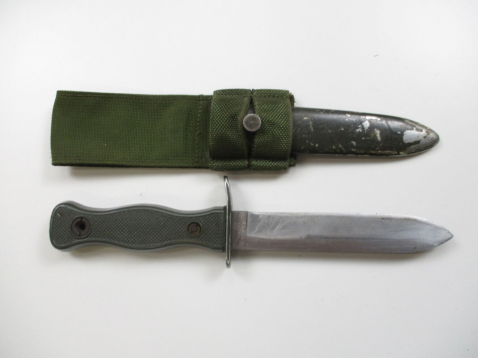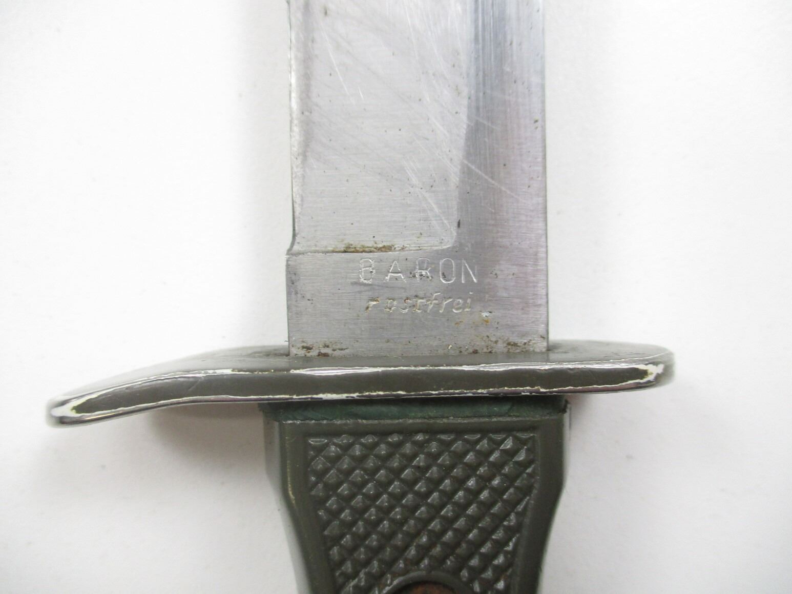 GERMAN BUNDESWEHR FIGHTING KNIFE, (1) BLADE MARKED: "BARON, ROSTFREI", 2-PIECE GREEN PLASTIC GRIP, METAL SCABBARD, NO VISIBLE MARKINGS, GREEN CANADIAN MILITARY NYLON FROG, NO VISIBLE MARKINGS, BLADE APPROX. 5.75" & OAL APPROX. 10.25".