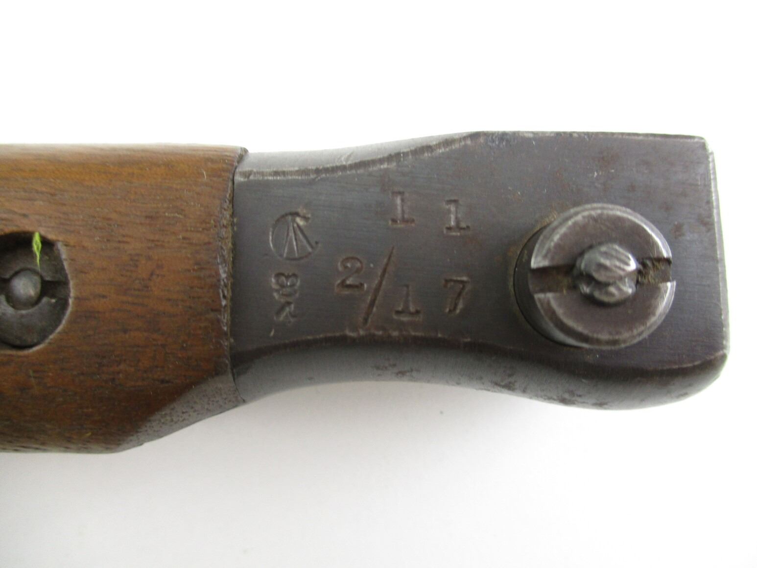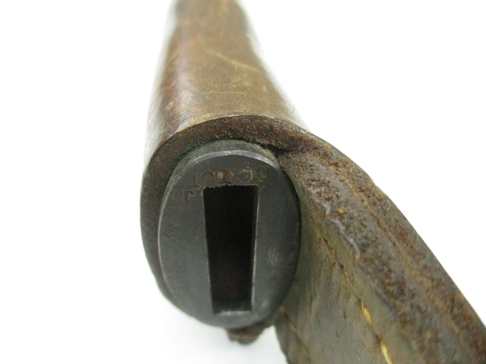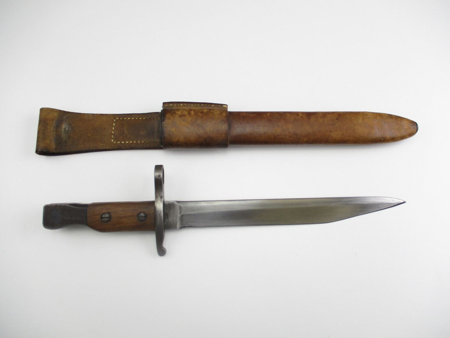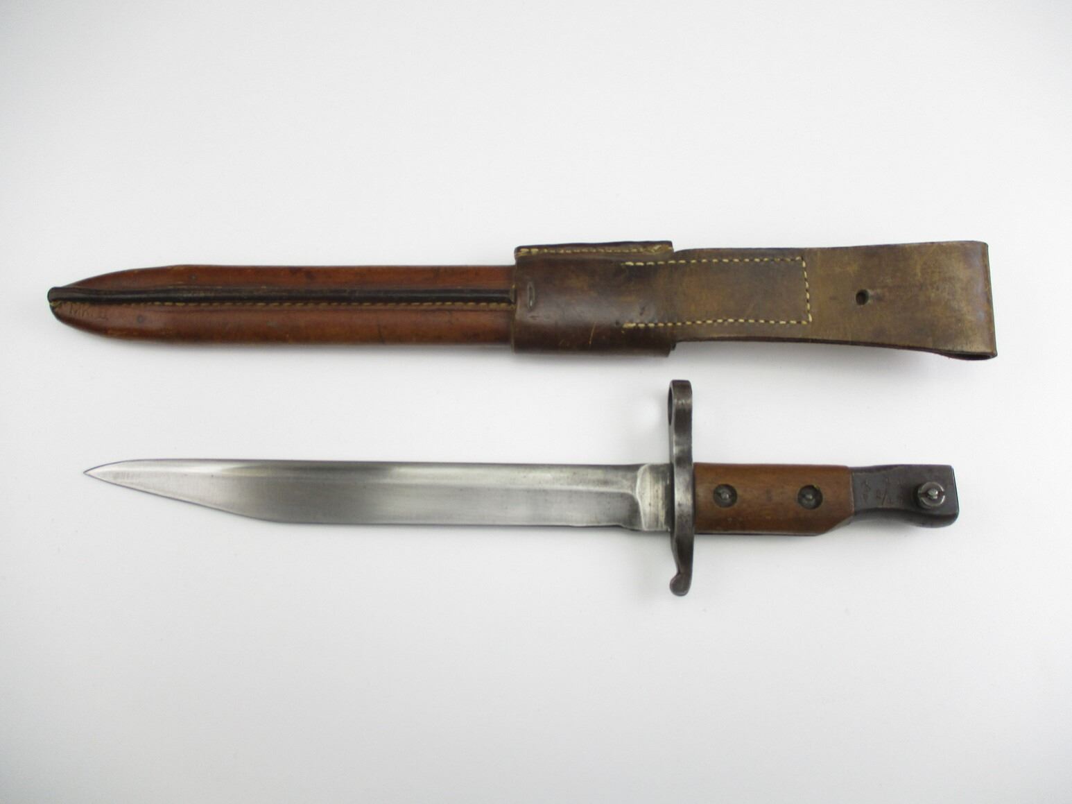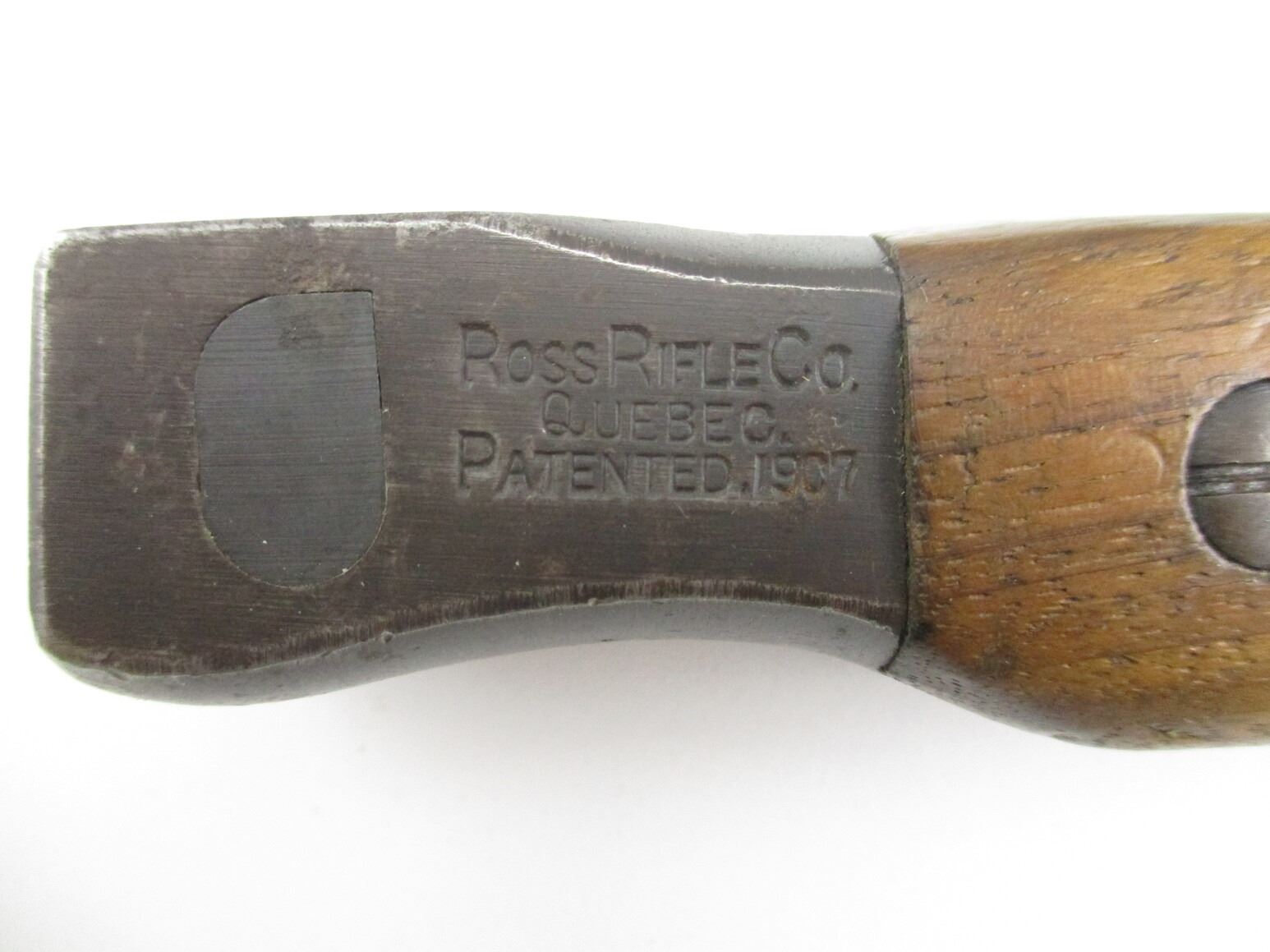 WWI CANADIAN ROSS RIFLE 1905 PATTERN MKI BAYONET, (1) FITS 1910 MK III RIFLES, ARMOURER MODIFIED BLADE, 2-PIECE WOOD GRIP, METAL POMMEL, MARKED: "11", "2/17", "T 10100", "ROSS RIFLE CO., QUEBEC, PATENTED 1907" & C-BROAD ARROW, METAL & BROWN LEATHER SCABBARD WITH BELT LOOP ATTACHED, MARKED: "X", "MK II" & C-BROAD ARROW, METAL THROAT MARKED: "T 10100", BLADE APPROX. 10.25" & OAL APPROX. 14 5/8".