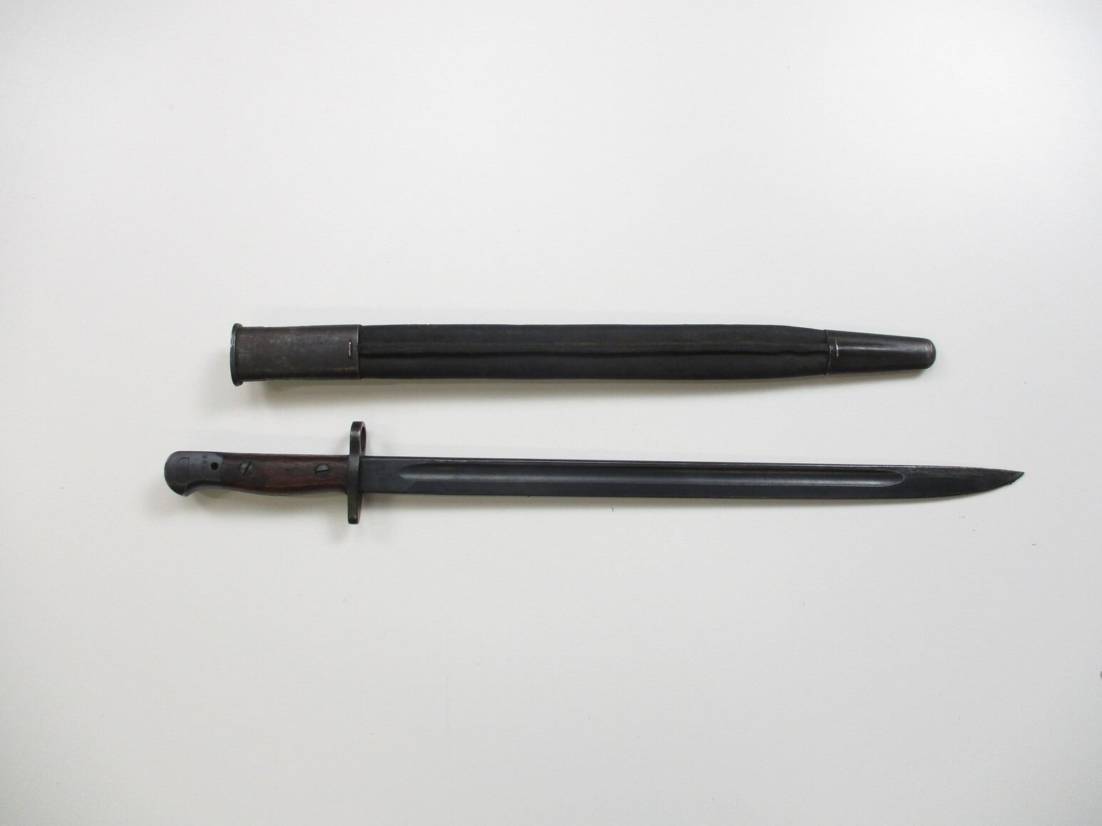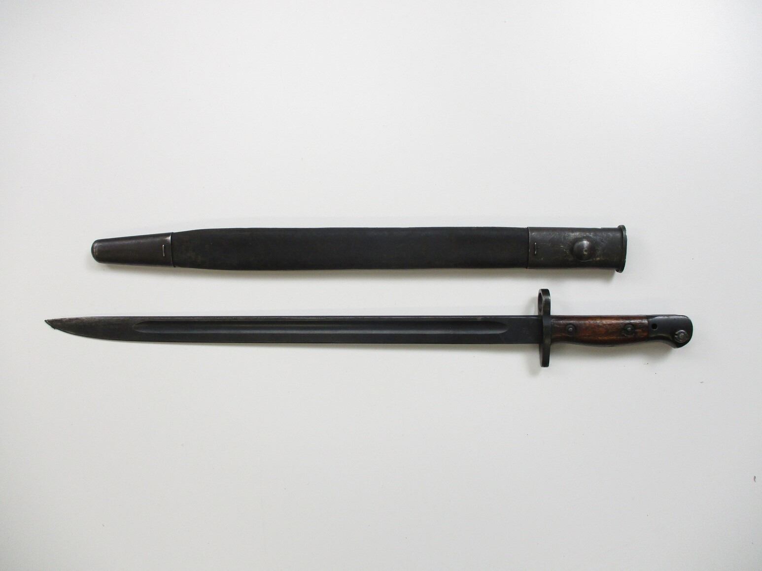 AUSTRALIAN 1907 PATTERN BAYONET, (1) FITS .303 CALIBER SHORT MAGAZINE LEE-ENFIELD NO. I MK.III (SMLE) RIFLE, RICASSO MARKED: "MA" OVER "1907", "3 '28" OVER "LITHGOW", OPPOSITE SIDE MARKED: "X (BEND TEST)", "MA", OTHER PROOF MARKS & BROAD ARROW, 2-PIECE WOOD GRIP, METAL IN-BETWEEN WOOD MARKED WITH CROWN, METAL POMMEL MARKED: "16533" & PROOF MARK, LEATHER & METAL SCABBARD WITH PROOF MARK, BLADE APPROX. 17" & OAL APPROX. 21 5/8".