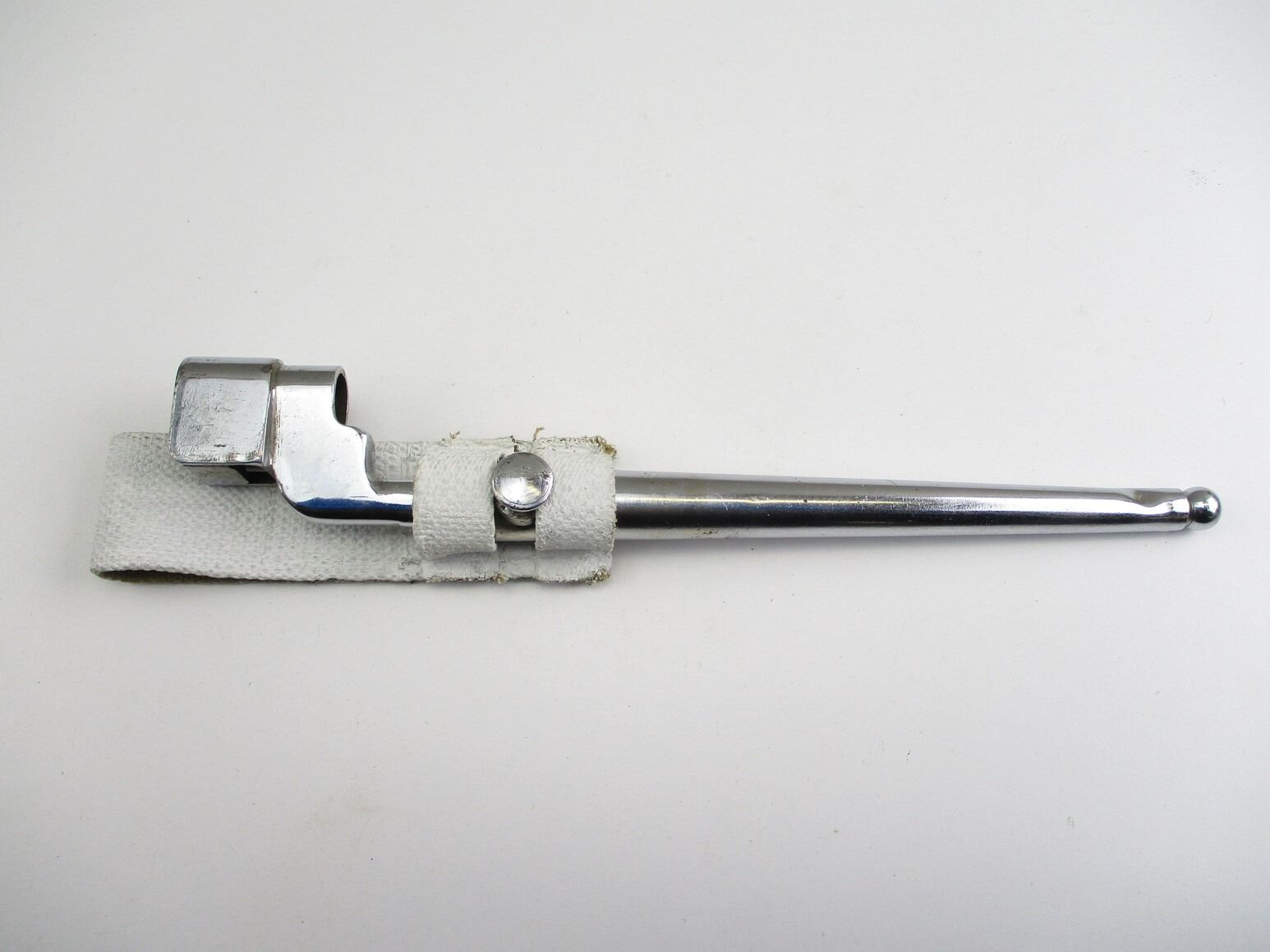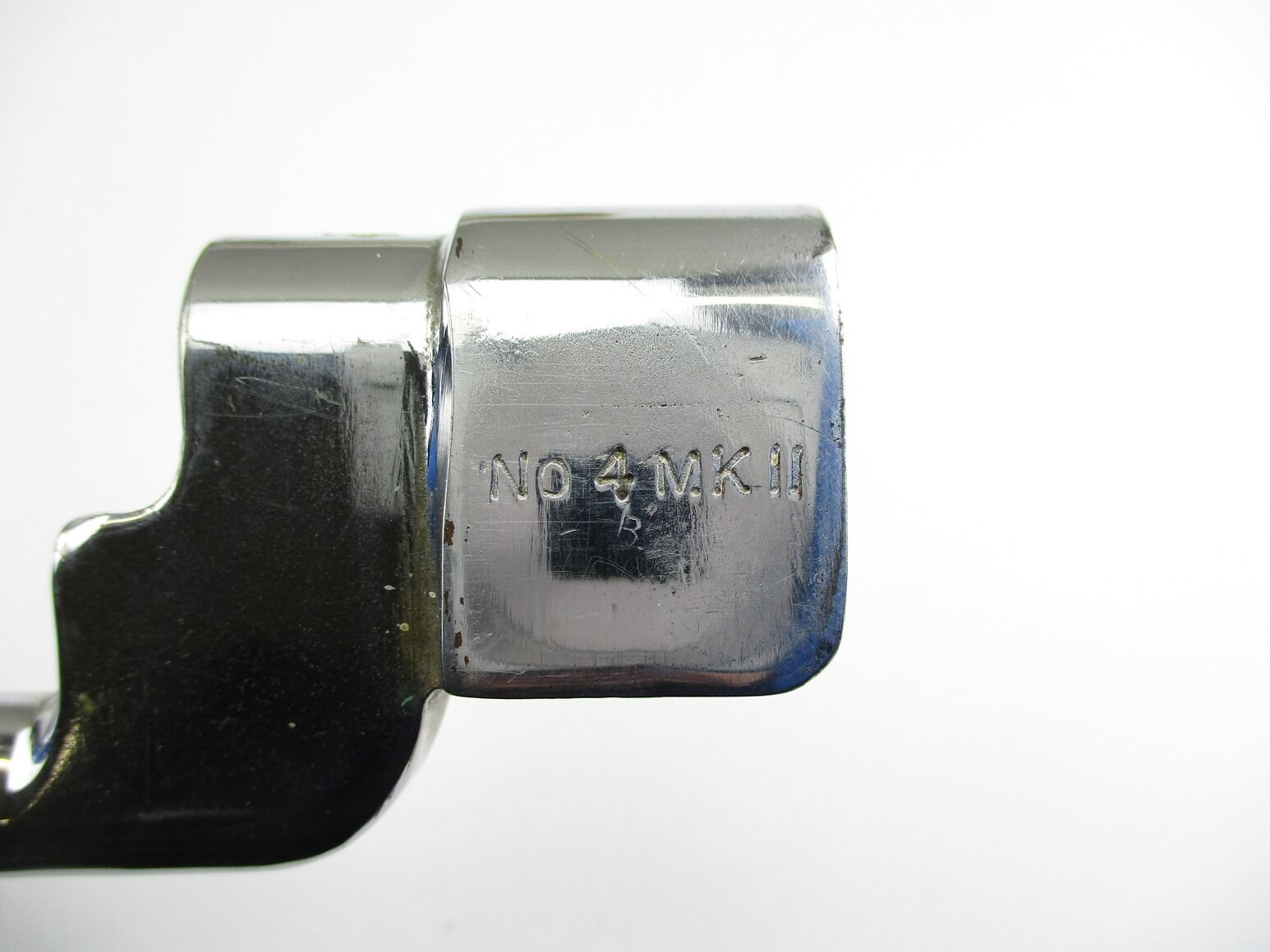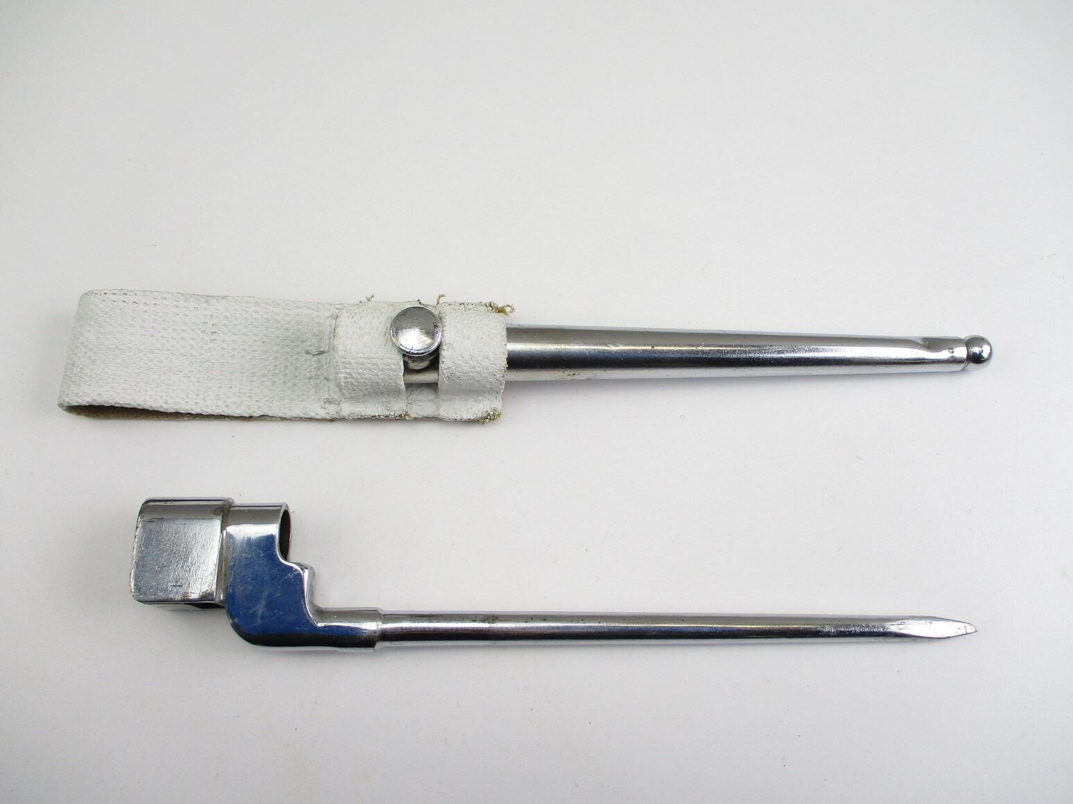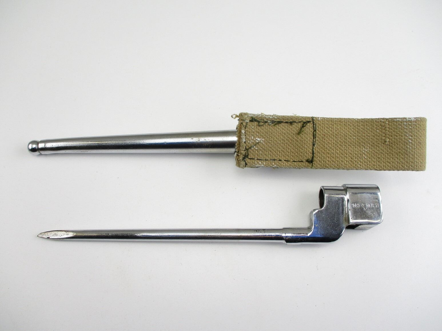 CANADIAN LEE ENFIELD NO.4 MKII PARADE SOCKET BAYONET, (1) CHROMED SOCKET MARKED: "NO4 MKII" & "LB (LONG BRANCH)", CHROMED METAL SCABBARD MARKED: "NO.4 MKI S286" & MAKER'S MARK, WHITE-PAINTED FROG, NO VISIBLE MARKINGS, BLADE APPROX. 7.75" & OAL APPROX. 9.75". SEE PHOTOS.