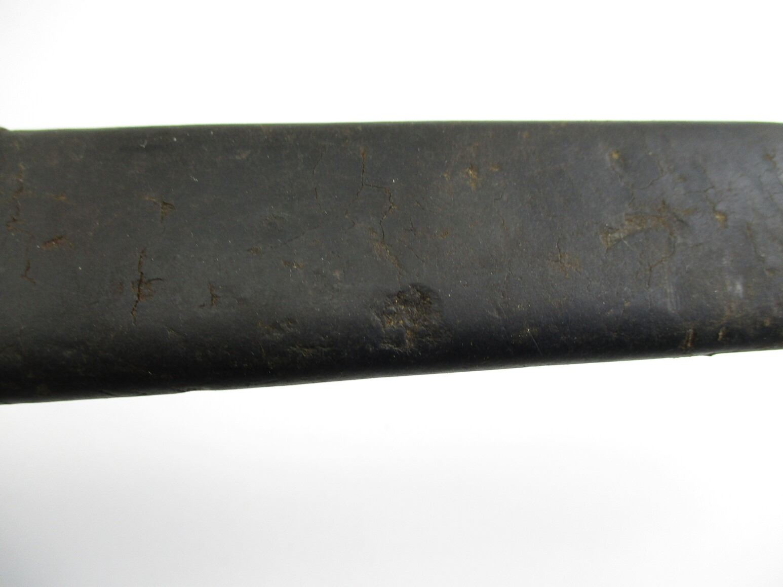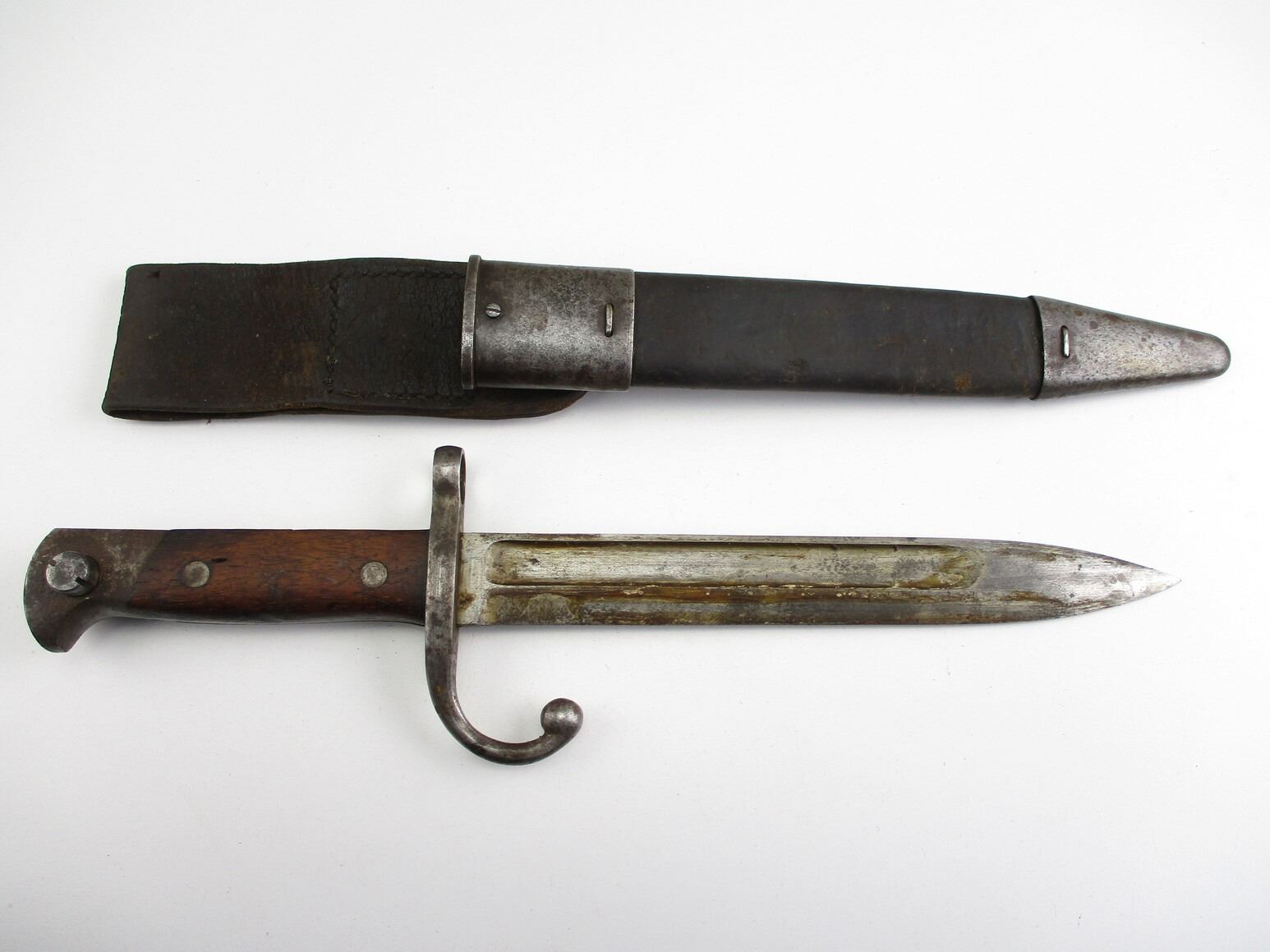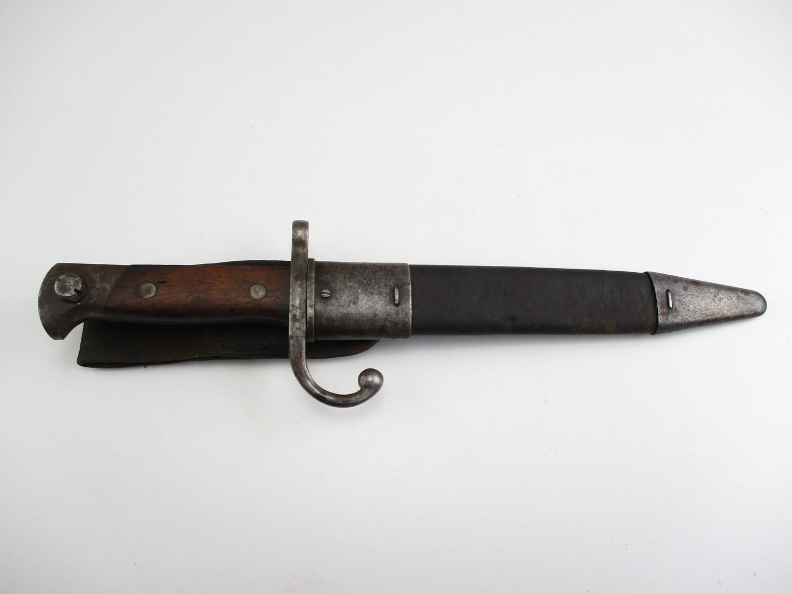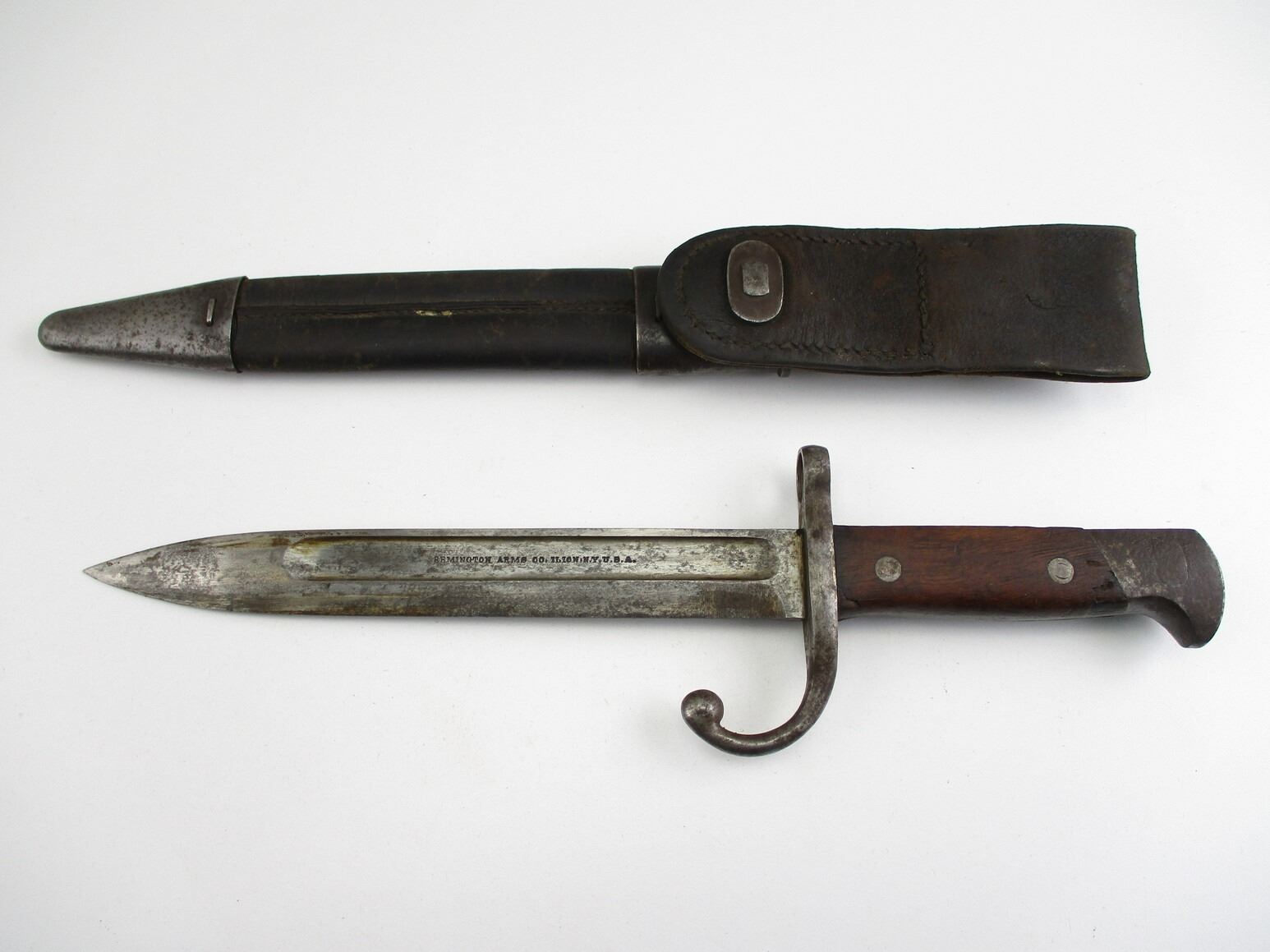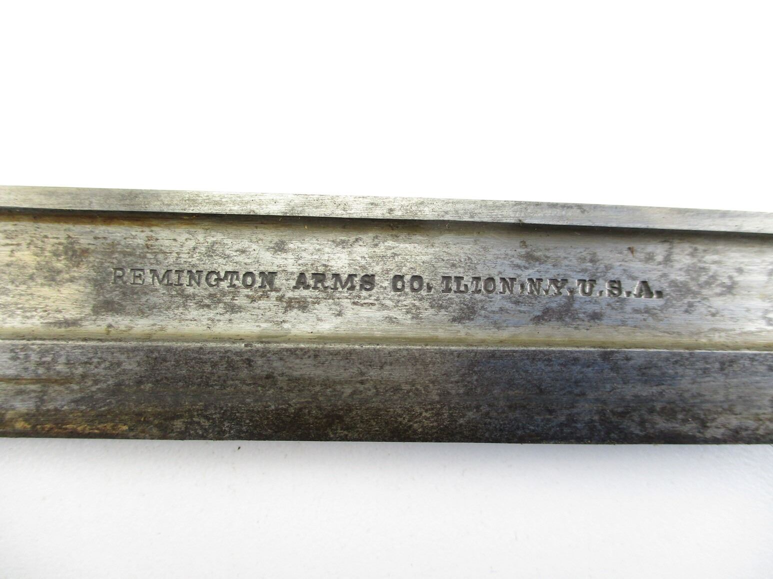 REMINGTON (ROLLING BLOCK) NO. 5 SHORT EXPORT BAYONET, (1) FITS 7MM REMINGTON NO. 5 ROLLING BLOCK RIFLES, BLADE MARKED: "REMINGTON ARMS CO. ILION, NY. U.S.A.", 2-PIECE WOOD GRIP, METAL POMMEL, NO VISIBLE MARKINGS, LEATHER & METAL SCABBARD WITH BROWN LEATHER FROG, NO VISIBLE MARKINGS, BLADE APPROX. 8.25" & OAL APPROX. 12.75".
