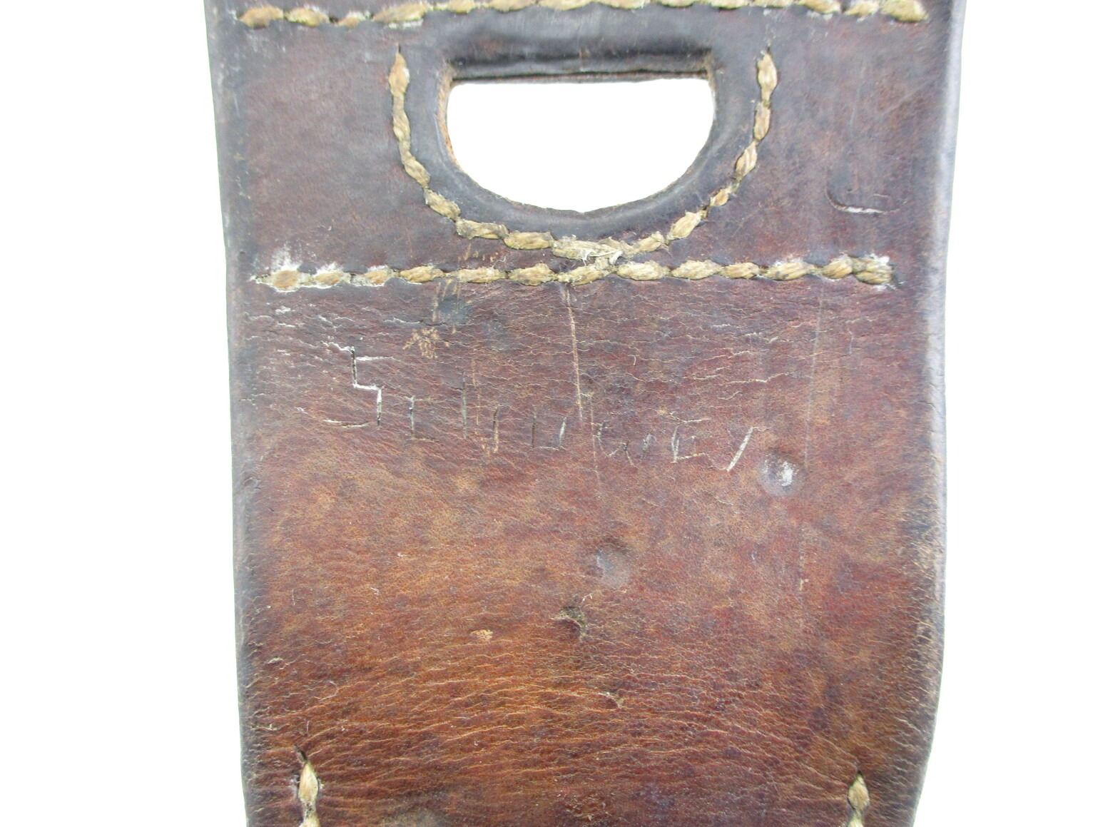 SWISS M1918 DOUBLE-EDGED DAGGER BAYONET, (1) FITS 7.5MM SCHMIDT-RUBIN M1911 CARBINE & M1931 SHORT RIFLES (K31), RICASSO MARKED: "WAFFENFABRIK NEUHAUSEN", CROSS-PIECE MARKED: "56", SWISS CROSS & "579281", 2-PIECE WOOD GRIP, METAL POMMEL, NO VISIBLE MARKINGS, METAL SCABBARD MARKED: "P" & SWISS CROSS, BROWN LEATHER FROG MARKED: "63" & OTHER FAINT / UN-CLEAR MARKINGS, BLADE APPROX. 11.75" & OAL APPROX. 16.75".