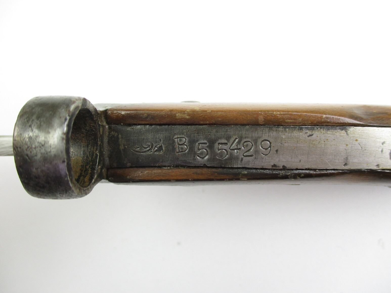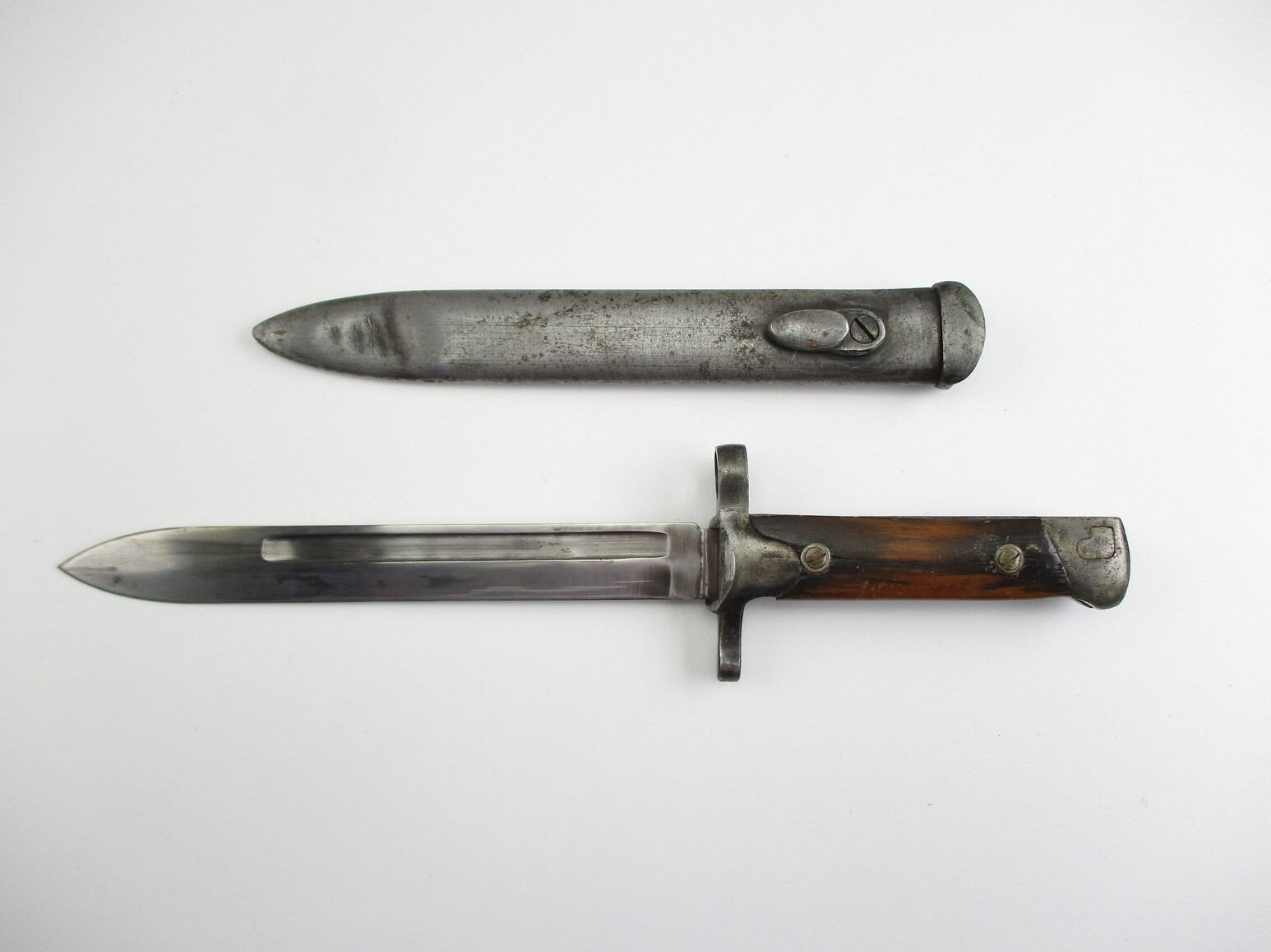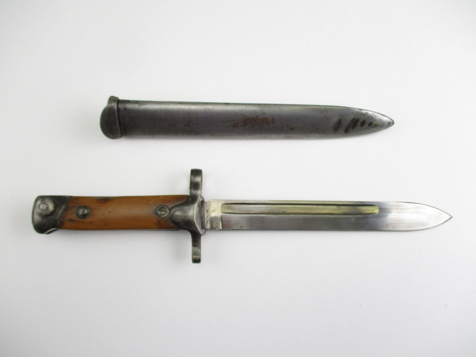 WWII ITALIAN M1938 CARCANO KNIFE-BAYONET, (1) FITS 6.5MM & 7.35MM M1938 MANNLICHER-CARCANO SHORT RIFLES, FIXED BLADE, 2-PIECE WOOD GRIP, METAL IN-BETWEEN WOOD MARKED: "B55429" & FAINT / UN-CLEAR MAKER'S MARK, METAL POMMEL, NO VISIBLE MARKINGS, METAL SCABBARD, NO VISIBLE MARKINGS, BLADE APPROX. 7", OAL APPROX. 11 3/8".