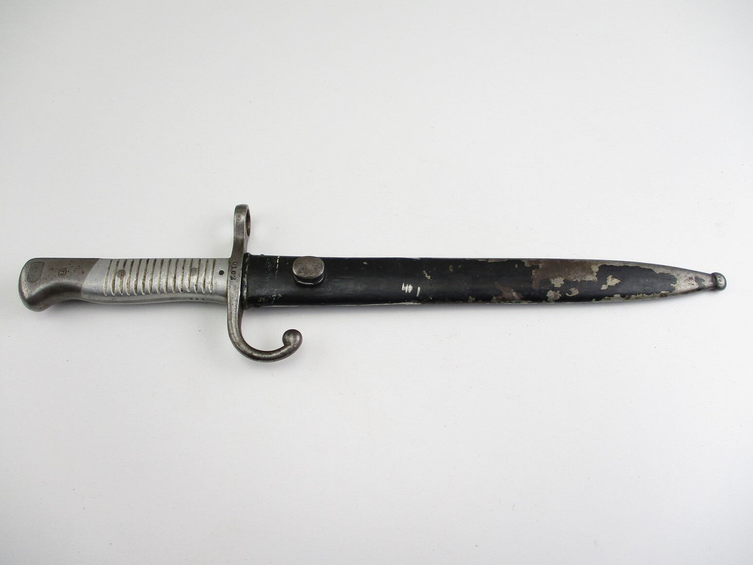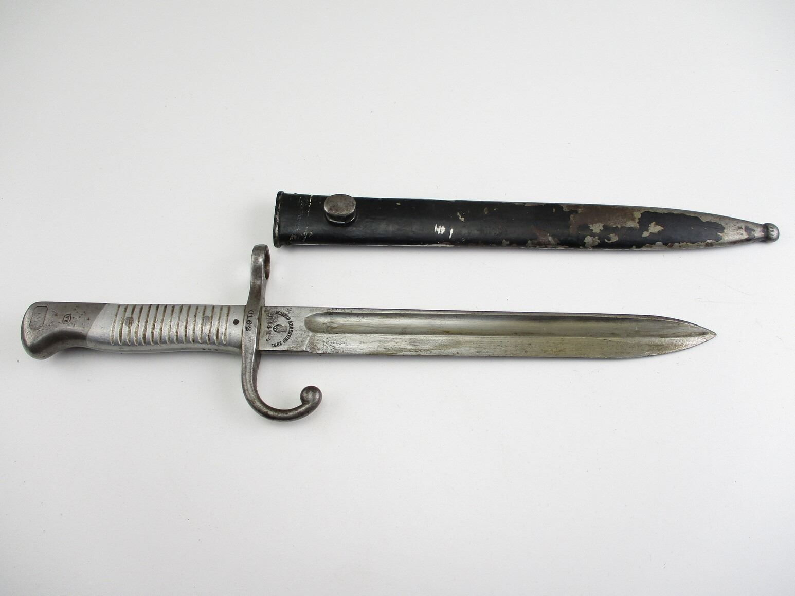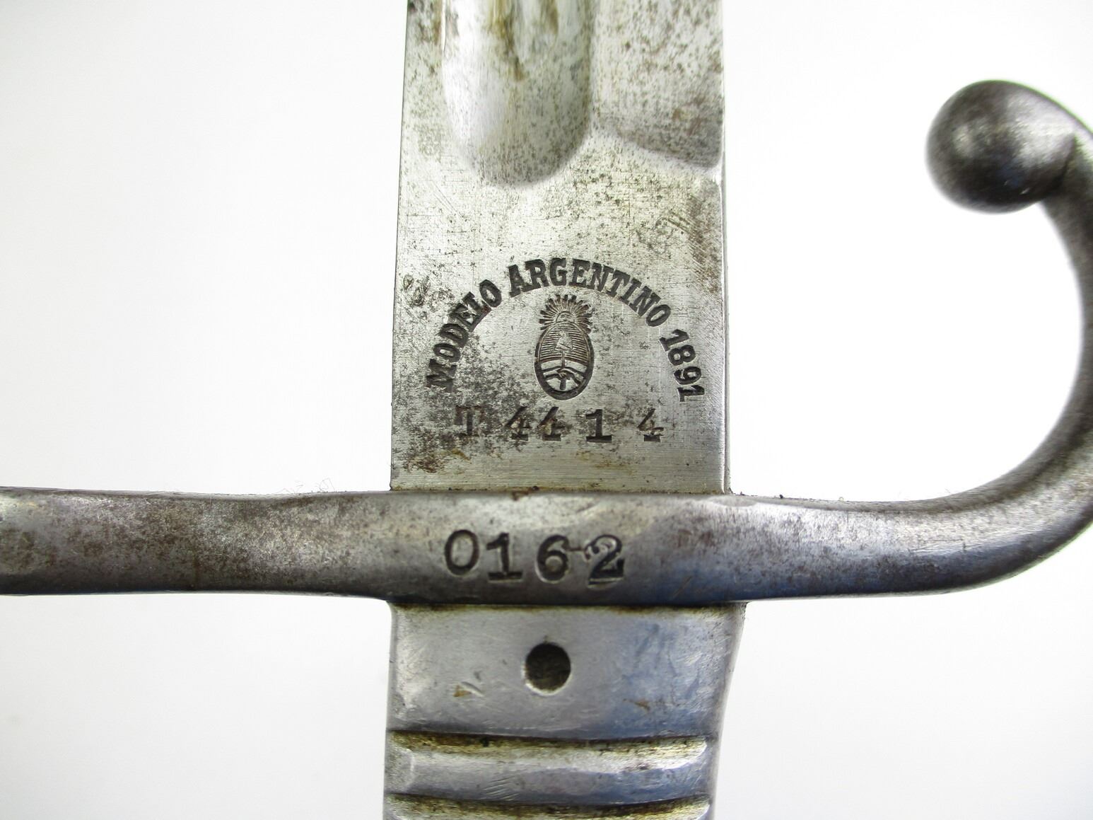 ARGENTINE M1891 SHORTENED BAYONET, (1) FITS 7.65MM ARGENTINE M1891 MAUSER RIFLES, RICASSO MARKED: "MODELO ARGENTINO 1891" OVER PROOF MARK OVER "T4414", OTHER-SIDE MARKED: "WEYERSBERG, KIRSCHBAUM & CO., SOLINGEN", CROSS-PIECE MARKED: "0162" & "R", METAL GRIP & POMMEL, POMMEL MARKED: "0162", BLACK PAINTED METAL SCABBARD MARKED: "RA" IN A CIRCLE, BLADE APPROX. 9.5" & OAL APPROX. 14.25".