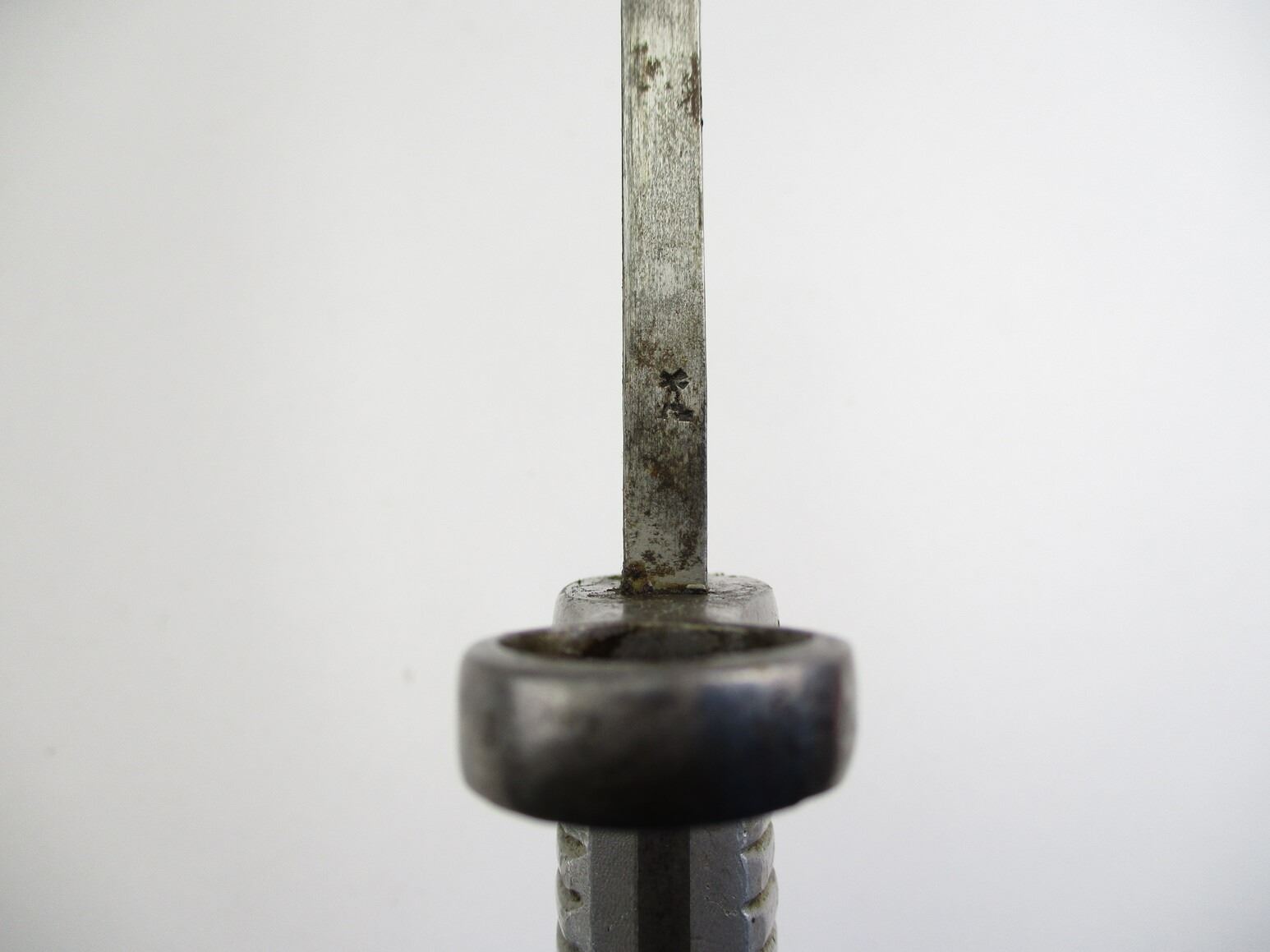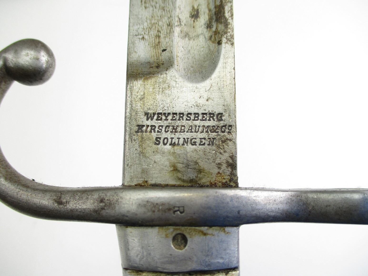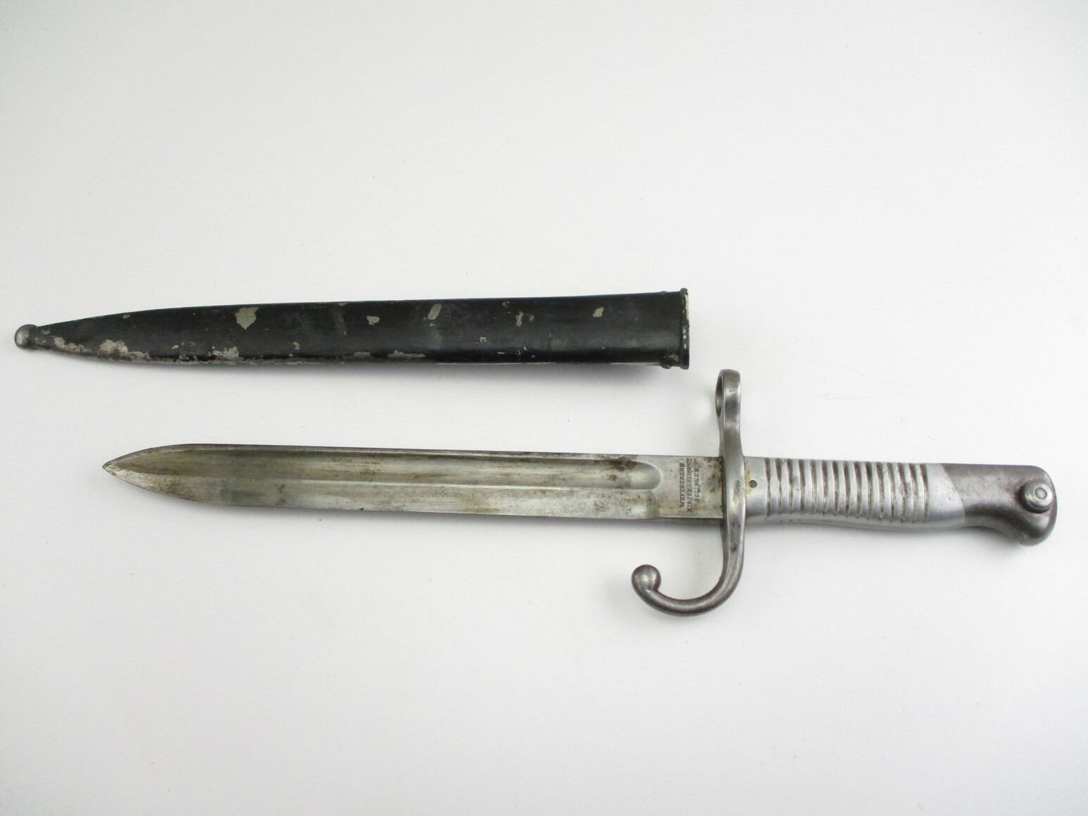 ARGENTINE M1891 SHORTENED BAYONET, (1) FITS 7.65MM ARGENTINE M1891 MAUSER RIFLES, RICASSO MARKED: "MODELO ARGENTINO 1891" OVER PROOF MARK OVER "T4414", OTHER-SIDE MARKED: "WEYERSBERG, KIRSCHBAUM & CO., SOLINGEN", CROSS-PIECE MARKED: "0162" & "R", METAL GRIP & POMMEL, POMMEL MARKED: "0162", BLACK PAINTED METAL SCABBARD MARKED: "RA" IN A CIRCLE, BLADE APPROX. 9.5" & OAL APPROX. 14.25".