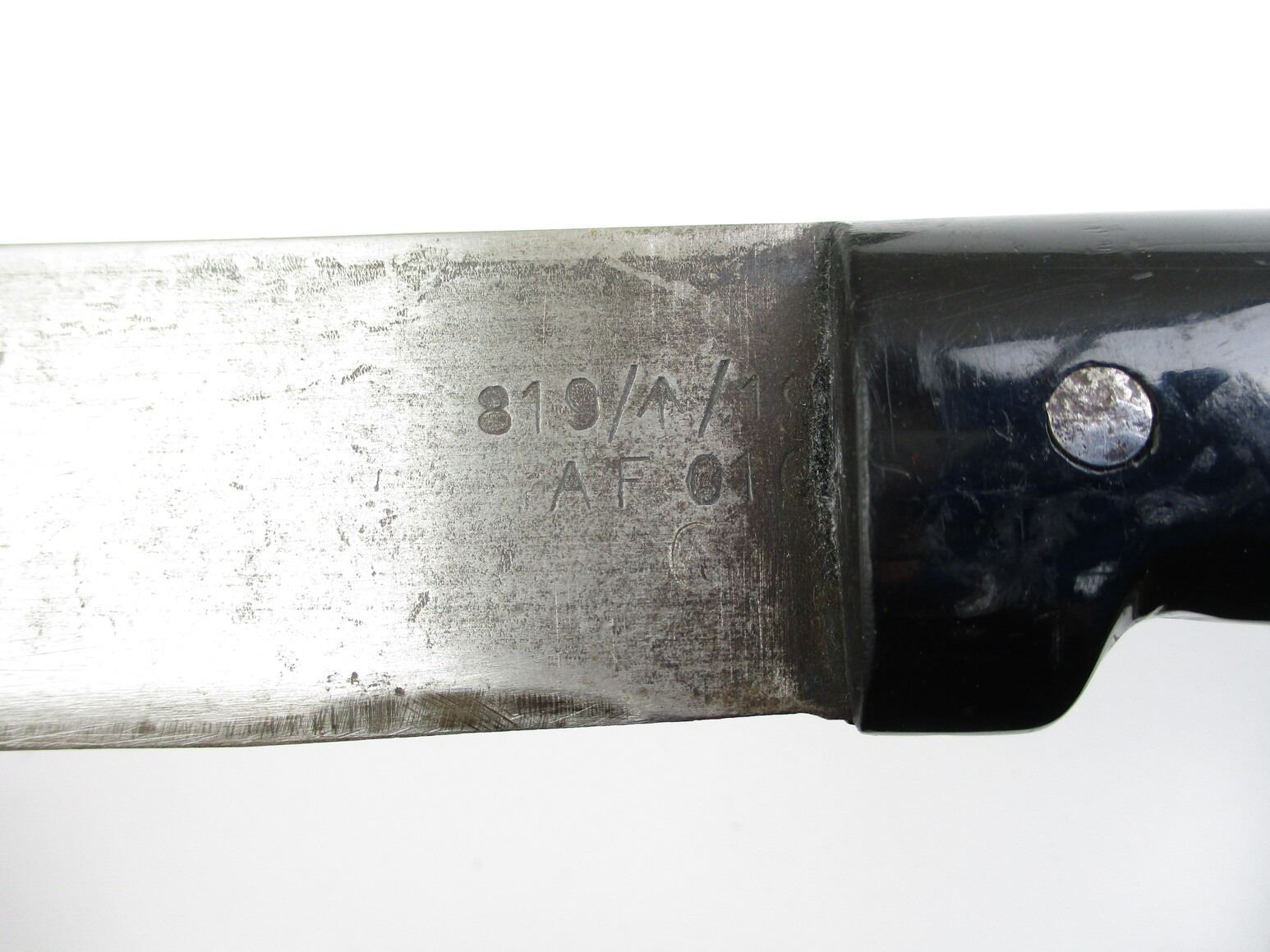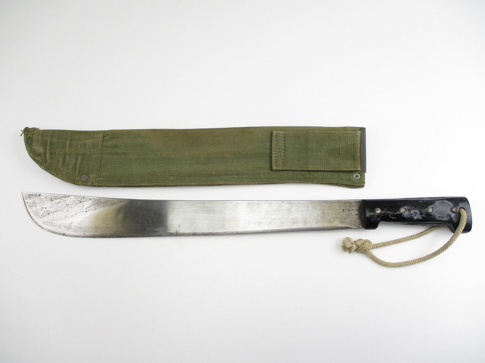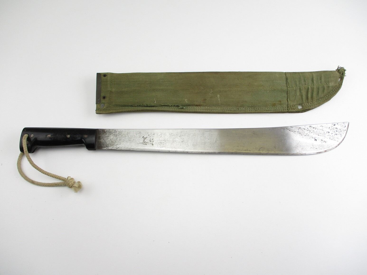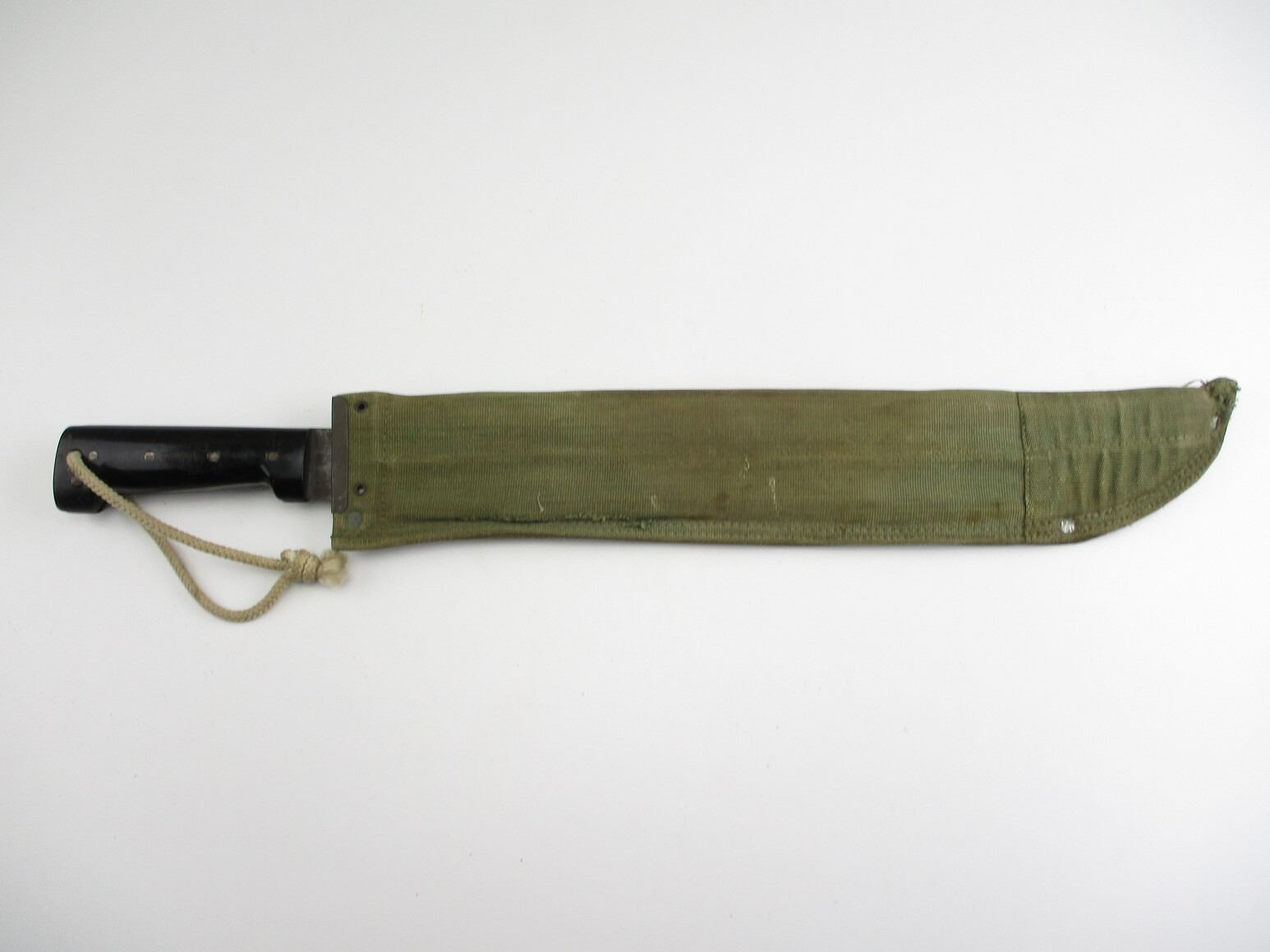 CANADIAN MILITARY 18" MACHETE, (1) BLADE MARKED: "819/BROAD ARROW/19" OVER "AF 010" OVER C-BROAD ARROW, BLACK PLASTIC GRIP WITH FIVE RIVETS, WWII ERA GREEN CANVAS SHEATH WITH BELT LOOP, NO VISIBLE MARKINGS, SHOWS WEAR / TEAR, BLADE APPROX. 17.5" & OAL APPROX. 22.25".
