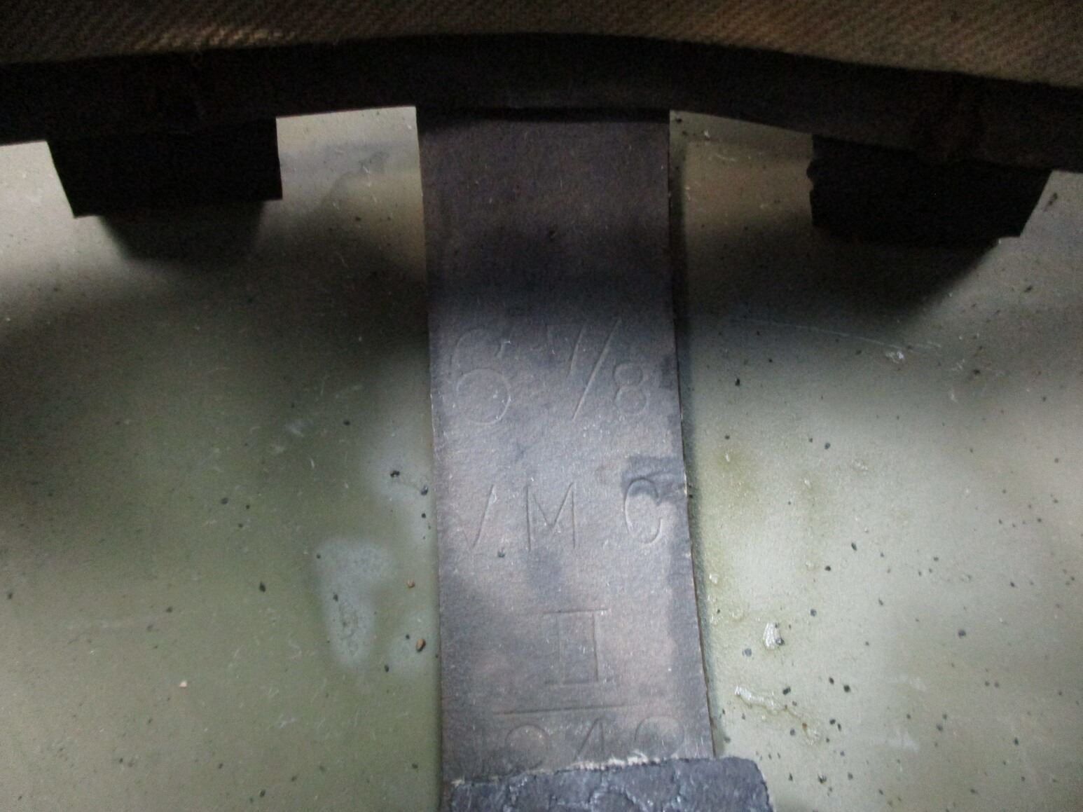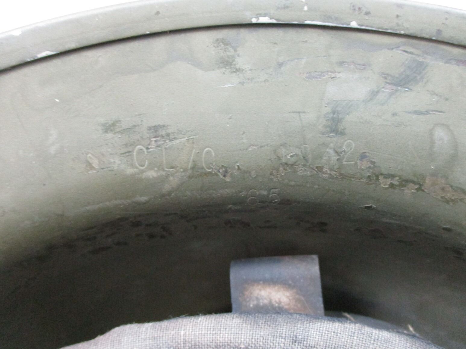 WWII CANADIAN MKII RCAF HELMET, (1) GREEN PAINTED STEEL WITH BLACK HEAD LINER, CANVAS & METAL CHIN STRAP, RCAF DECAL, HELMET MARKED: "C.L./C. (CANADIAN LAMP CO.) 1942, 58" ON SIDE SKIRT, HEAD LINER MARKED: "6 7/8, V.M.C., II, 1942". SEE PHOTOS.