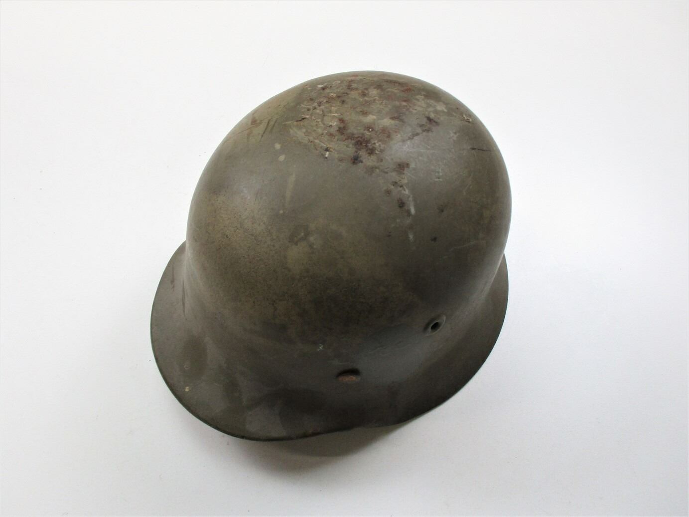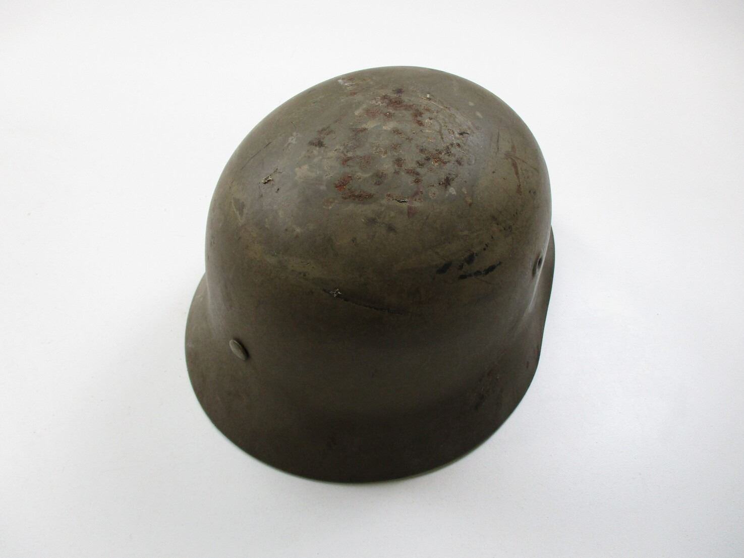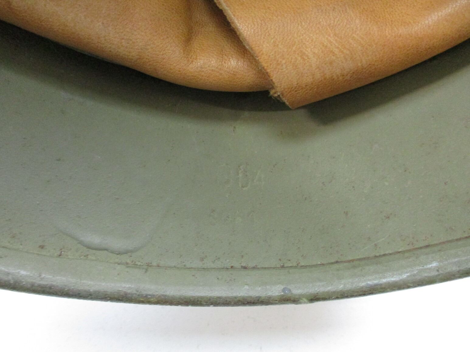 WWII GERMAN M40 HELMET, (1) GREEN RE-PAINTED STEEL WITH NEW LEATHER LINER & CHIN STRAP (NO LACE TIE), MARKED: "Q64" OVER "S661" ON REAR SKIRT. SEE PHOTOS.