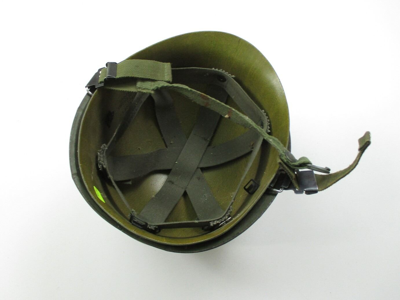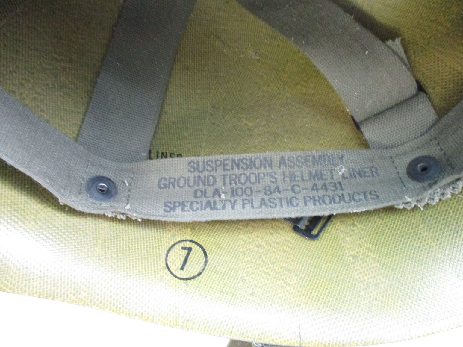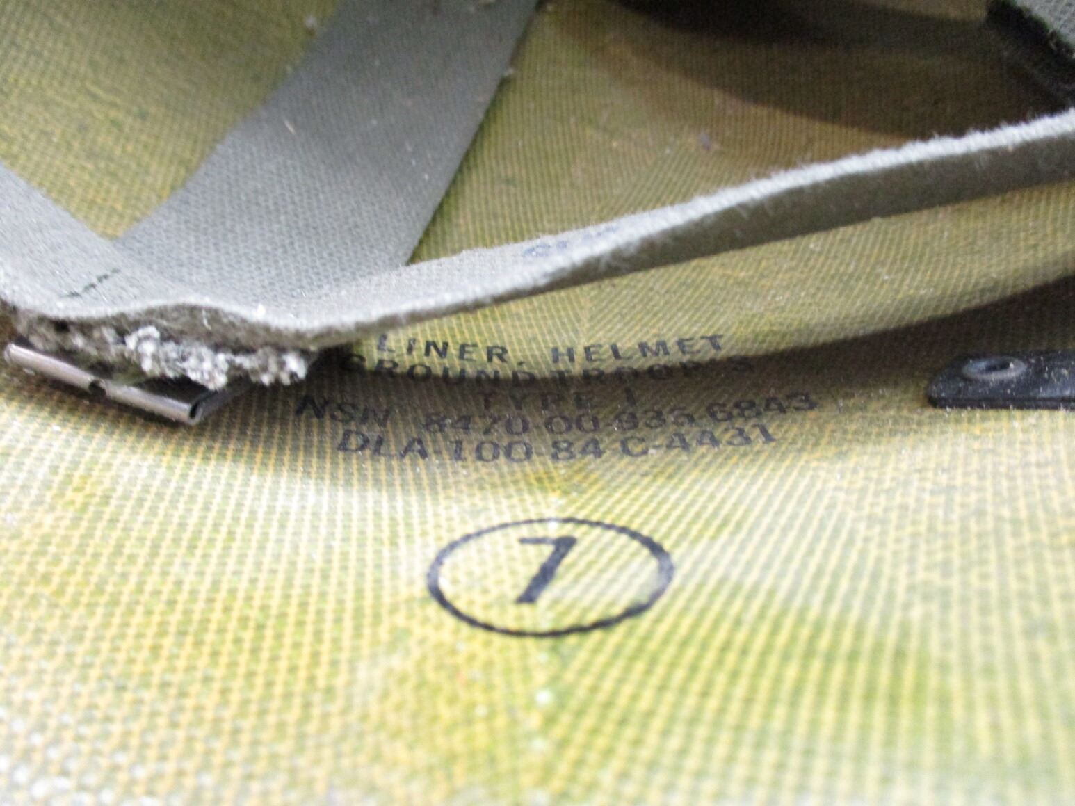 CANADIAN / U.S. MILITARY M1 HELMET, (1) GREEN PAINTED STEEL SHELL, PARTIAL GREEN CANVAS HEAD LINER & CHIN STRAP, LINER MARKED: "LINER, HELMET, GROUND TROOP'S, TYPE 1, NSN 8470-00-935-6843, DLA 100-84-C-4431" & "7", CANVAS MARKED: "SUSPENSION ASSEMBLY, GROUND TROOP'S HELMET LINER, ETC.". SEE PHOTOS.
