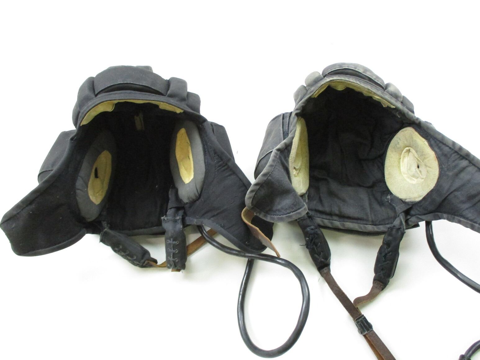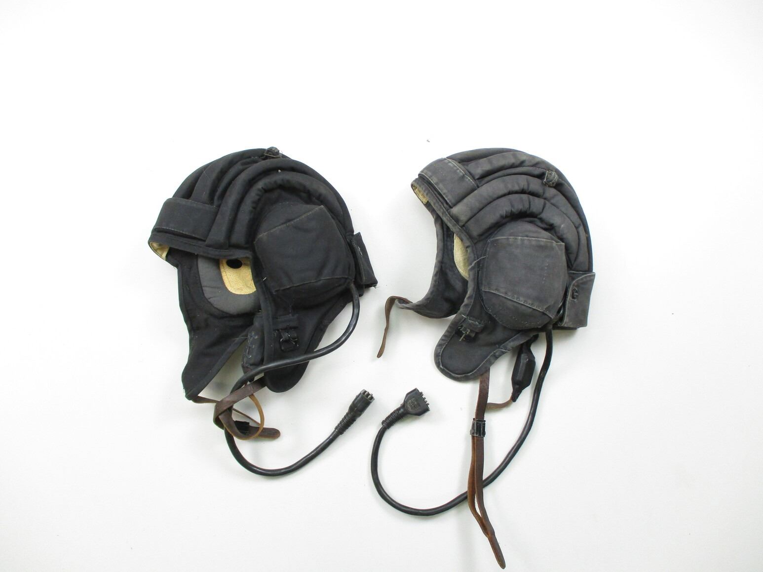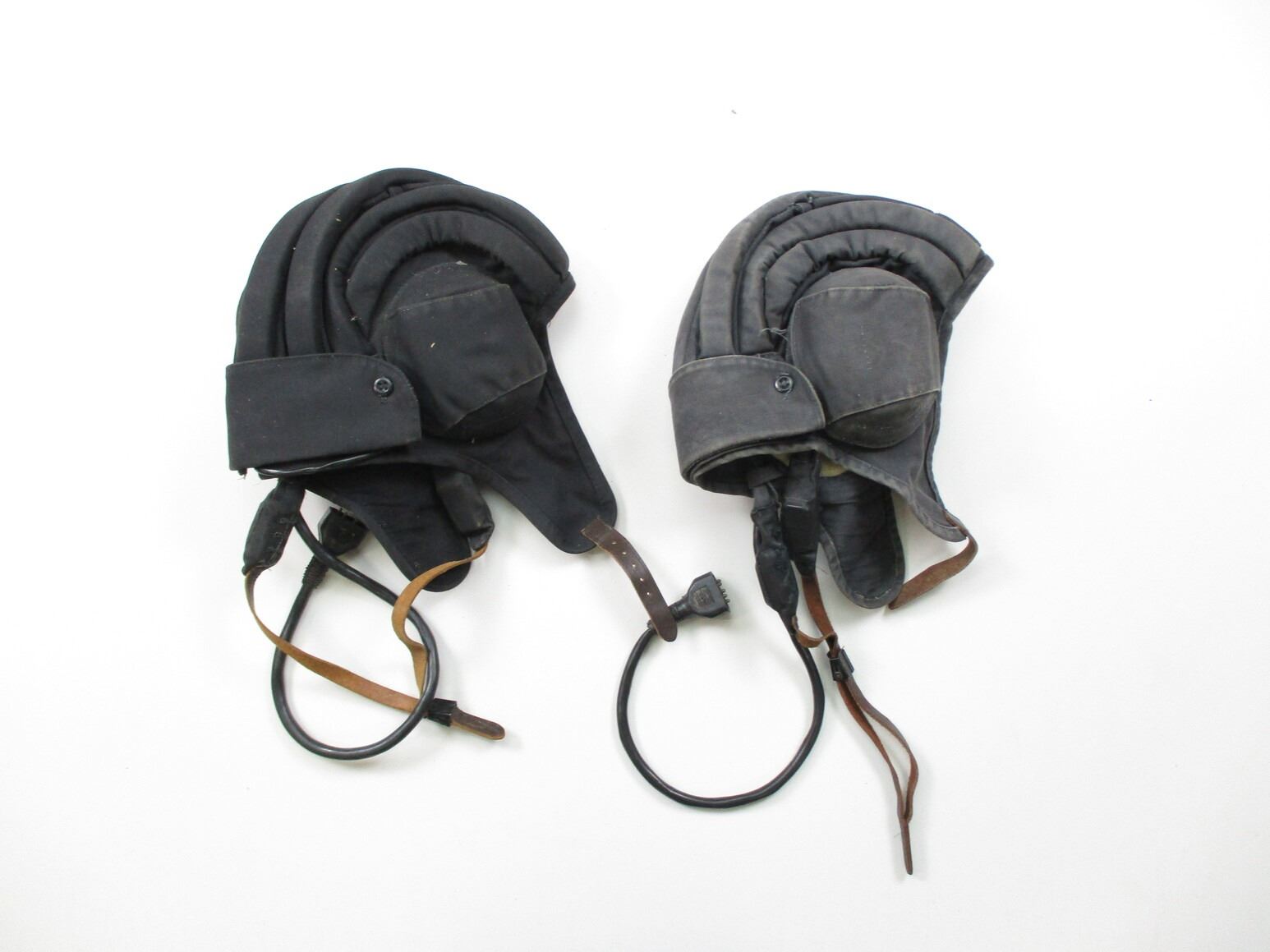 RUSSIAN TYPE TANKER HELMET LOT, (2) BLACK / GREY CANVAS WITH PADDING, MICROPHONE & SPEAKERS, NO VISIBLE MARKINGS. SEE PHOTOS.
