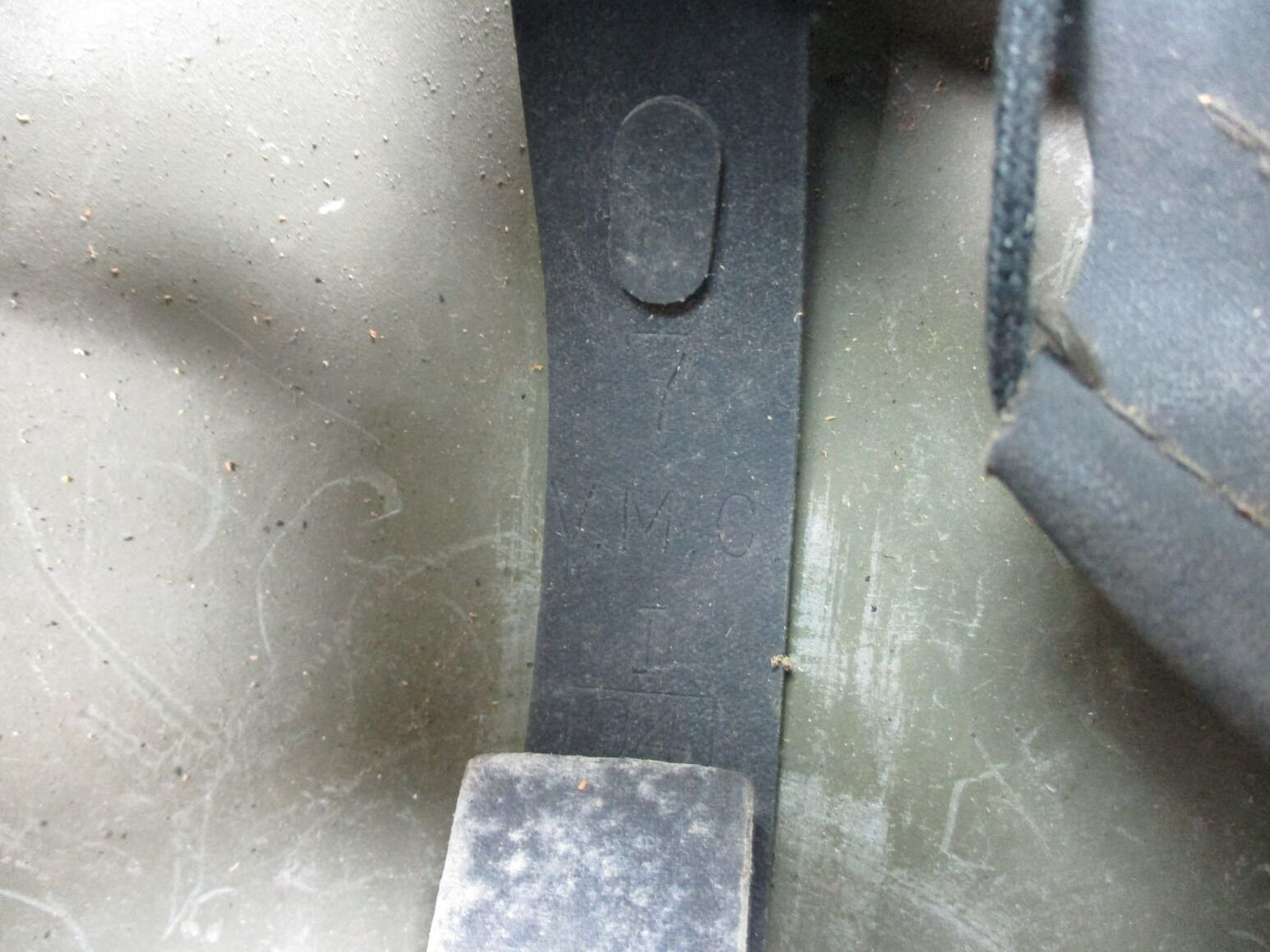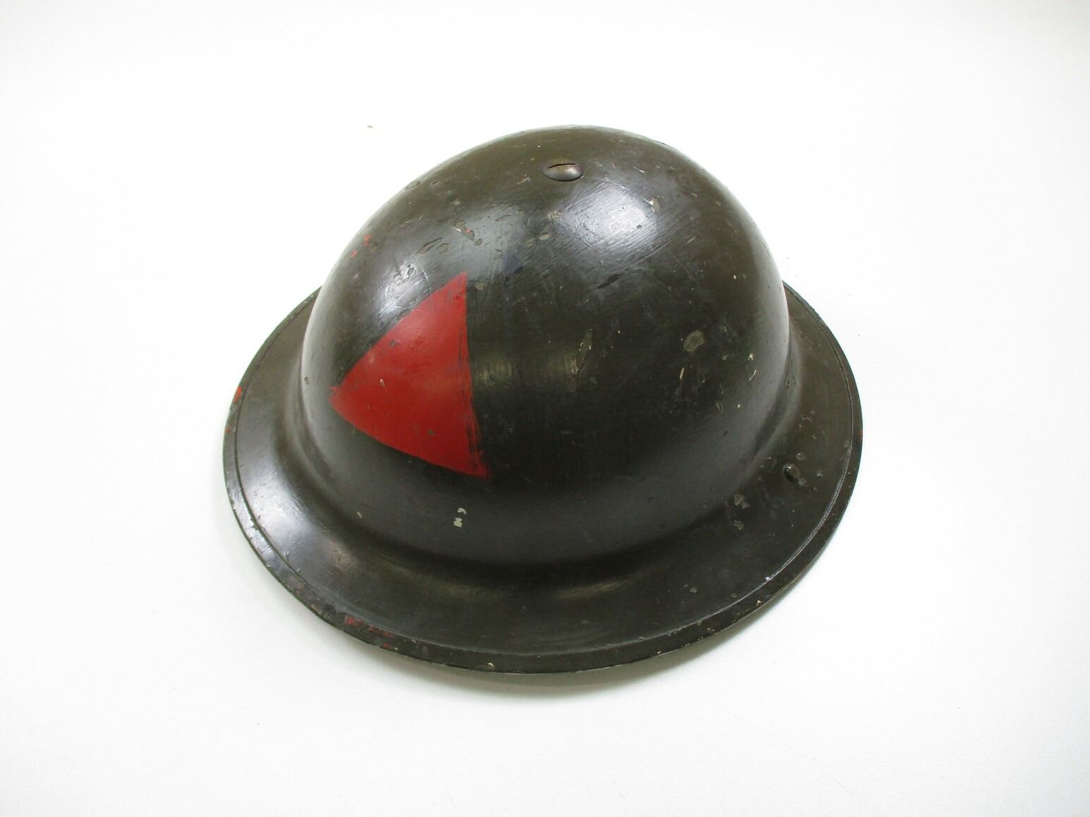WWII CANADIAN MKII HELMET, (1) GREEN PAINTED STEEL WITH BLACK HEAD LINER (STIFF), CANVAS & METAL CHIN STRAP, RED TRIANGLE ON FRONT, HELMET MARKED: "G.S.W. (GENERAL STEEL WARES) A.D, MKII 1941" ON REAR SKIRT, HEAD LINER MARKED: "7, V.M.C., I, 1941". SEE PHOTOS.