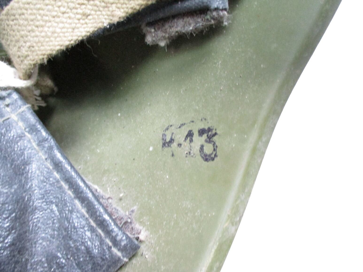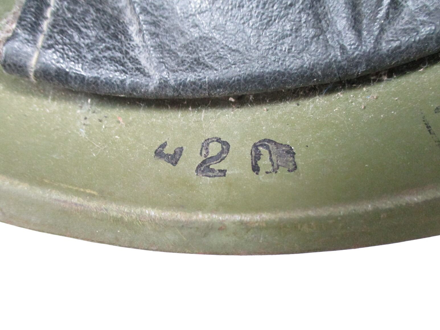 RUSSIAN SSH40 MILITARY HELMET, (1) GREEN PAINTED STEEL WITH BLACK HEAD LINER, CANVAS & METAL CHIN STRAP, VARIOUS INK MARKINGS INSIDE. SEE PHOTOS.