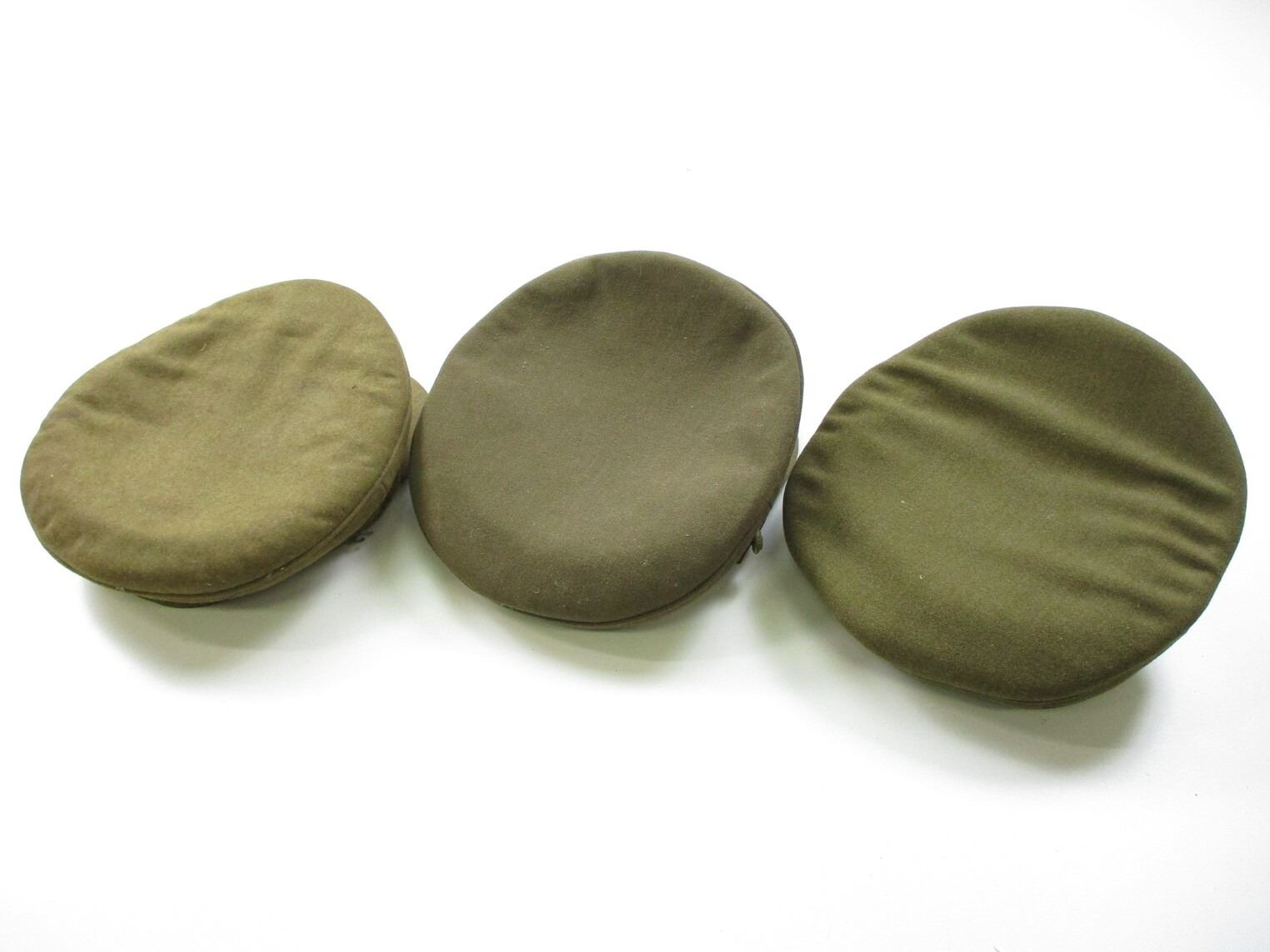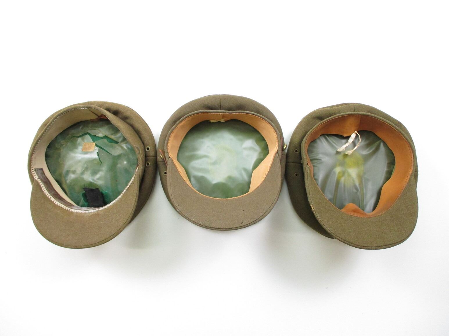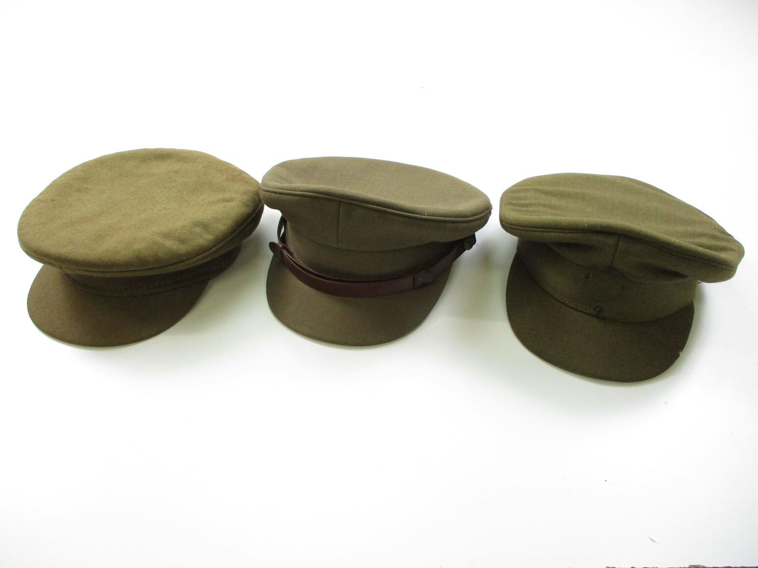WWII / POSTWAR CANADIAN MILITARY PEAKED CAP LOT, (3) GENERAL SERVICE CAP, ONE WITH LEATHER BAND & BUTTONS, MARKED: "WILLIAM SCULLY, MONTREAL", NO OTHER MARKINGS. SEE PHOTOS.