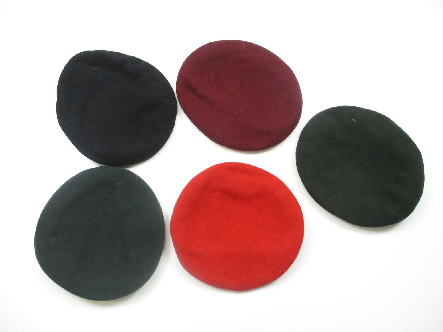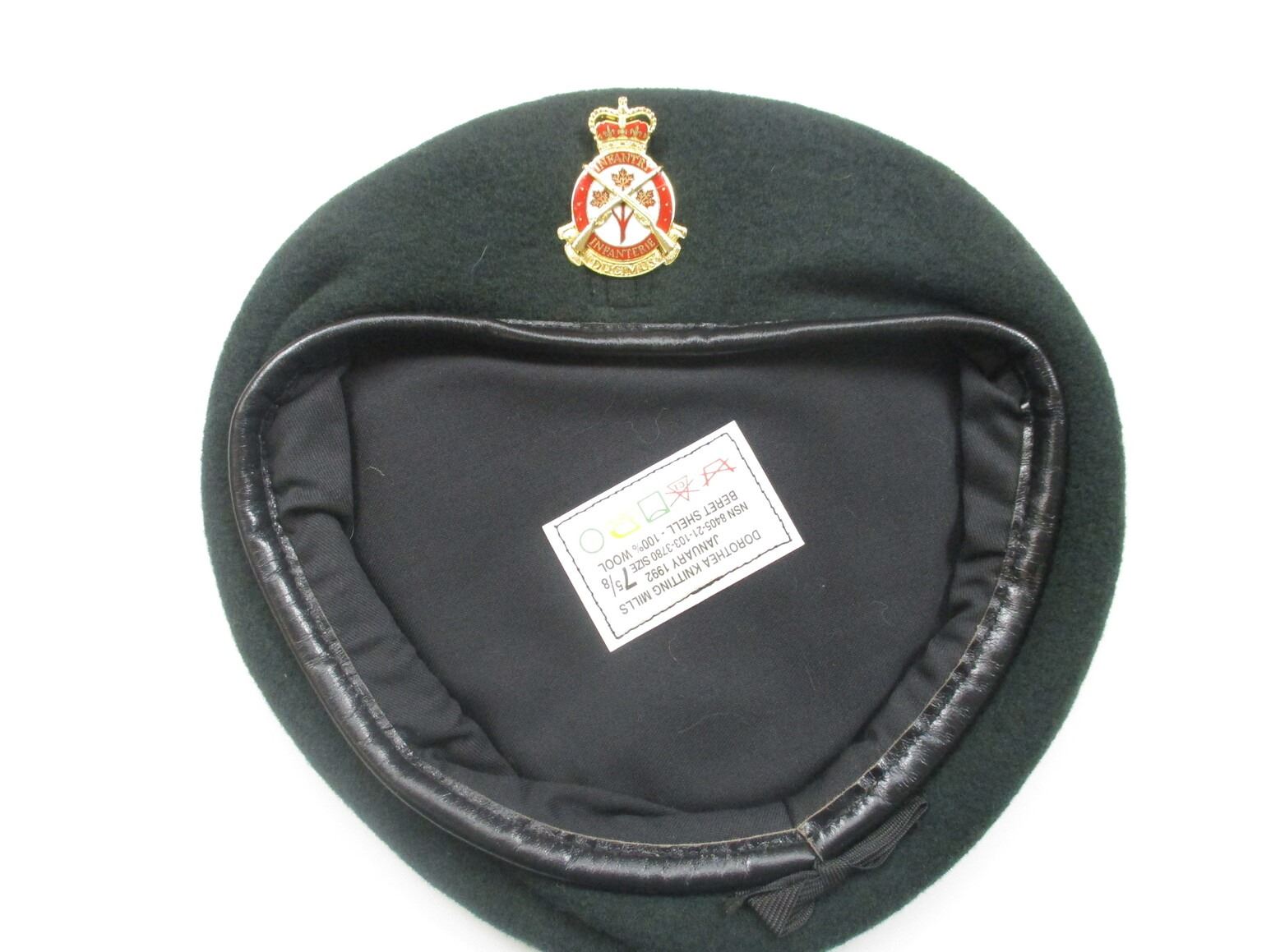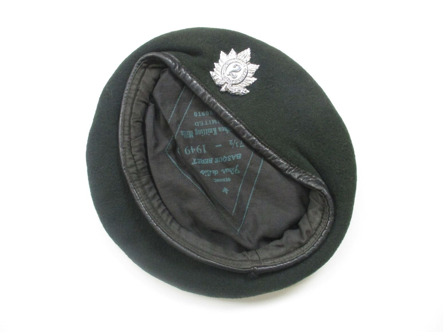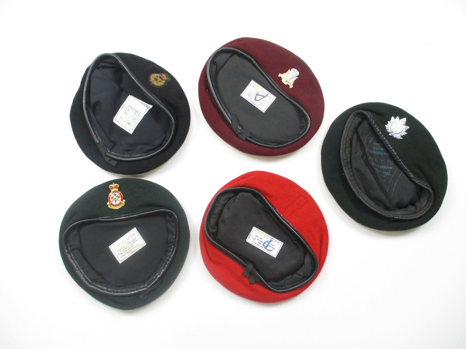 ASSORTED CANADIAN MILITARY CAP AND BADGE LOT, LOT INCLUDES; (1) BLACK WOOL CAP WITH 1ST PATTERN GENERAL OFFICER'S CAP BADGE, SIZE 7 1/2, (1) DARK GREEN WOOL CAP WITH ROYAL CANADIAN INFANTRY CORPS CAP BADGE, SIZE 7 5/8, (1) BURGUNDY WOOL CAP WITH CANADIAN AIRBORNE CAP BADGE, SIZE 7 5/8, (1) DARK GREEN WOOL CAP WITH "THE QUEEN'S OWN RIFLES OF CANADA 2" CAP BADGE, SIZE 7 1/2 & (1) RED WOOL CAP, SIZE 7 5/8. SEE PHOTOS.