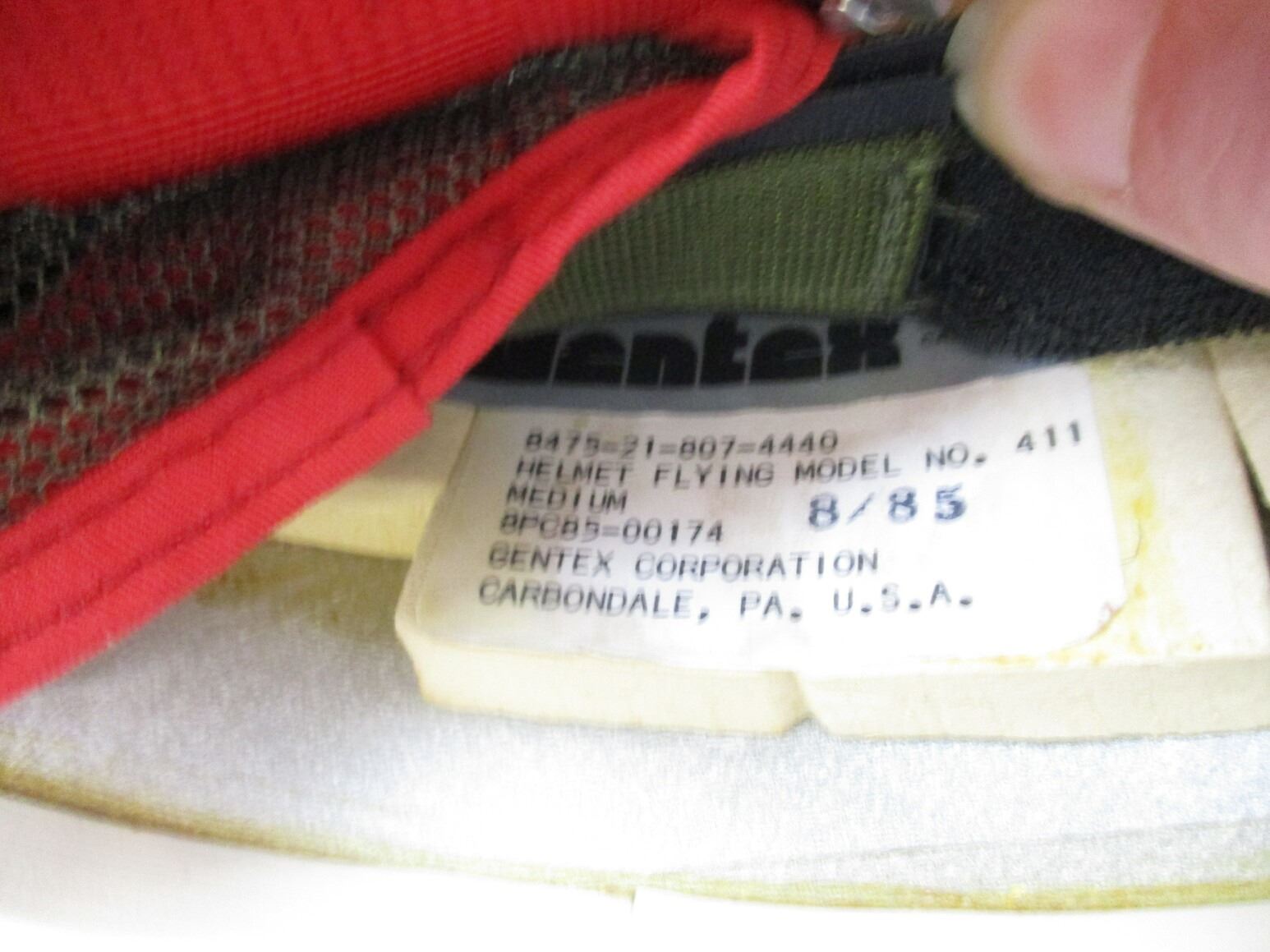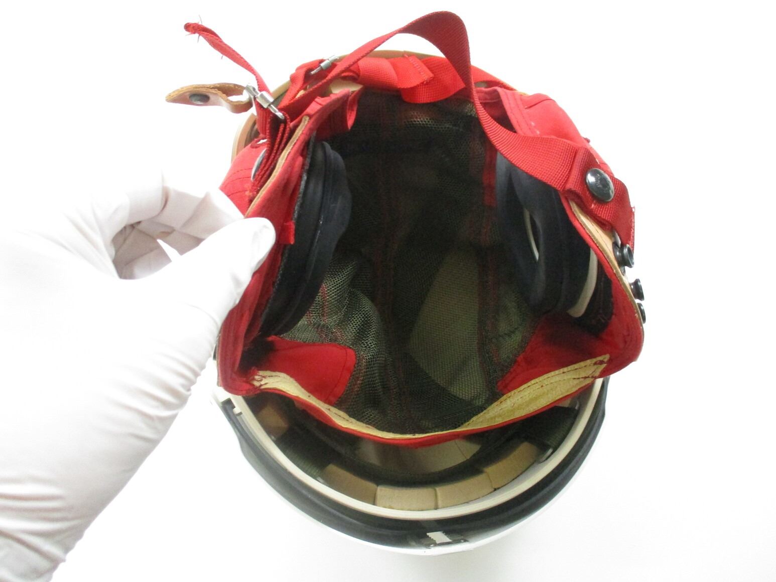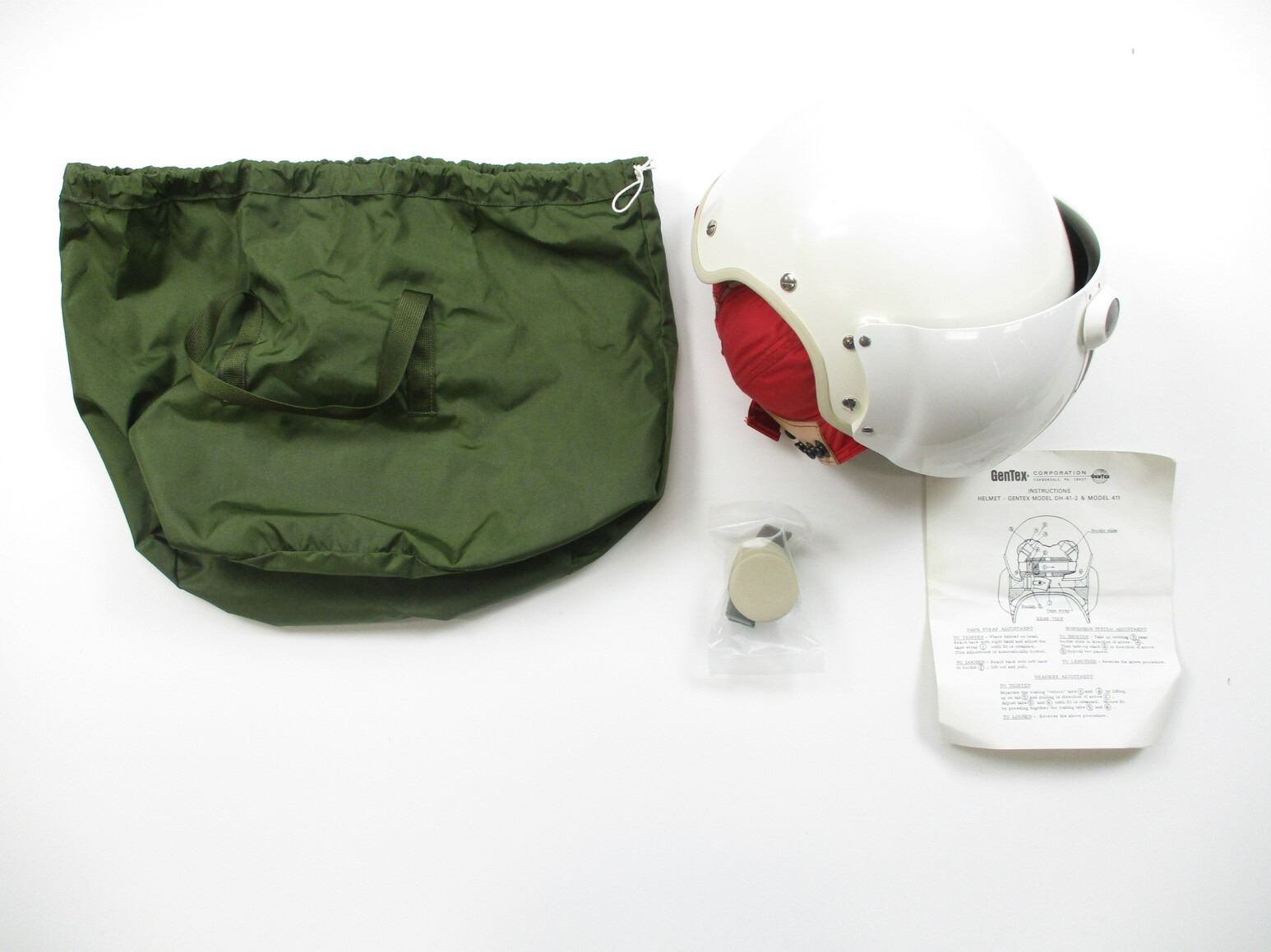 CANADIAN MILITARY FLYERS HELMET, (1) WHITE FIBERGLASS WITH COTTON/ CANVAS/NYLON HEAD LINER & CHIN STRAP, SIZE MEDIUM, GREEN NYLON CARRY BAG & ORIGINAL PACKAGING, NOS. SEE PHOTOS.