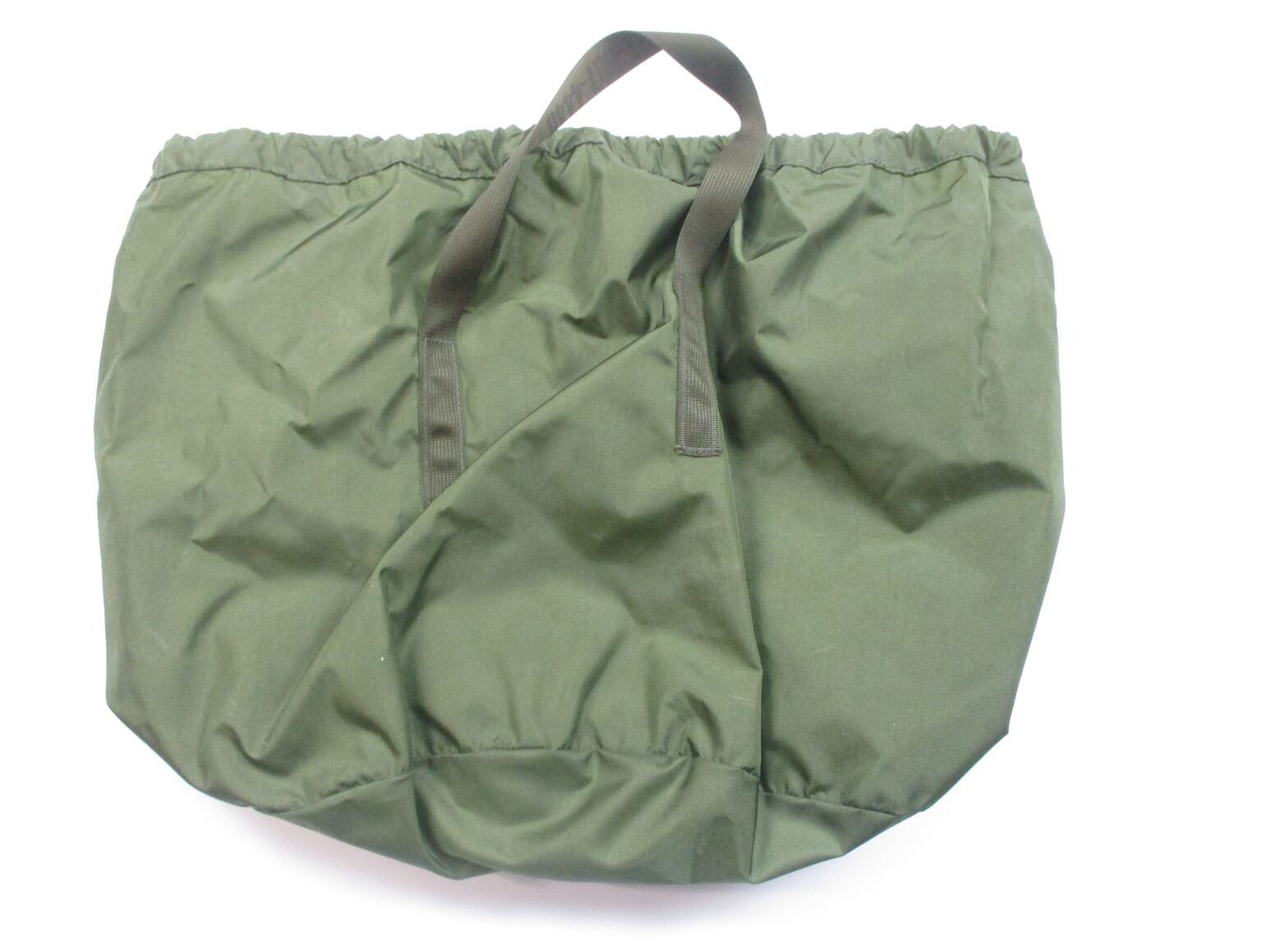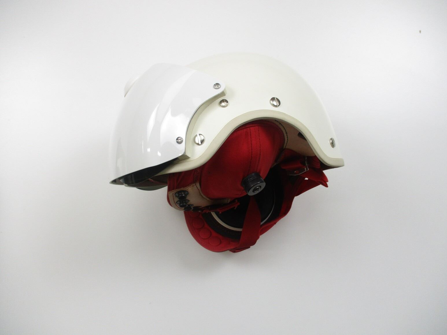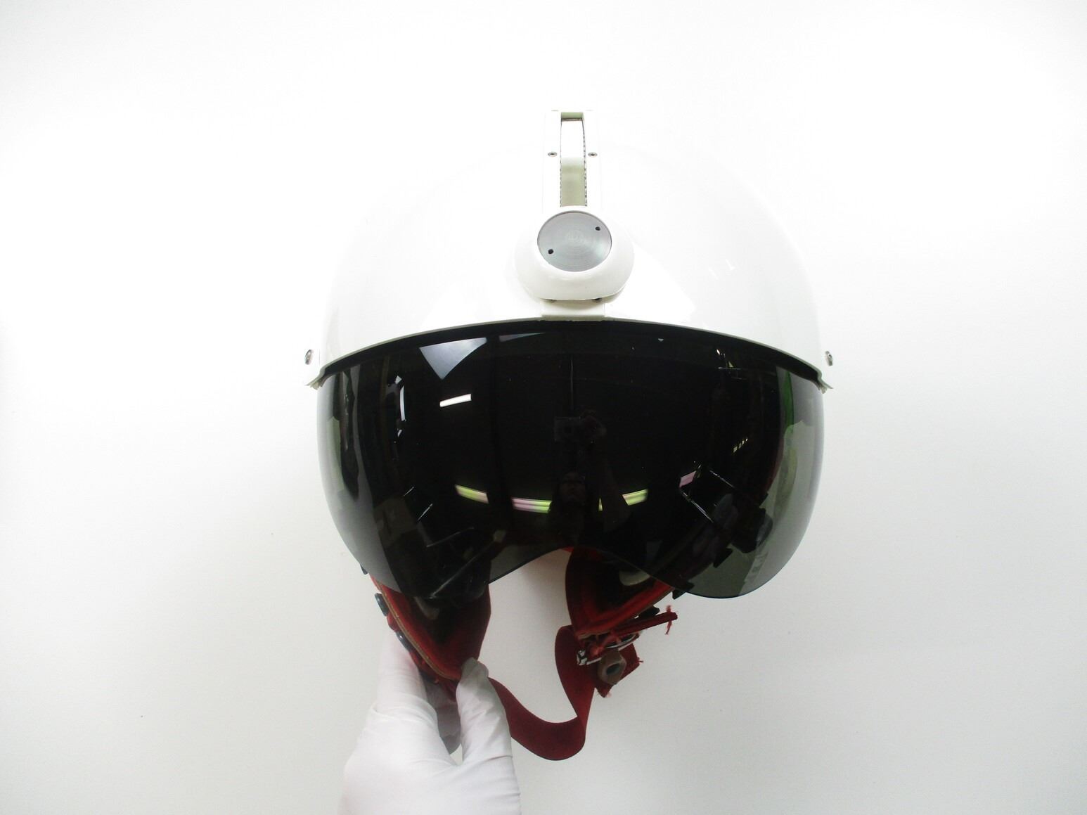 CANADIAN MILITARY FLYERS HELMET, (1) WHITE FIBERGLASS WITH COTTON/ CANVAS/NYLON HEAD LINER & CHIN STRAP, SIZE MEDIUM, GREEN NYLON CARRY BAG & ORIGINAL PACKAGING, NOS. SEE PHOTOS.