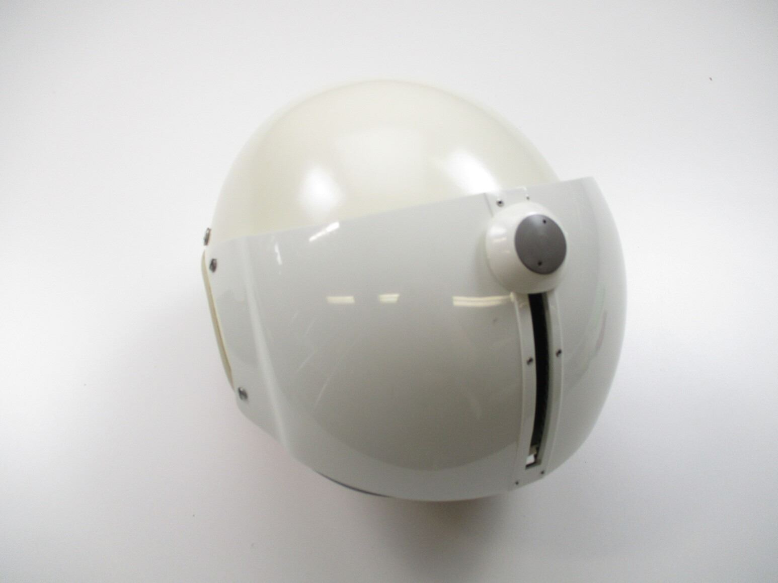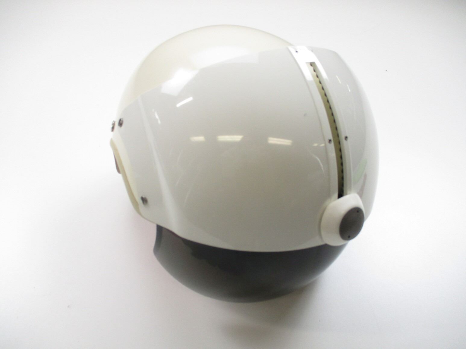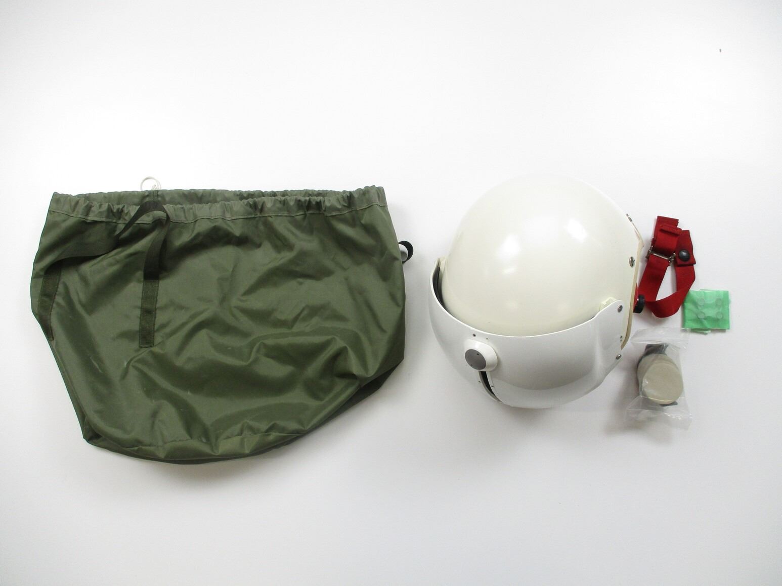 CANADIAN MILITARY FLYERS HELMET, (1) WHITE FIBERGLASS WITH COTTON/ CANVAS/NYLON HEAD LINER & CHIN STRAP, SIZE MEDIUM, GREEN NYLON CARRY BAG. SEE PHOTOS.