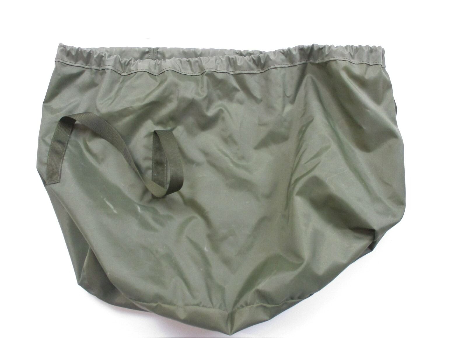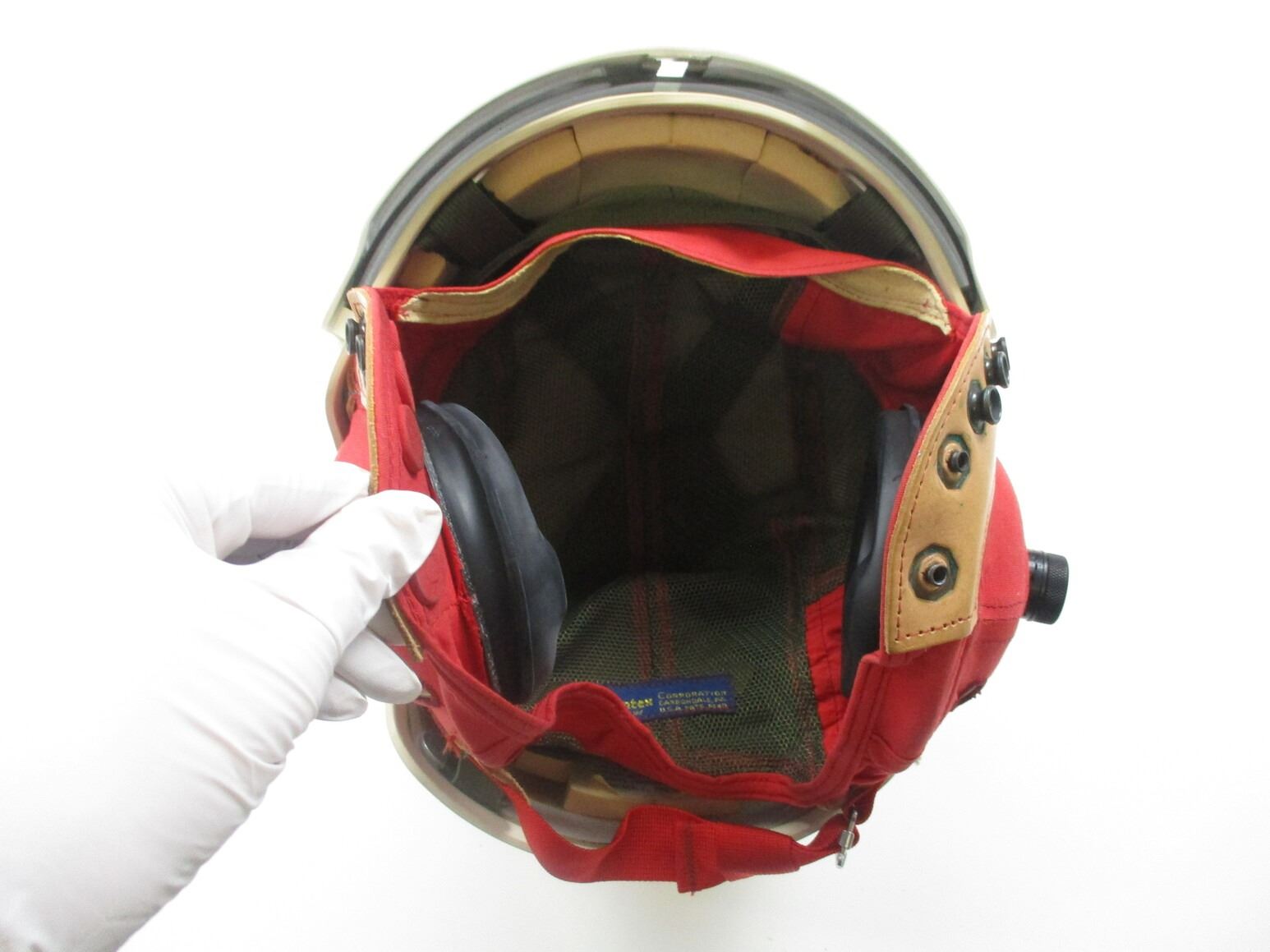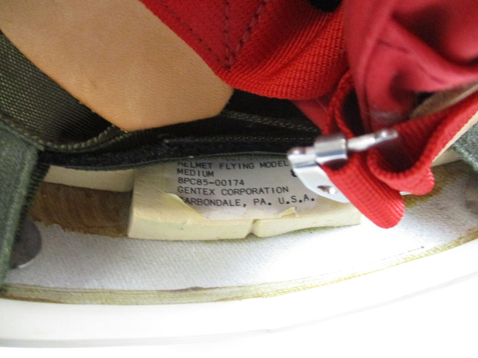 CANADIAN MILITARY FLYERS HELMET, (1) WHITE FIBERGLASS WITH COTTON/ CANVAS/NYLON HEAD LINER & CHIN STRAP, SIZE MEDIUM, GREEN NYLON CARRY BAG. SEE PHOTOS.