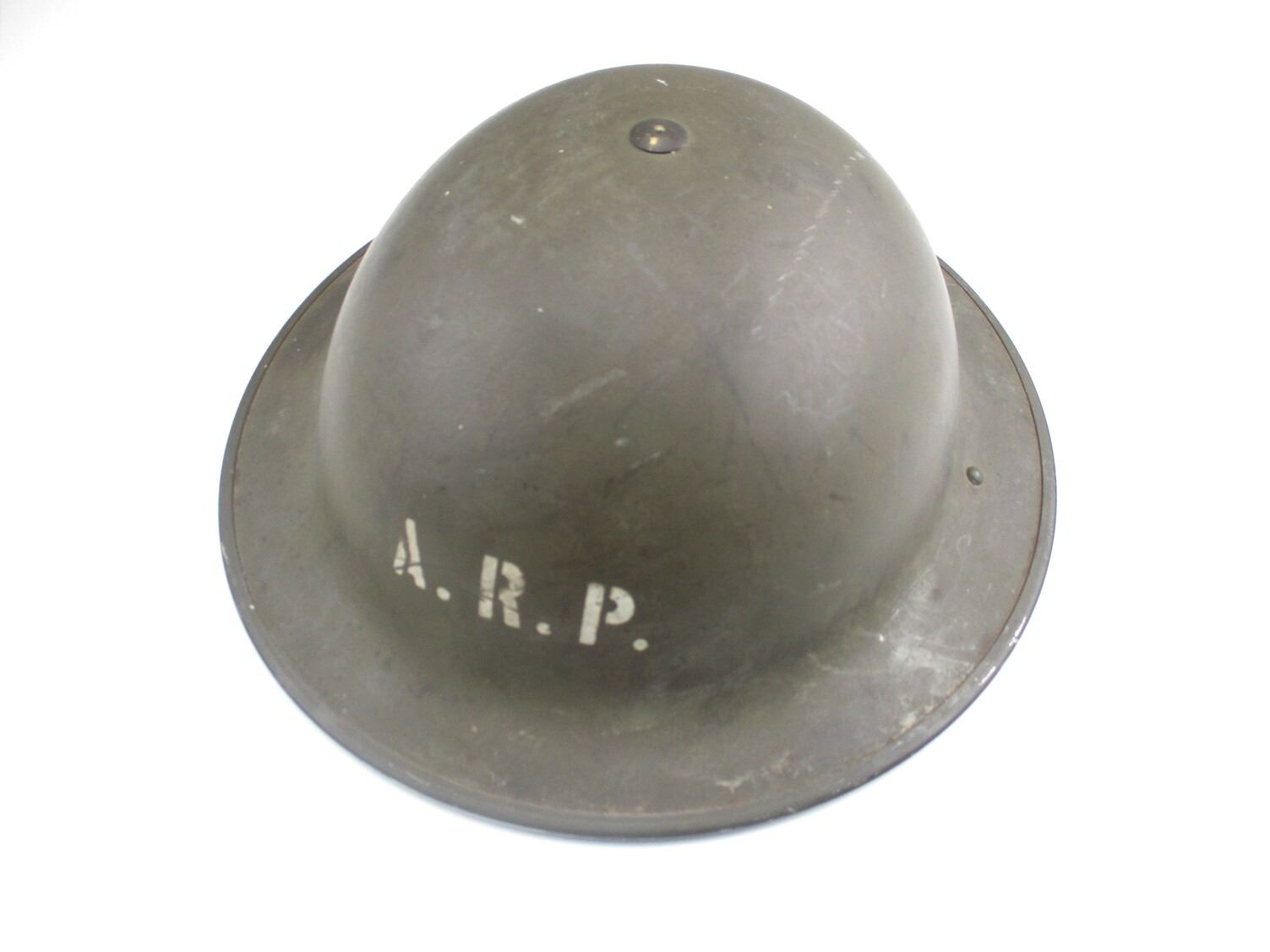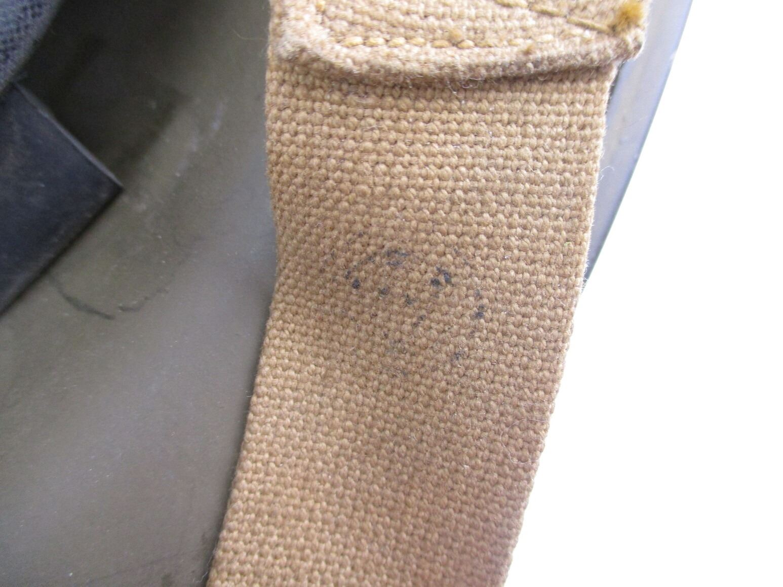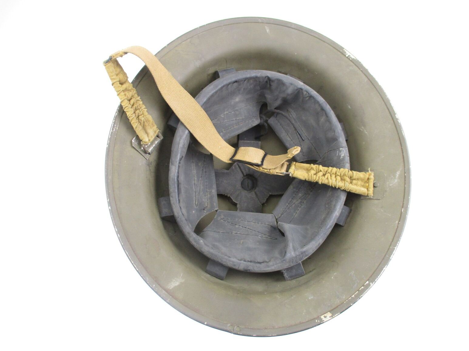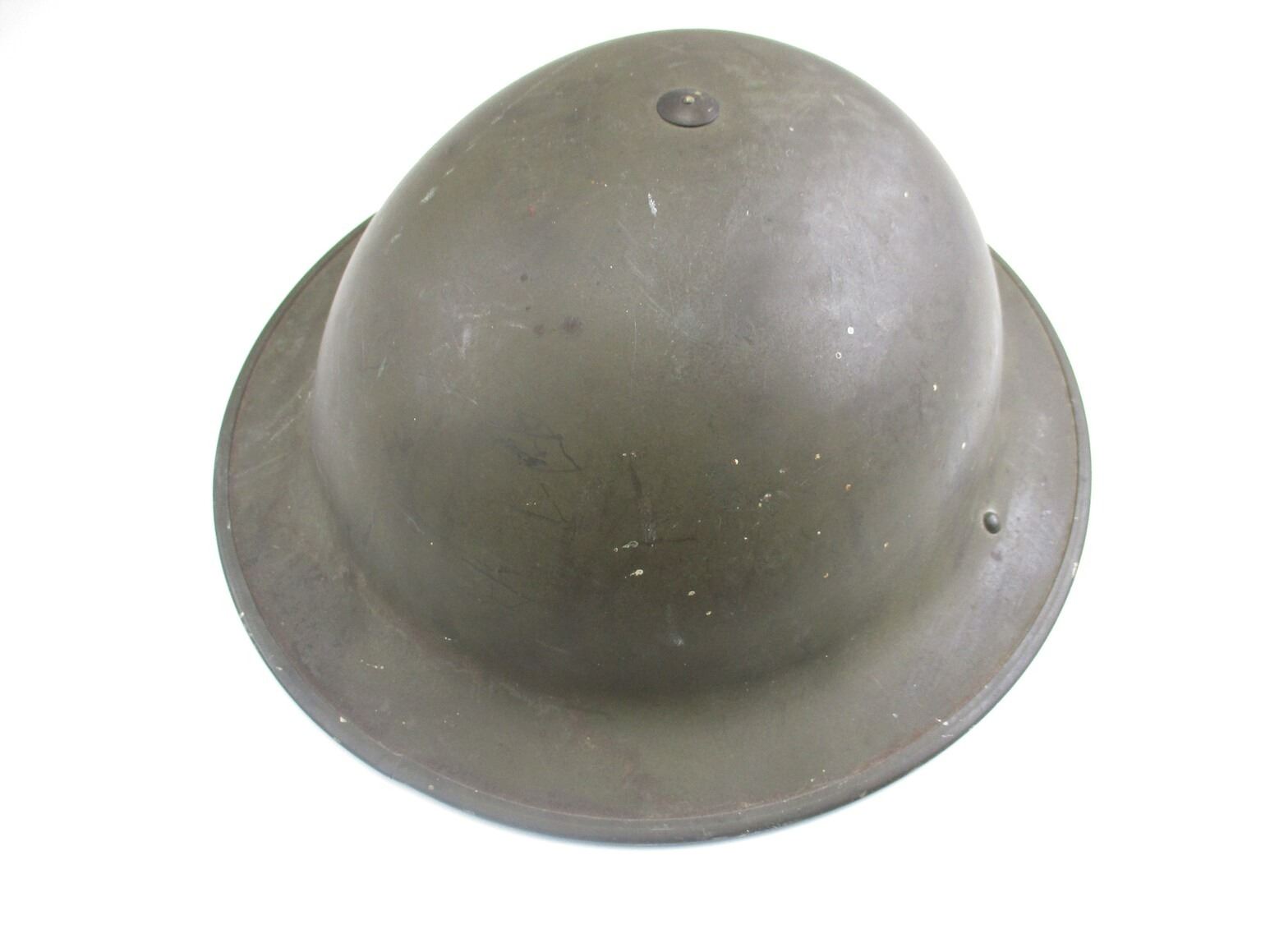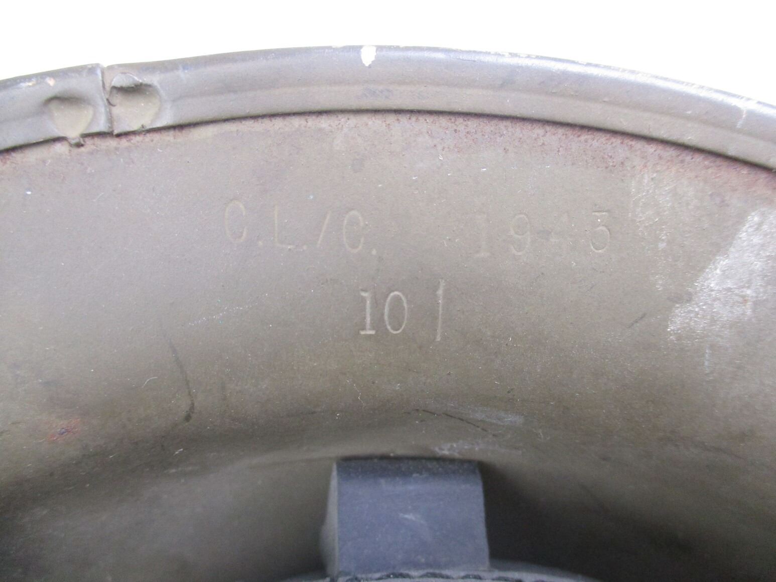 WWII CANADIAN MKII HELMET, (1) GREEN PAINTED STEEL WITH BLACK HEAD LINER, CANVAS & METAL CHIN STRAP (C-BROAD ARROW), HELMET MARKED: "C.L./C. (CANADIAN LAMP CO.) 1943, 10" ON REAR SKIRT, NO VISIBLE MARKINGS ON HEAD LINER. SEE PHOTOS.