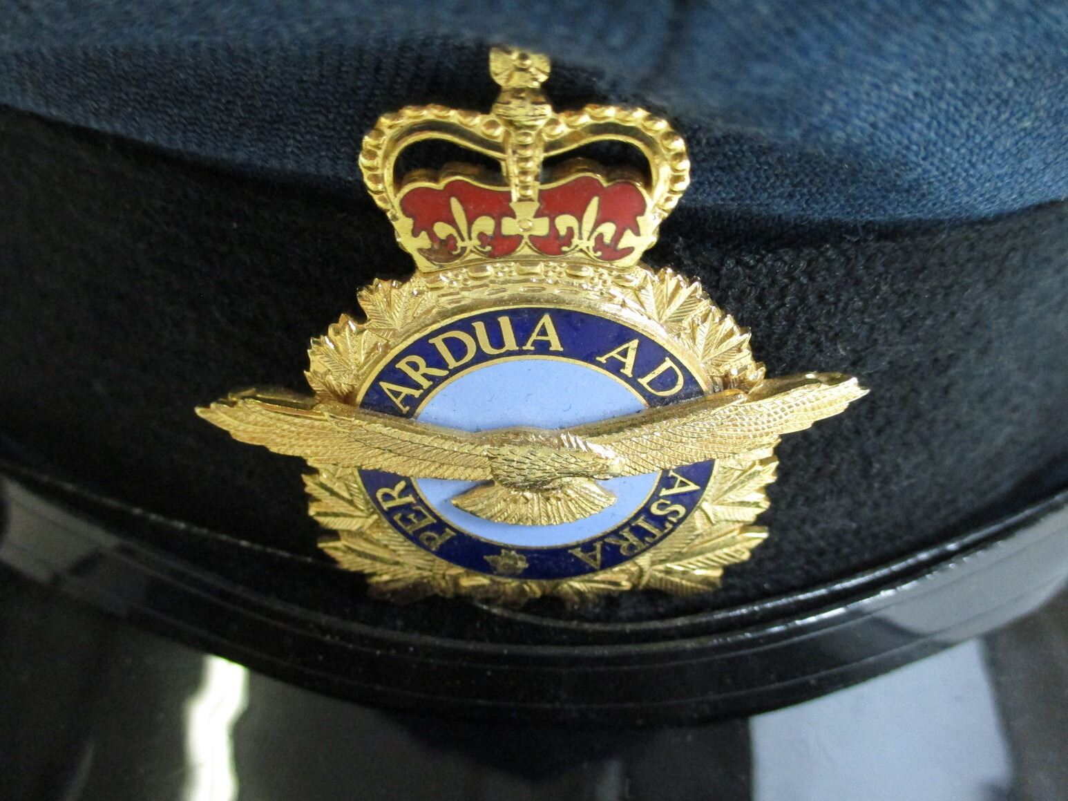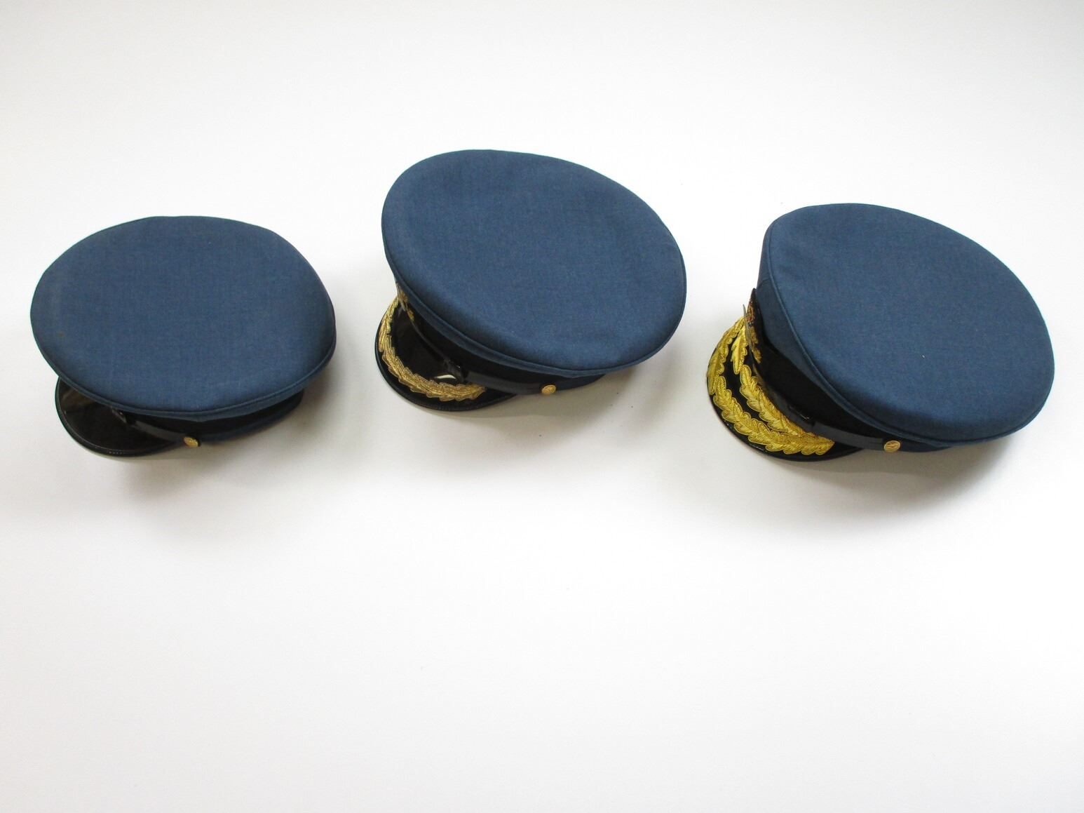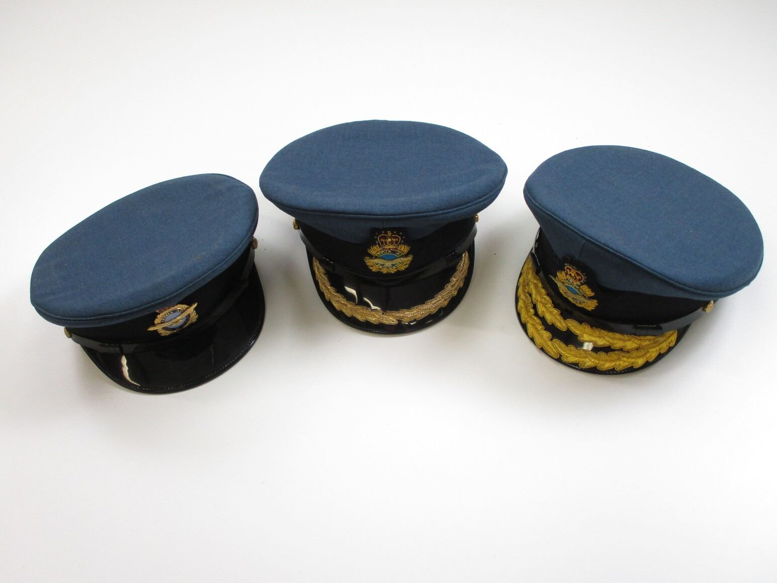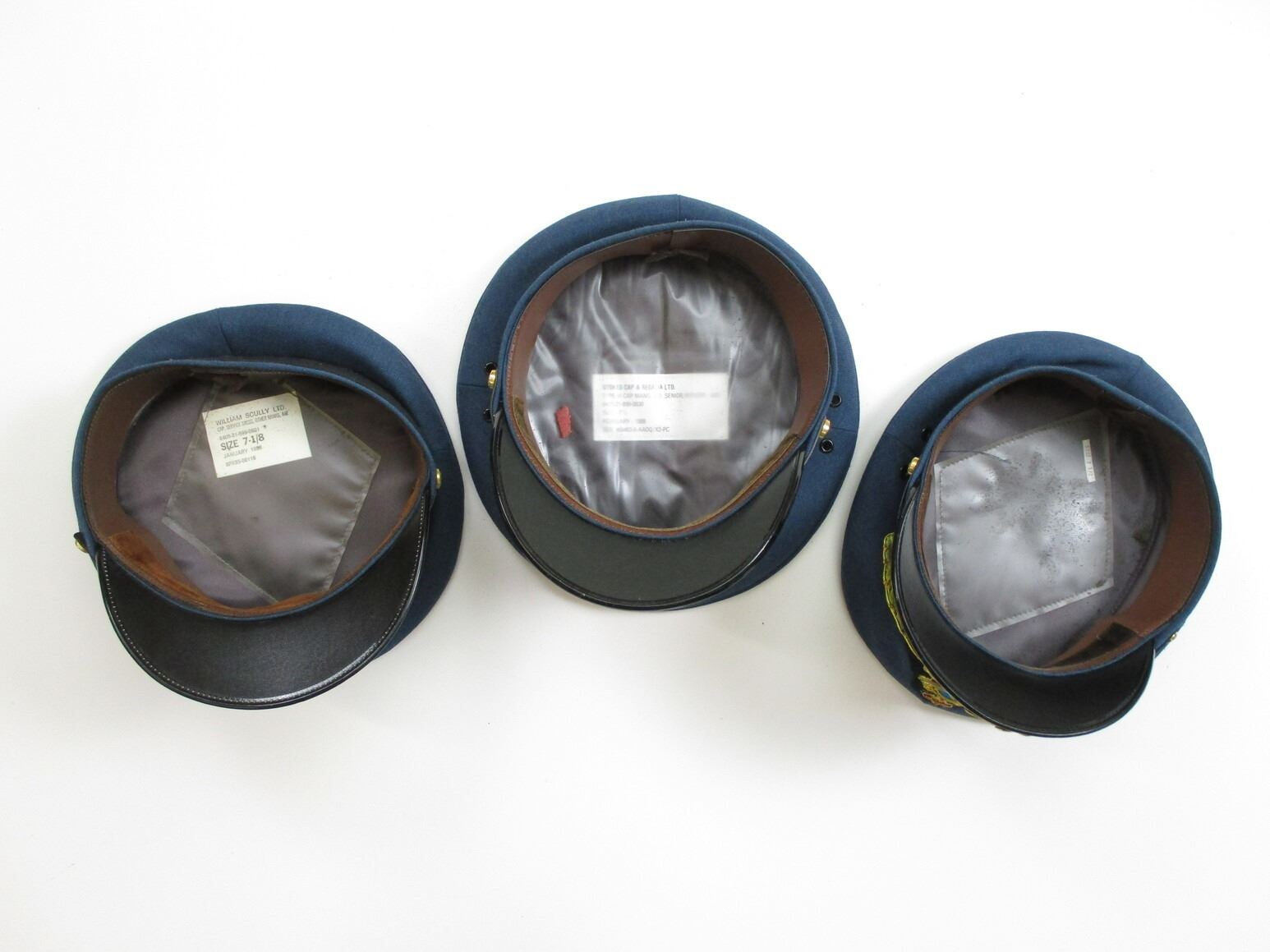 RCAF PEAKED CAP LOT, LOT INCLUDES; (3) BLUE WITH CAP BADGES, ENLISTED MANS, JUNIOR OFFICER, SENIOR OFFICER TYPES, SIZES 7 1/8" - 7 1/2". SEE PHOTOS.