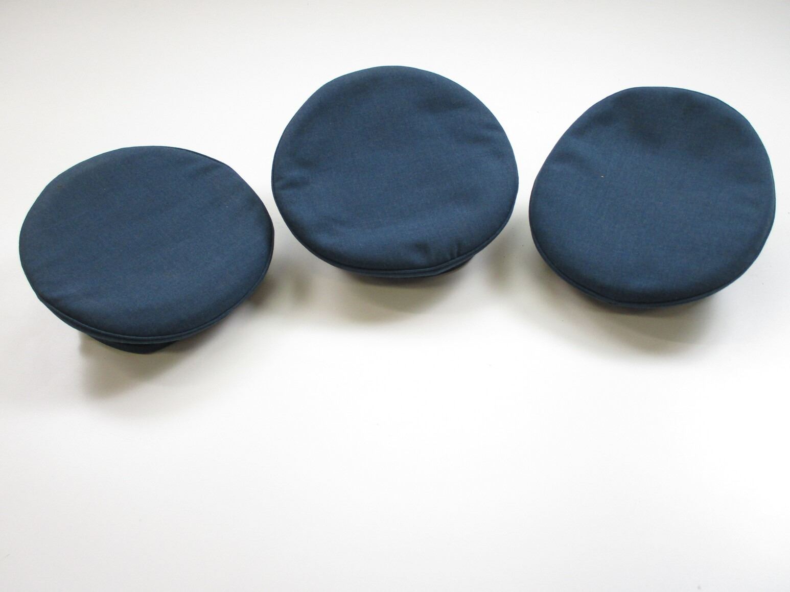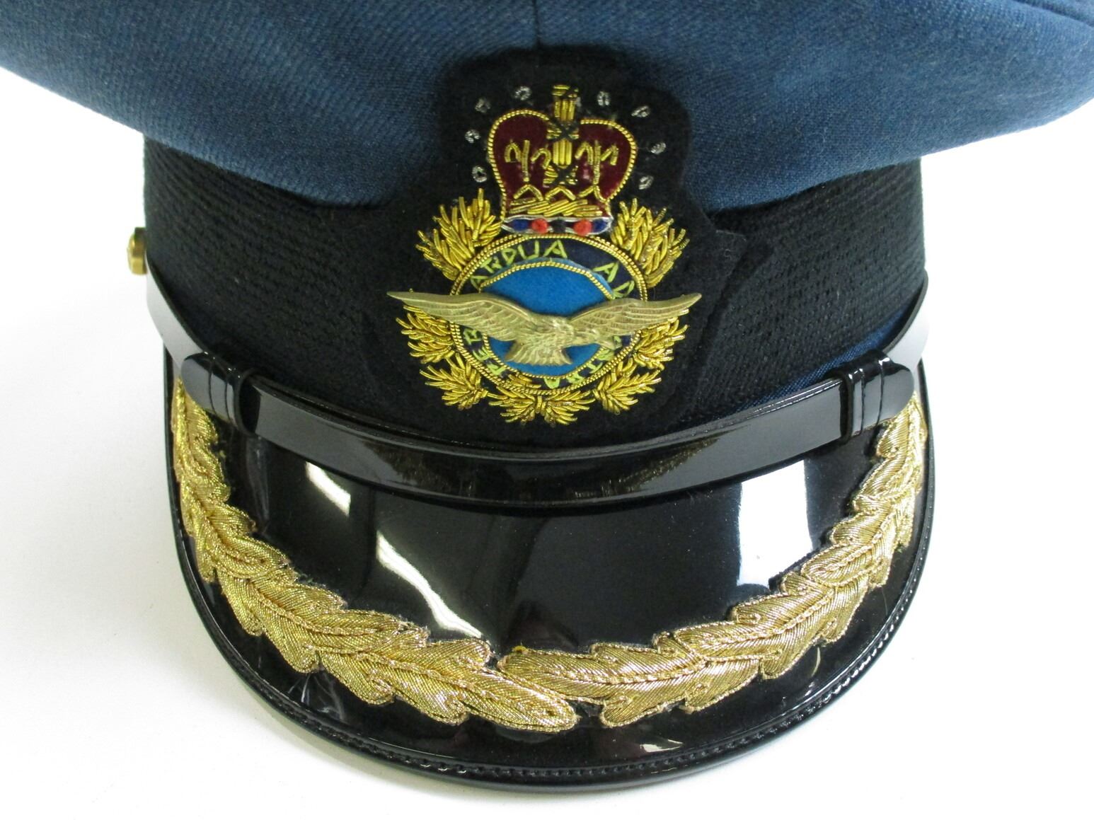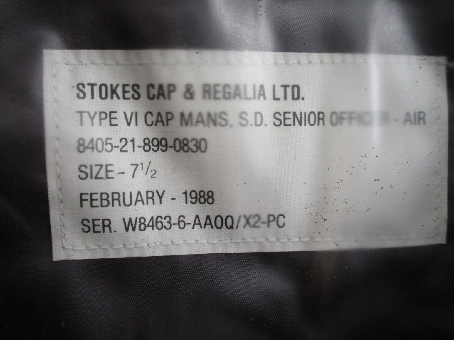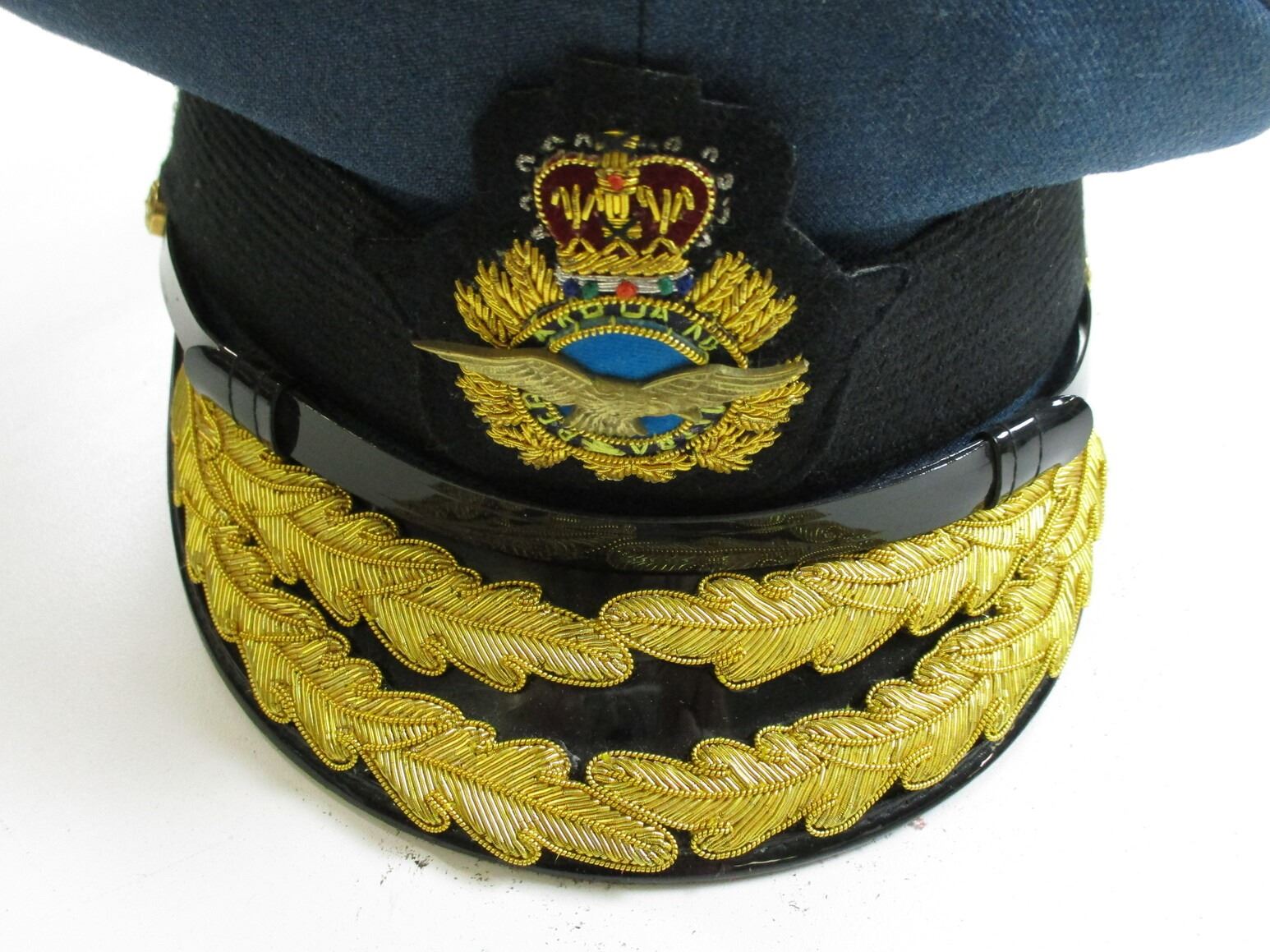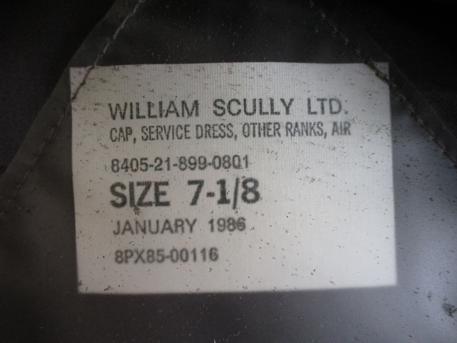 RCAF PEAKED CAP LOT, LOT INCLUDES; (3) BLUE WITH CAP BADGES, ENLISTED MANS, JUNIOR OFFICER, SENIOR OFFICER TYPES, SIZES 7 1/8" - 7 1/2". SEE PHOTOS.