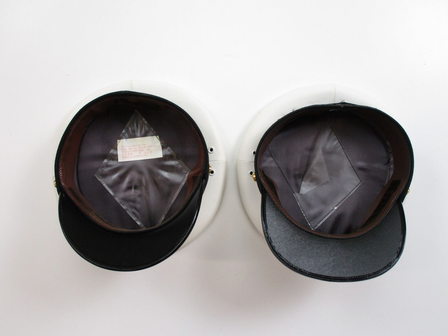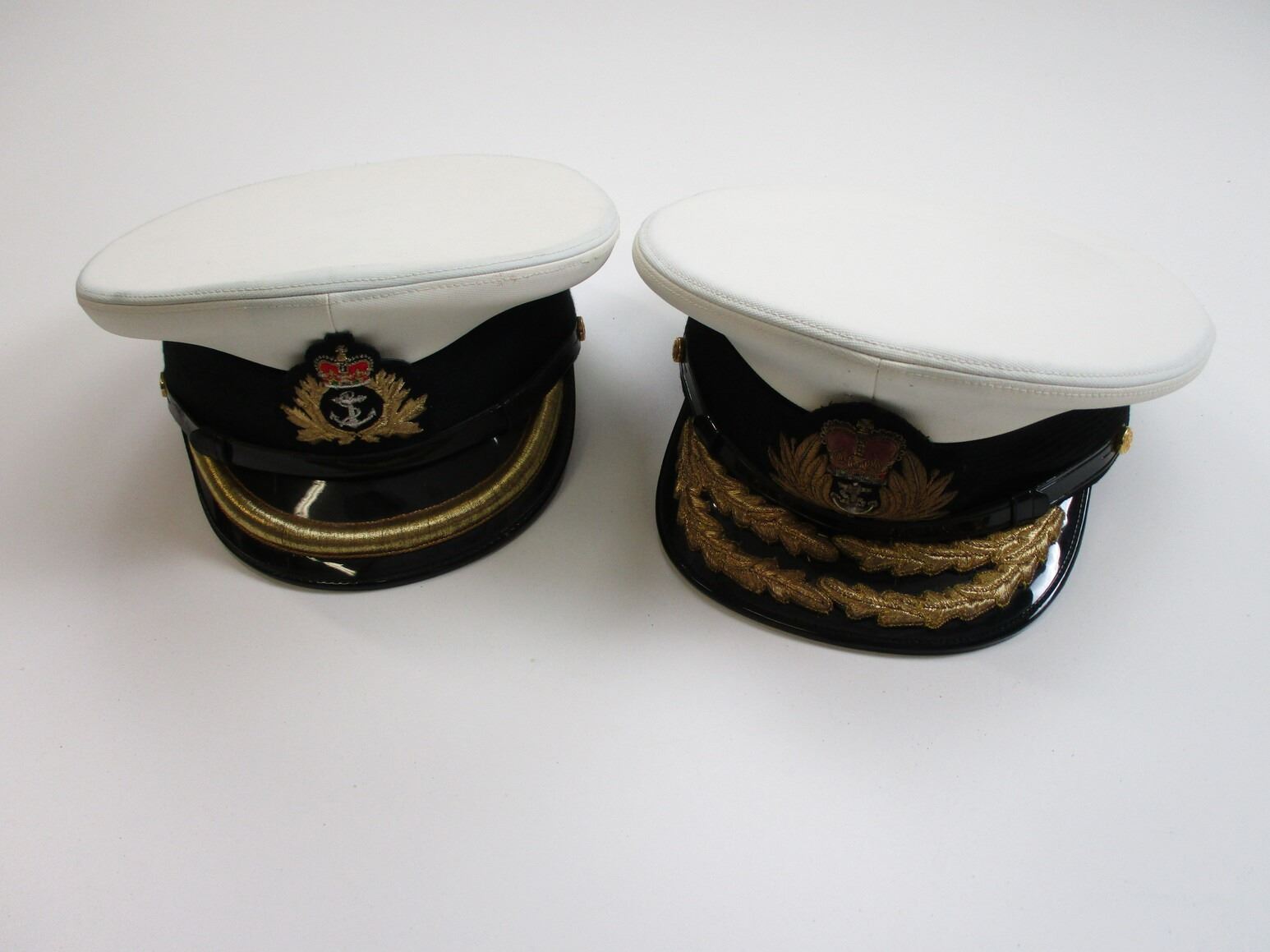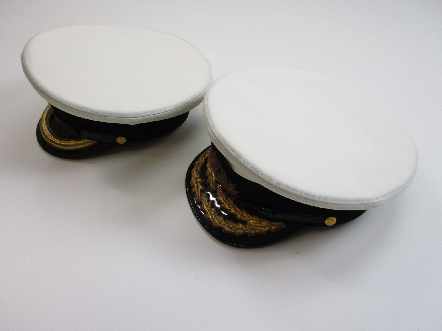CANADIAN NAVY PEAKED OFFICER'S CAP LOT, LOT INCLUDES; (1) MENS, JUNIOR OFFICER, SIZE 7 .5", (1) SENIOR OFFICER CAP WITH WIRE BULLION THREAD CAP BADGE, GOLD OAK LEAF ON BRIM. SEE PHOTOS.