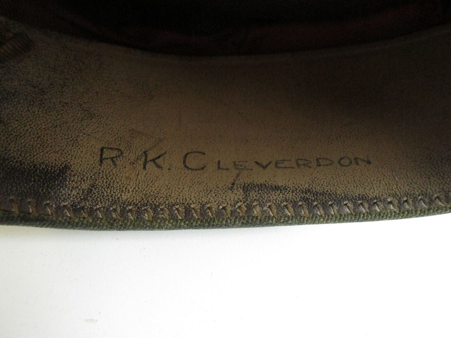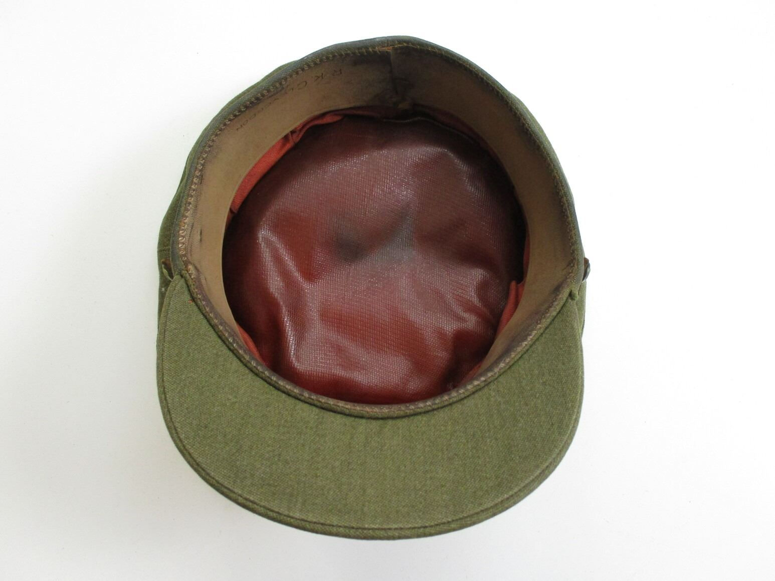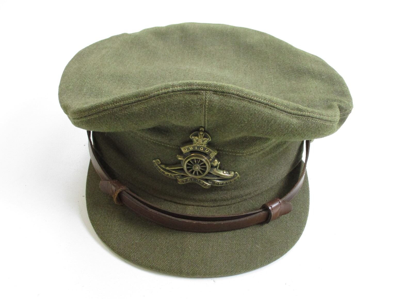 WWII CANADIAN RCA PEAKED CAP, (1) GREEN WITH ROYAL ARTILLERY CAP BADGE & "CANADA" BUTTONS, HAND-WRITTEN: "R.K.CLEVERDON", NO OTHER MARKINGS. SEE PHOTOS.