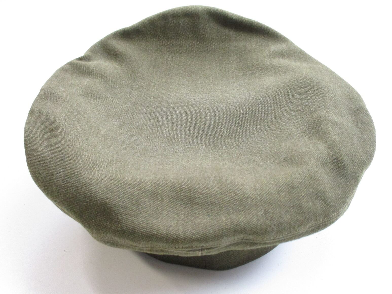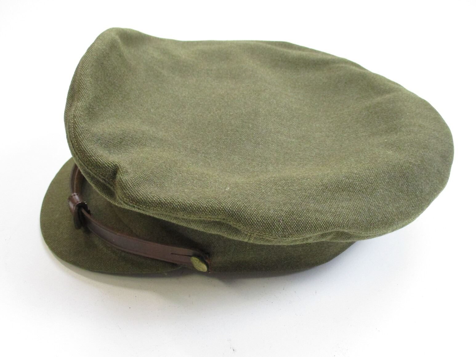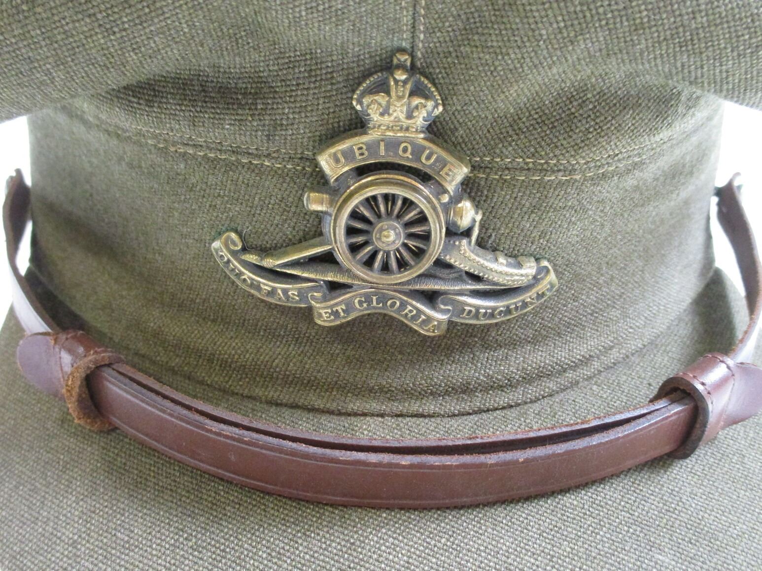 WWII CANADIAN RCA PEAKED CAP, (1) GREEN WITH ROYAL ARTILLERY CAP BADGE & "CANADA" BUTTONS, HAND-WRITTEN: "R.K.CLEVERDON", NO OTHER MARKINGS. SEE PHOTOS.
