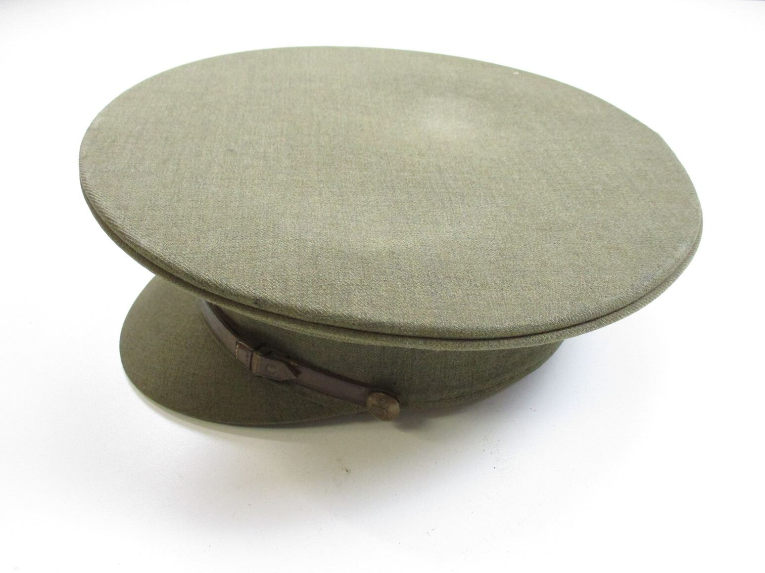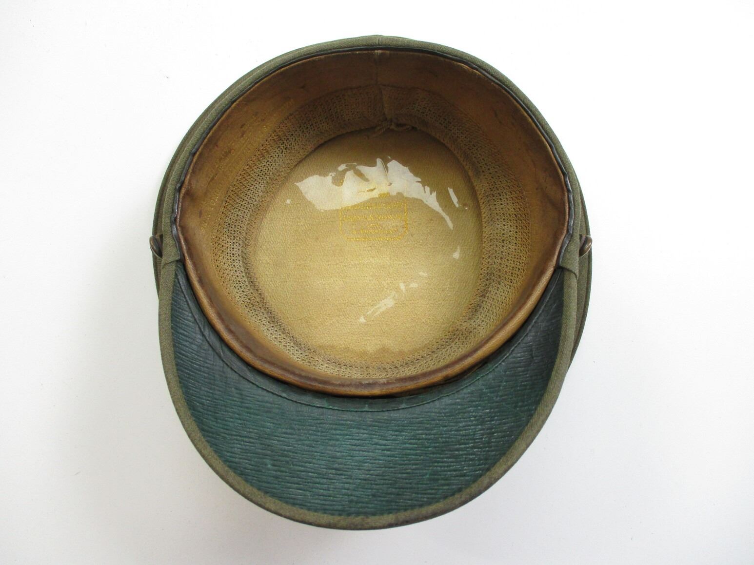 WWI BRITISH ARTILLERY PEAKED CAP, (1) GREEN WITH ROYAL ARTILLERY CAP BADGE, MARKED: "HAWKES & CO. LTD., 1, SAVILE ROW, W., LATE, 14, PICADILLY". SEE PHOTOS.