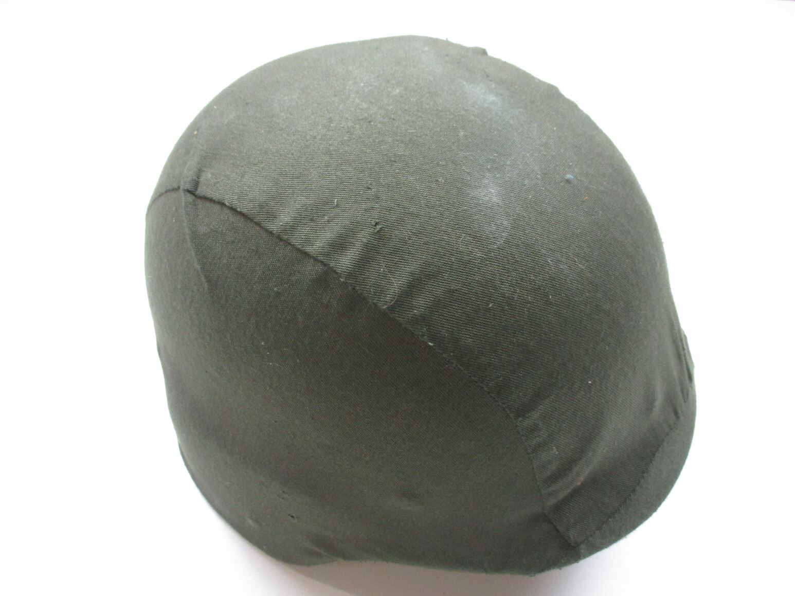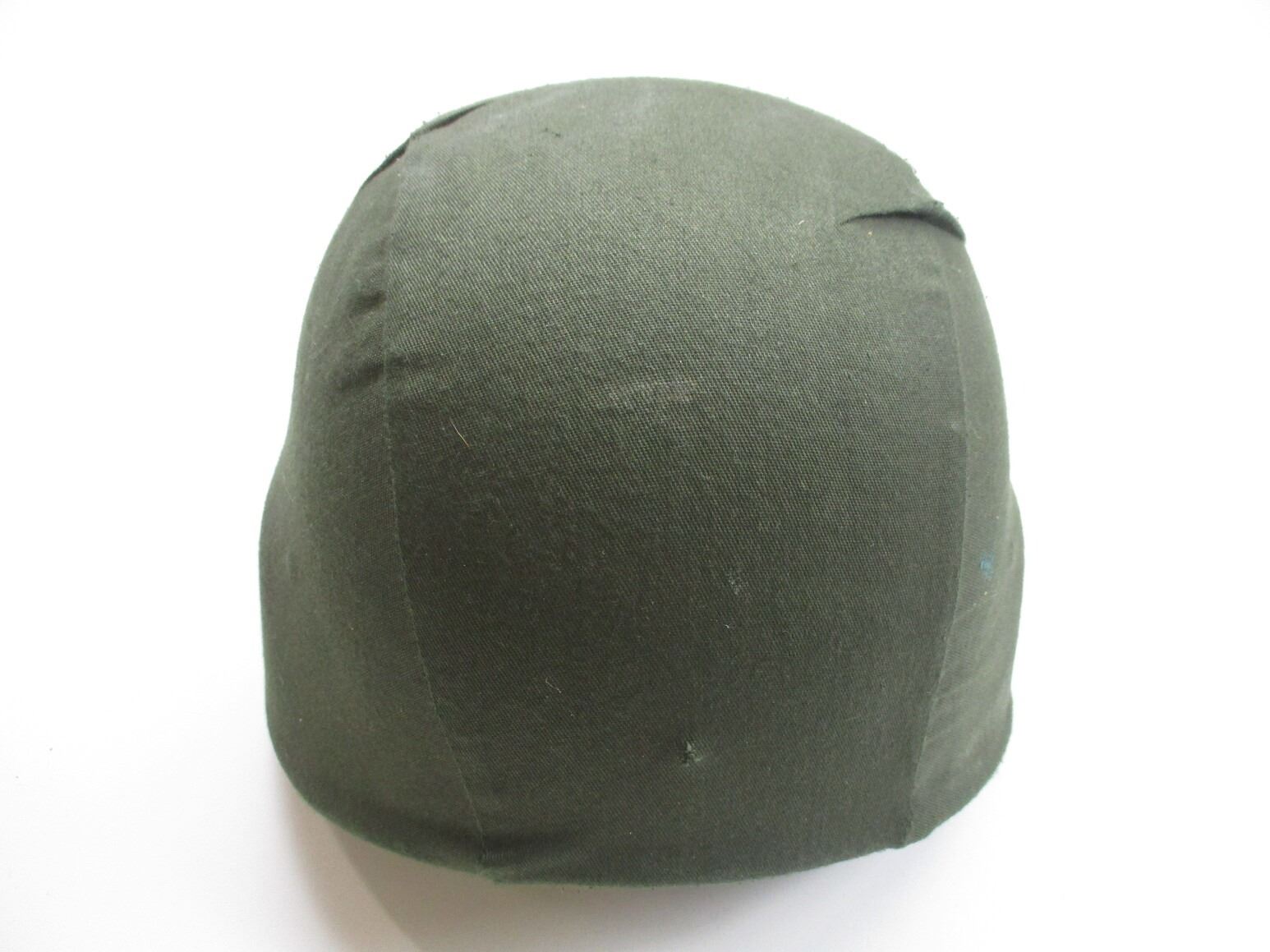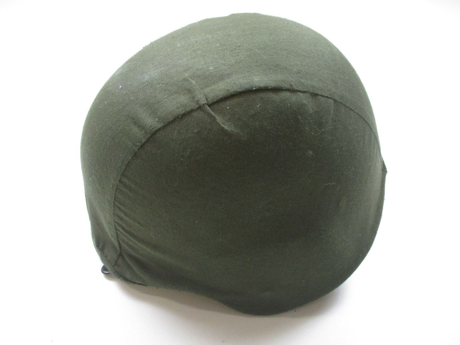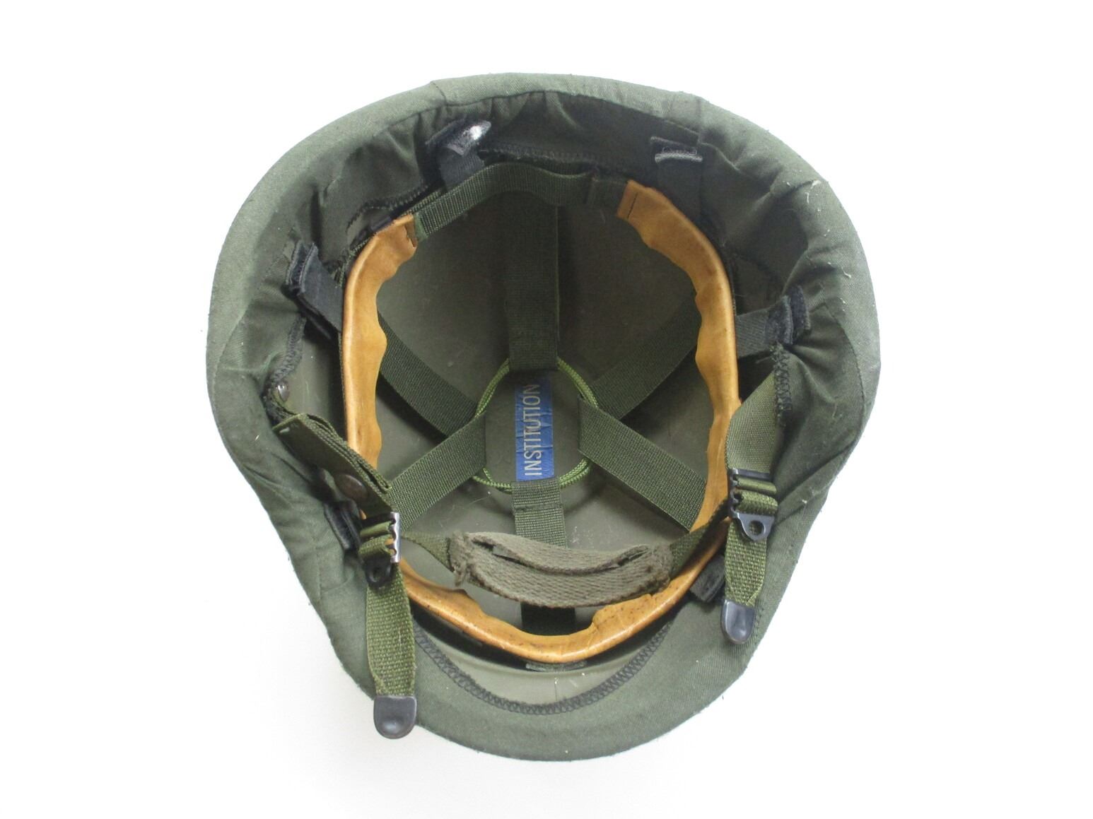CANADIAN BALLISTIC HELMET, (1) GREEN BALLISTIC WITH LEATHER HEAD LINER & CANVAS CHIN STRAP, MARKED: "KENT INSTITUTION", SIZE: LARGE, GREEN COTTON HELMET COVER. SEE PHOTOS.