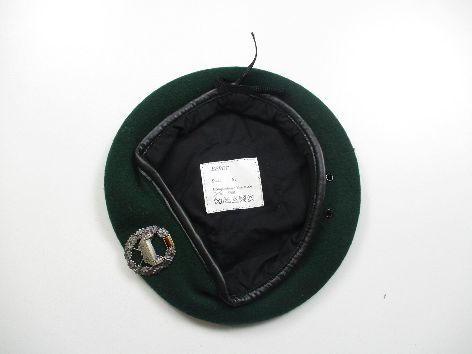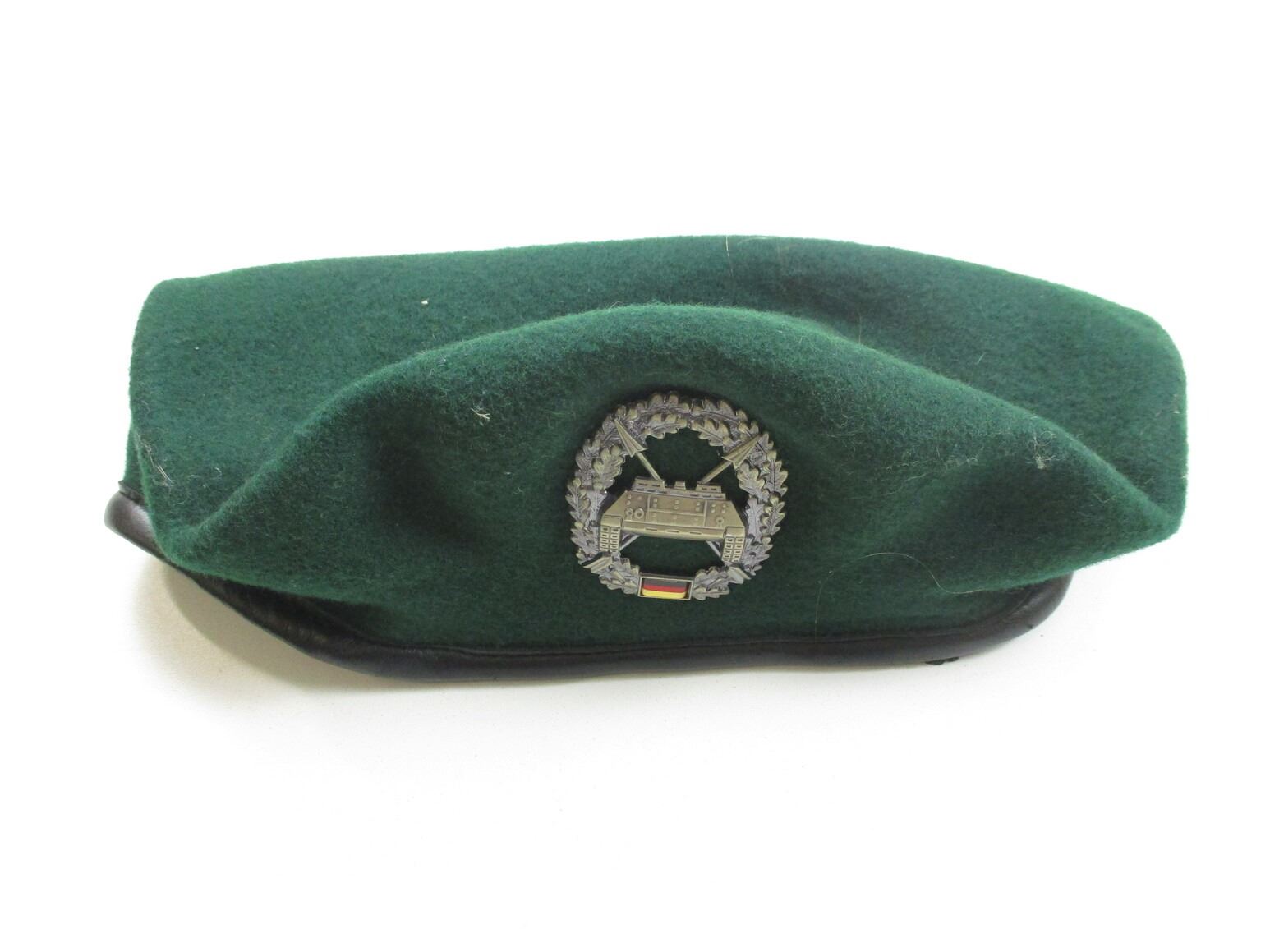 WEST GERMANY MILITARY BERET WITH TANK DESTROYER BADGE, (1) GREEN WOOL BERET WITH TANK DESTROYER BADGE ATTACHED, CAP MARKED: "BERET, SIZE: 61, CODE: S001", ETC. SEE PHOTOS.
