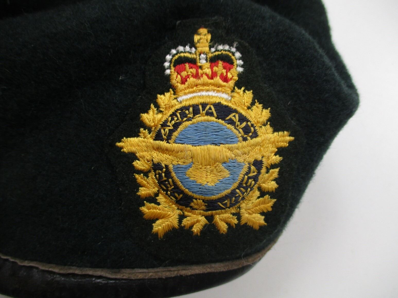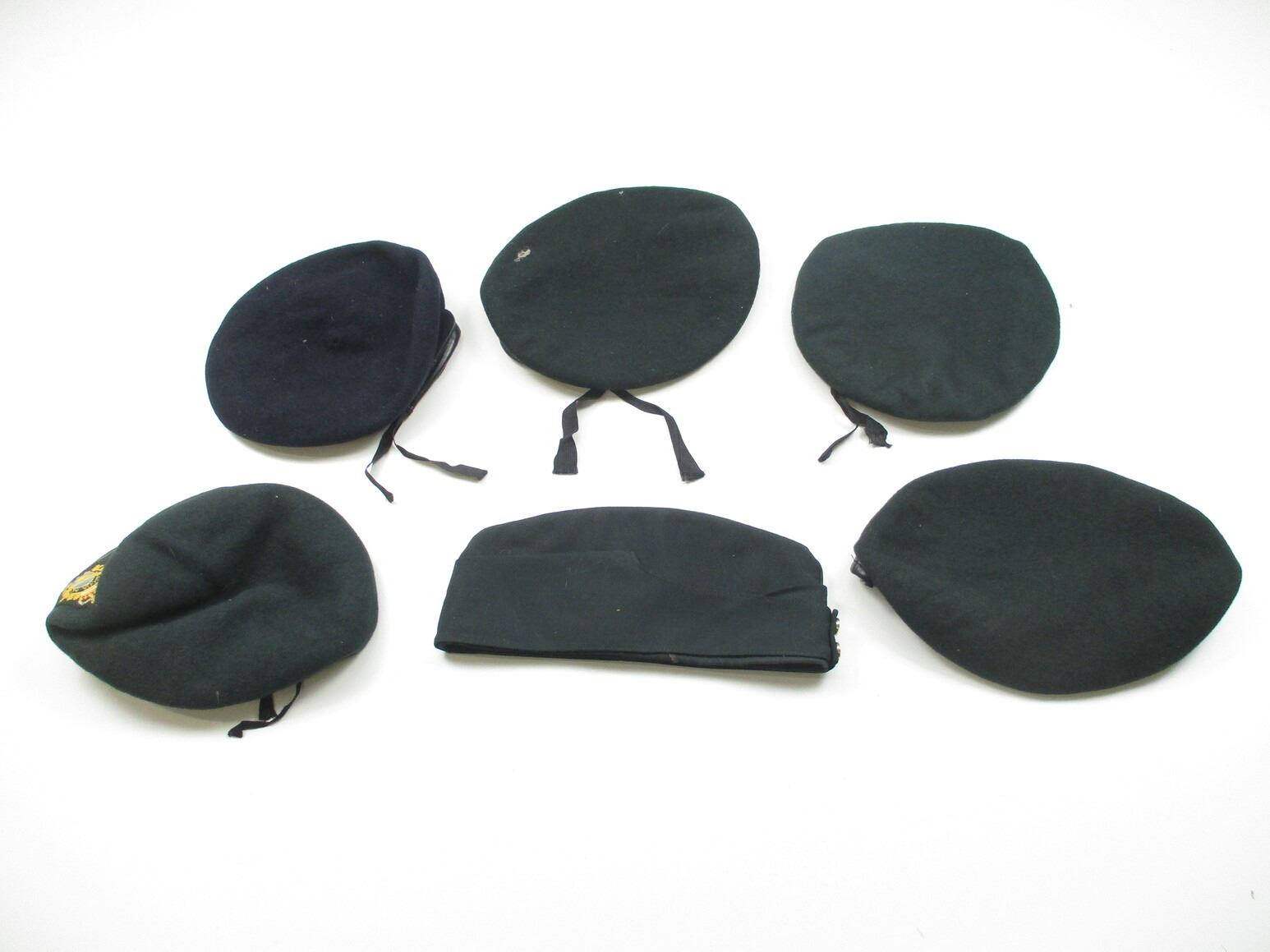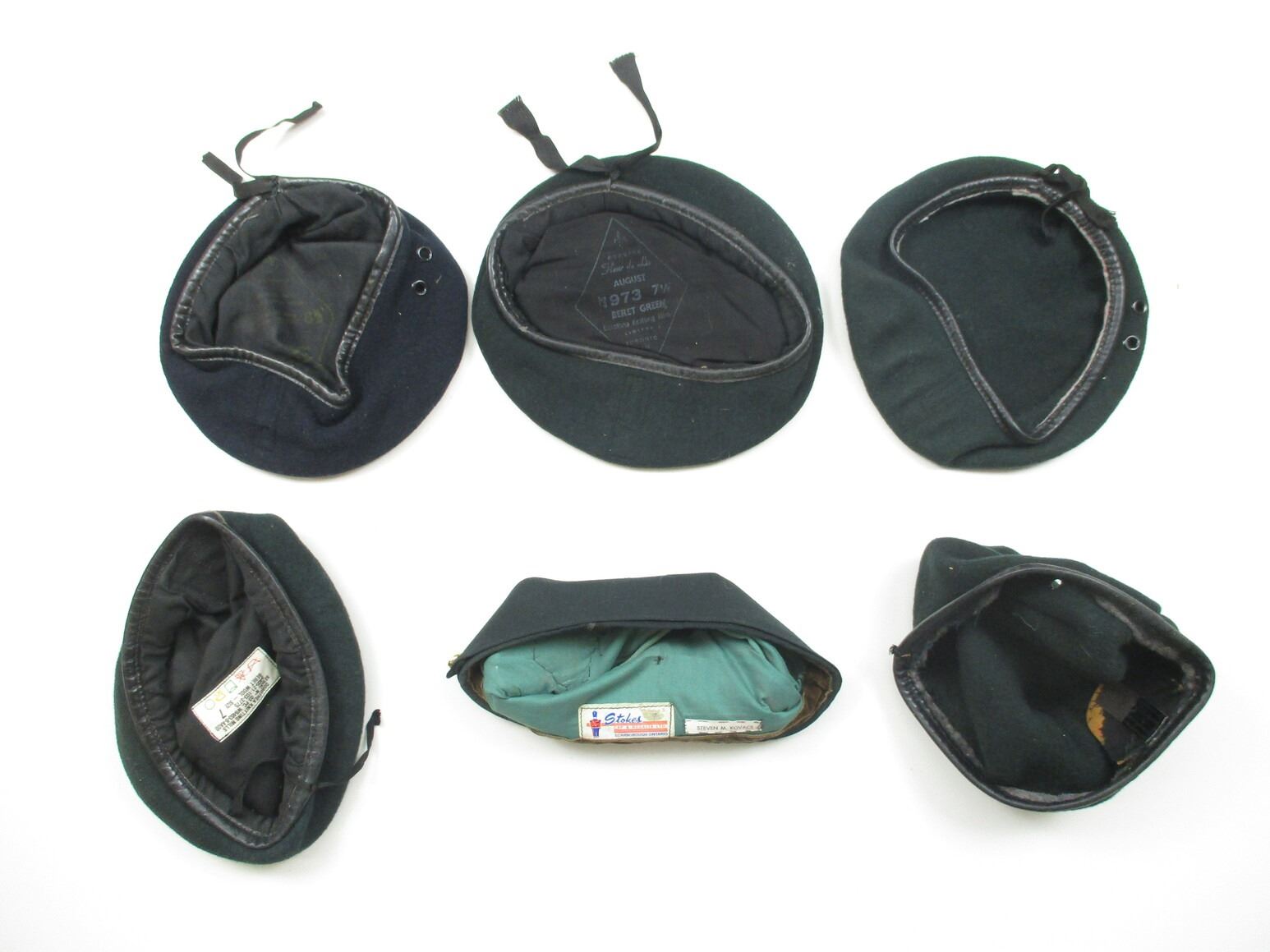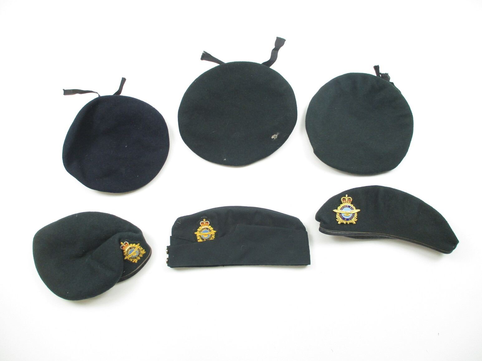 ASSORTED RCAF BERET / WEDGE CAP, ETC. LOT, LOT INCLUDES; (4) GREEN WOOL BERETS, TWO WITH RCAF CAP BADGES, VARIOUS MARKINGS, (1) BLACK WOOL BERET, FAINT / UN-CLEAR MARKINGS & (1) GREEN WEDGE CAP WITH RCAF CAP BADGE, MARKED: "STOKES CAP & REGALIA LTD., SCARBOROUGH ONTARIO". SEE PHOTOS.