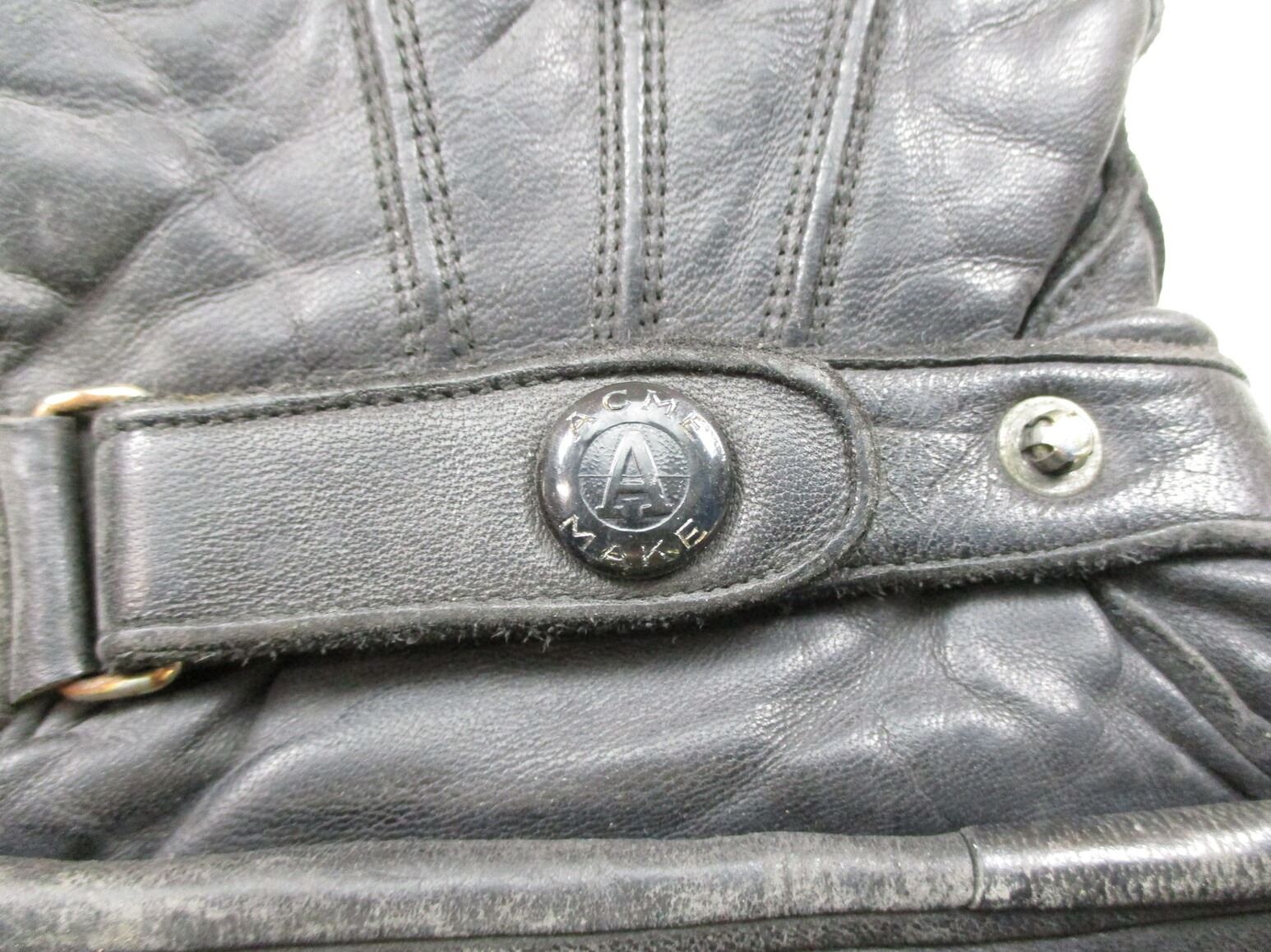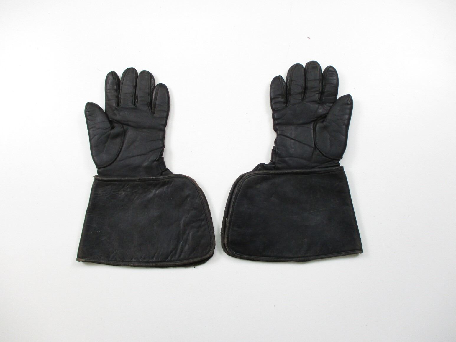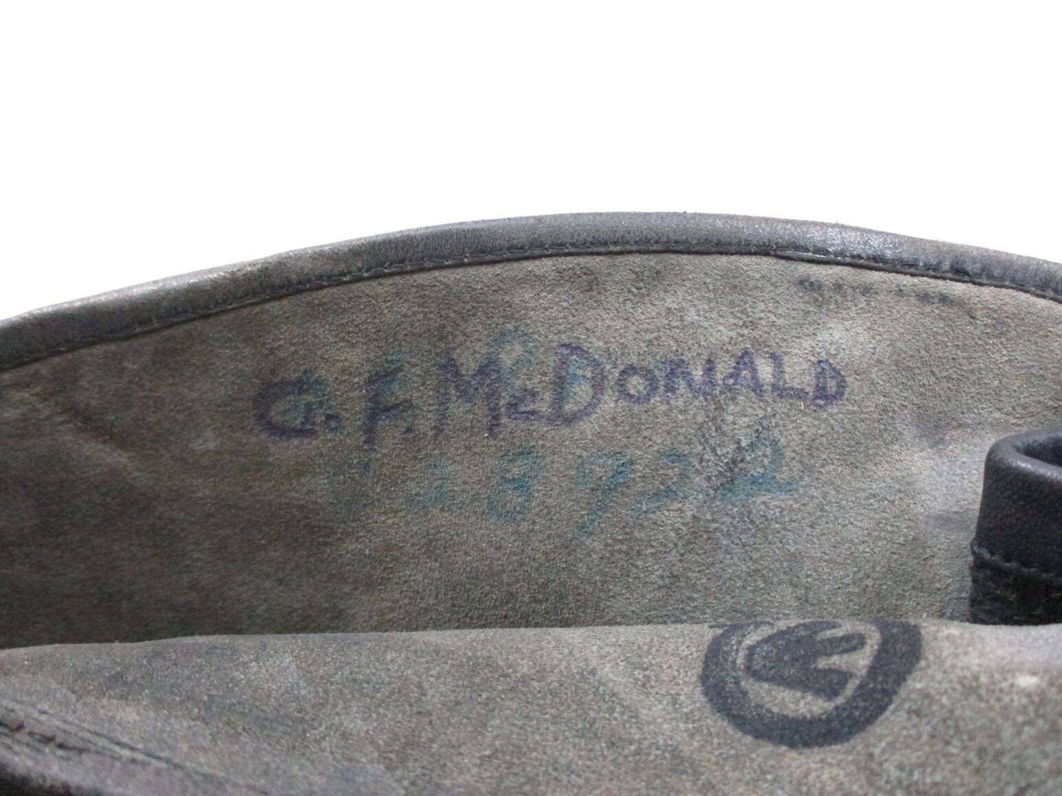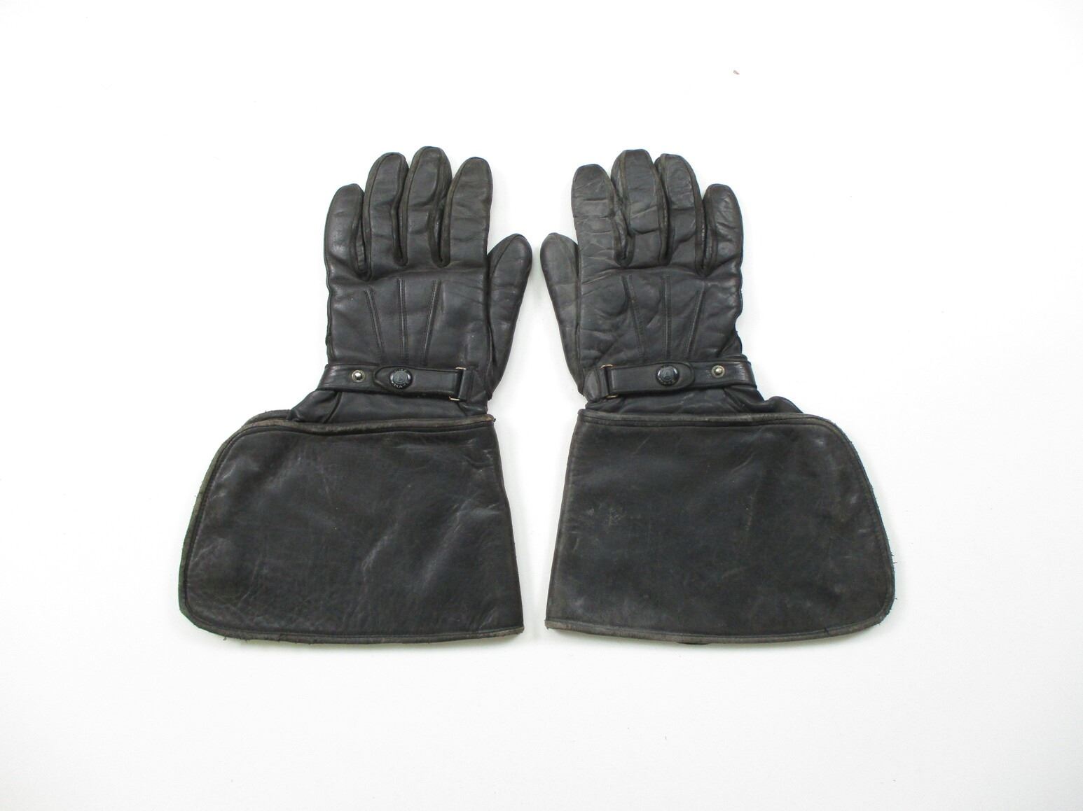 CANADIAN MILITARY DISPATCH RIDERS GLOVES, (1) PAIR, BLACK LEATHER, WITH ACME MAKER'S MARK & C-BROAD ARROW, NAMED TO: G.F. MACDONALD 28922, STICKER SHOWING: "9 1/2". SEE PHOTOS.