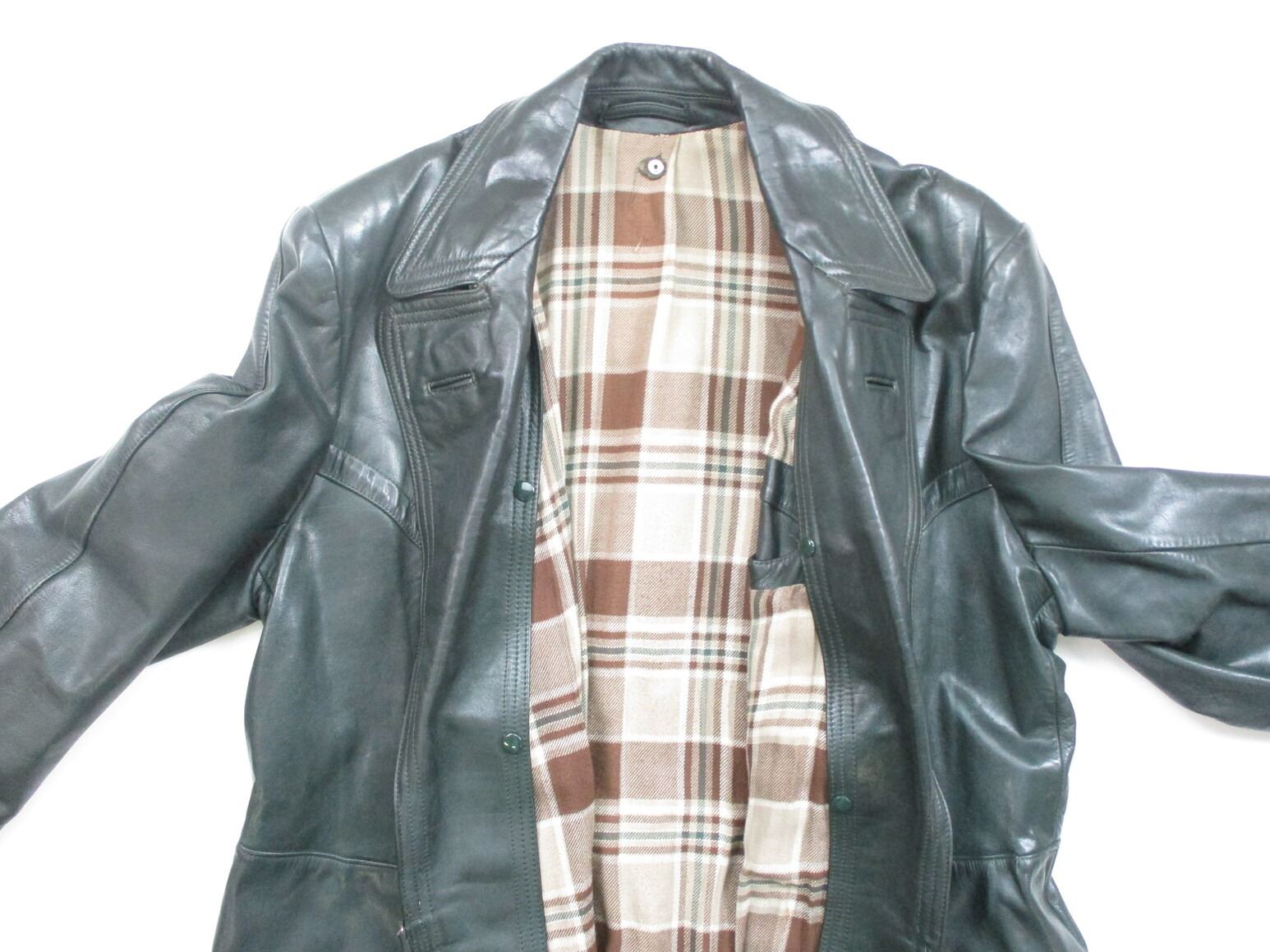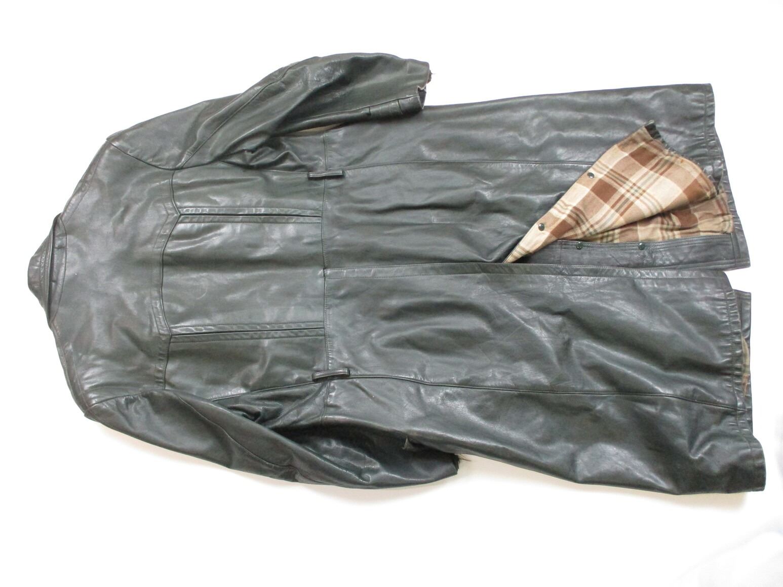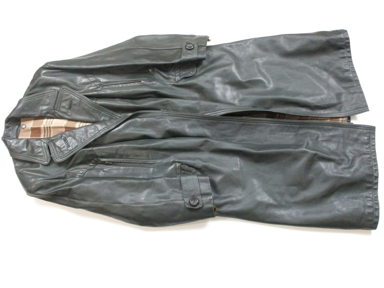 EAST GERMAN TYPE BORDER GUARD COAT, (1) BLACK LEATHER WITH INTERIOR LINER, BOTTOM HALF OF COAT SNAPS TOGETHER TO MAKE PANTS/LEG COVERINGS, MARKED: "OTTO BLUME LEDERBE-KLEIDUNG DETMOLD (LEATHER CLOTHING)", SHOULDER WIDTH APPROX. 21.5" & OAL APPROX. 51". SEE PHOTOS.