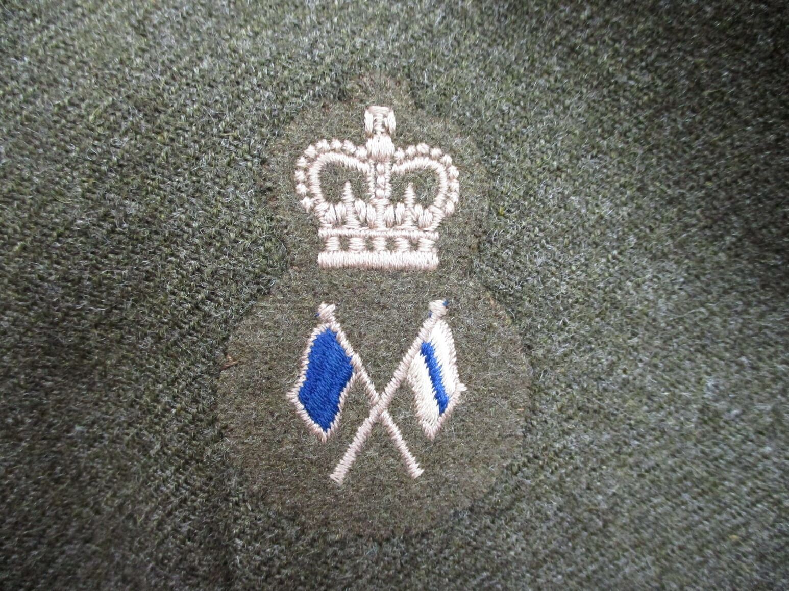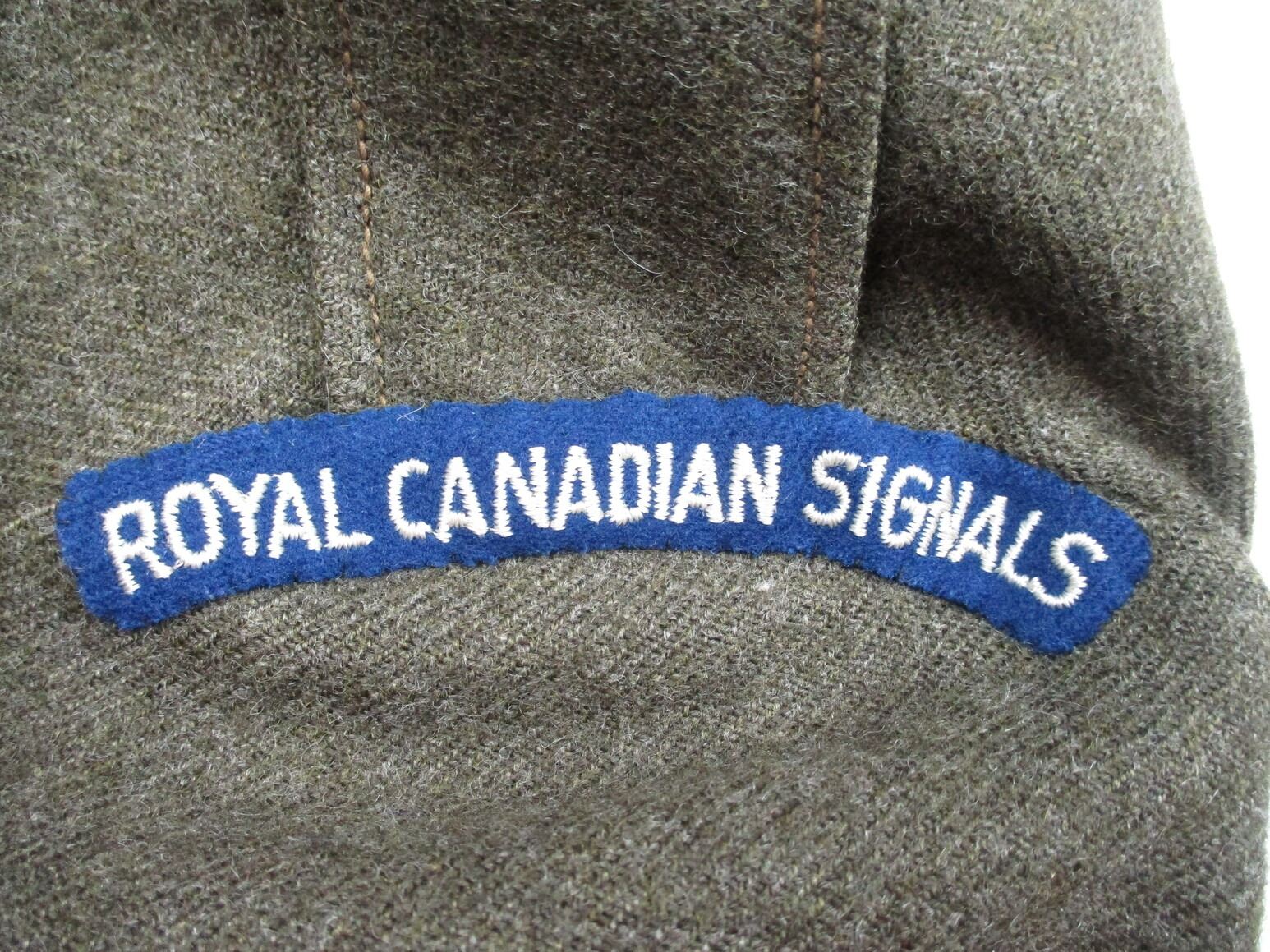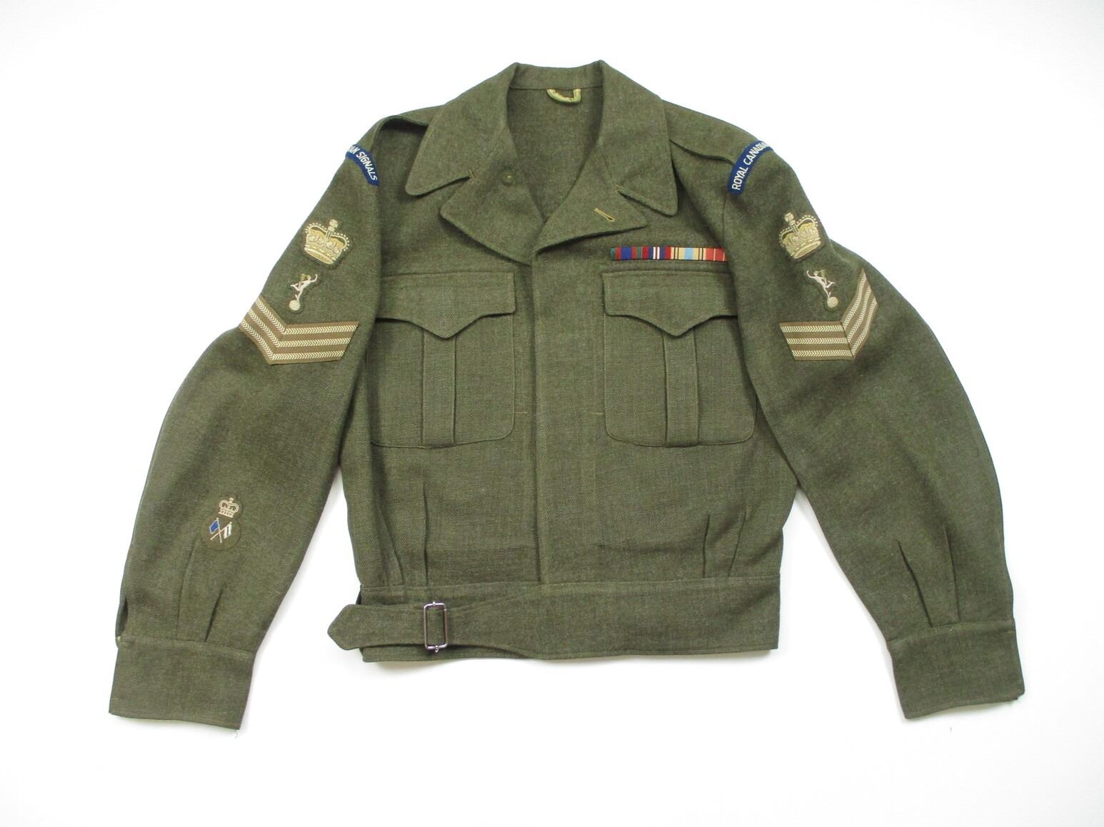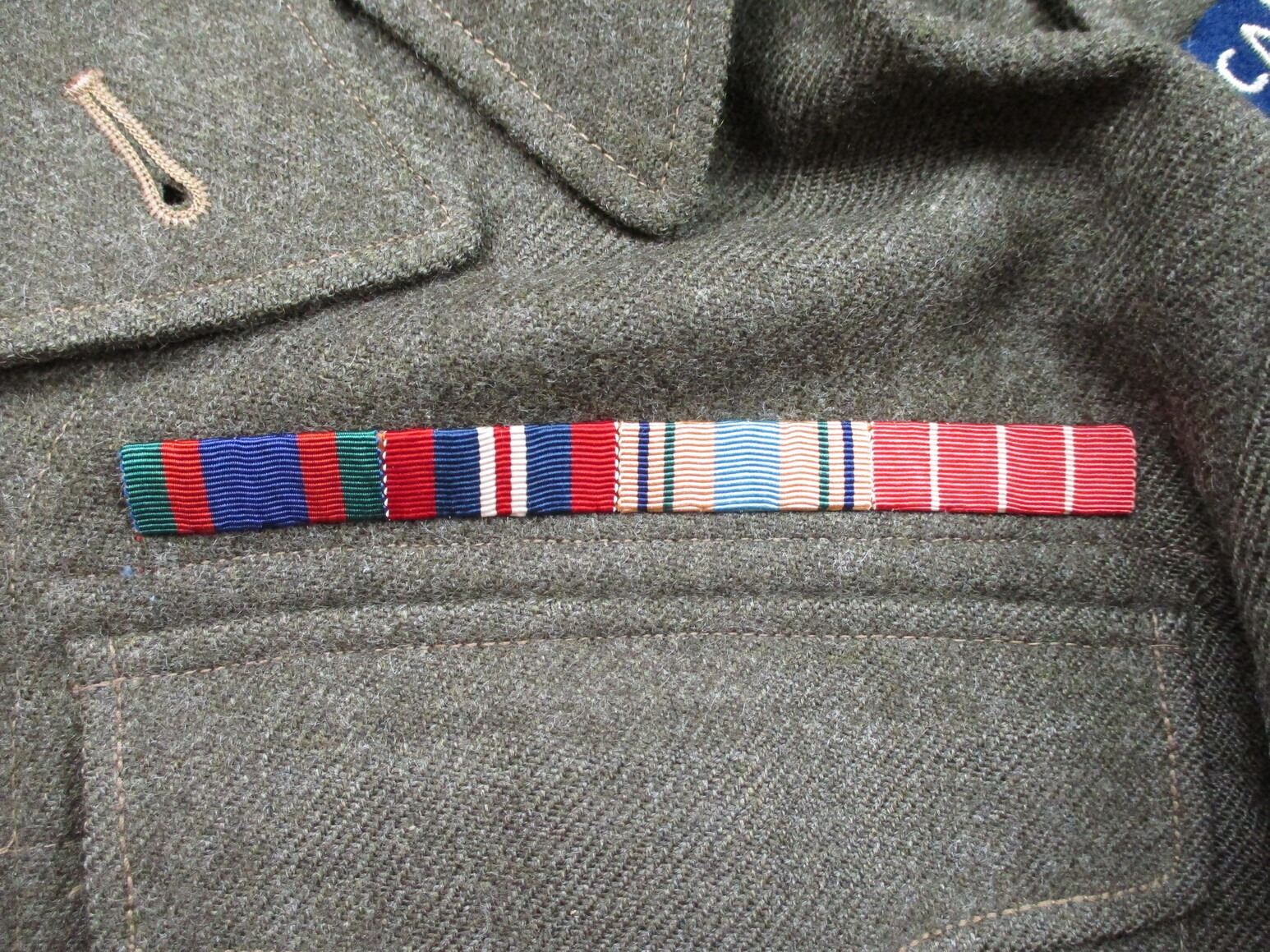 CANADIAN MILITARY BATTLEDRESS JACKET, (1) GREEN, ROYAL CANADIAN SIGNALS, SERGEANT RANKING WITH RIBBON BAR (CANADIAN VOLUNTEER SERVICE, WAR MEDAL 1939-1945, UNITED NATIONS EMERGENCY FORCE 1 & CANADIAN FORCES DECORATION), FLY-FRONTED, FAINT / UN-CLEAR MARKINGS, SIZE 7. SEE PHOTOS.