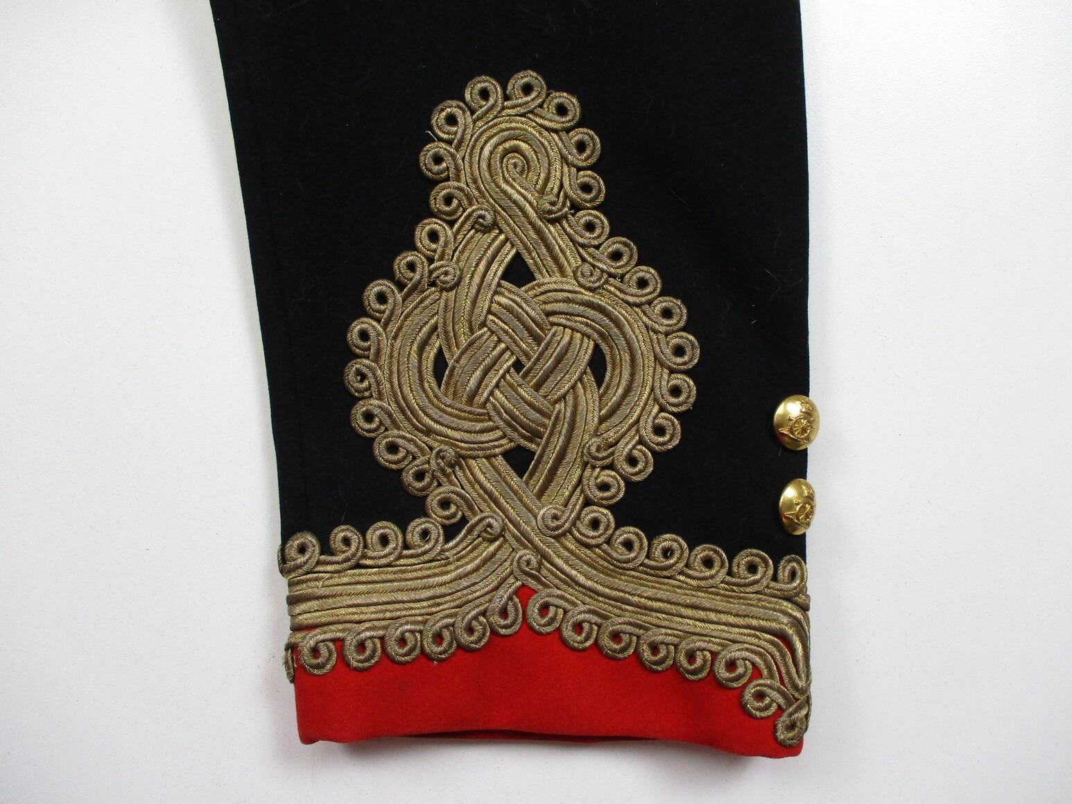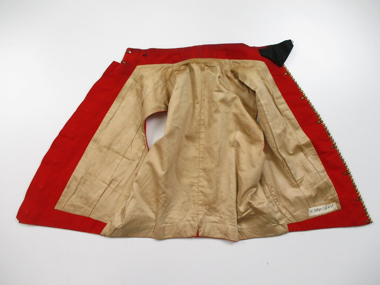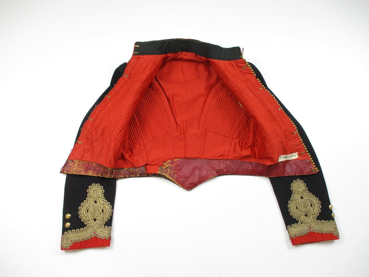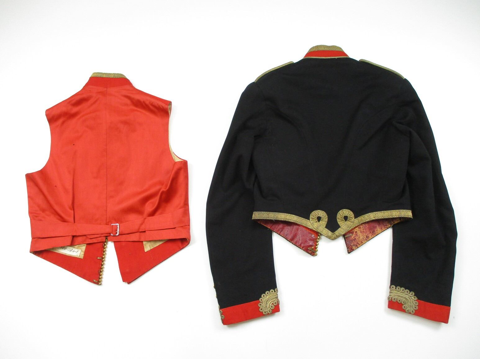 PRE-BOER / BOER WAR CANADIAN MILITARY JACKET AND VEST LOT, 5TH REGIMENT CANADIAN ARTILLERY, CAPTAIN'S RANKING, CONSIGNOR STATES: "ATTRIBUTED TO CAPTAIN M.G. BLANCHARD", LOT INCLUDES; (1) BLACK JACKET WITH RED QUILTED LINING & LEATHER WAIST TRIM, HOOK CLOSURE, GOLD ROPE TRIM, WIRE SHOULDER / NECK INSIGNIA, NO VISIBLE MARKINGS, SHOULDER WIDTH APPROX 14.75" & (1) RED VEST WITH LINER, HOOK CLOSURE. SEE PHOTOS.