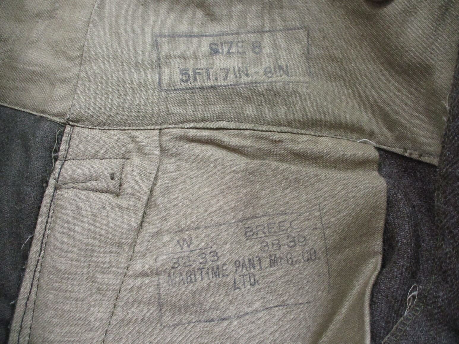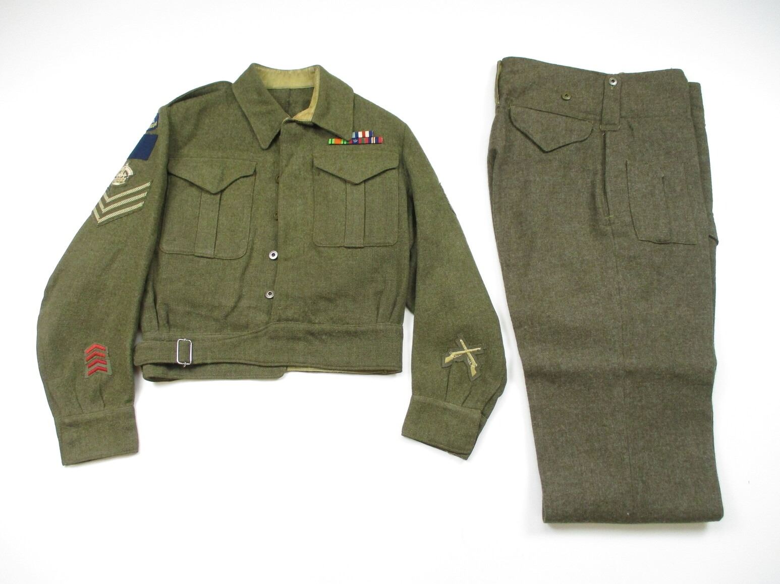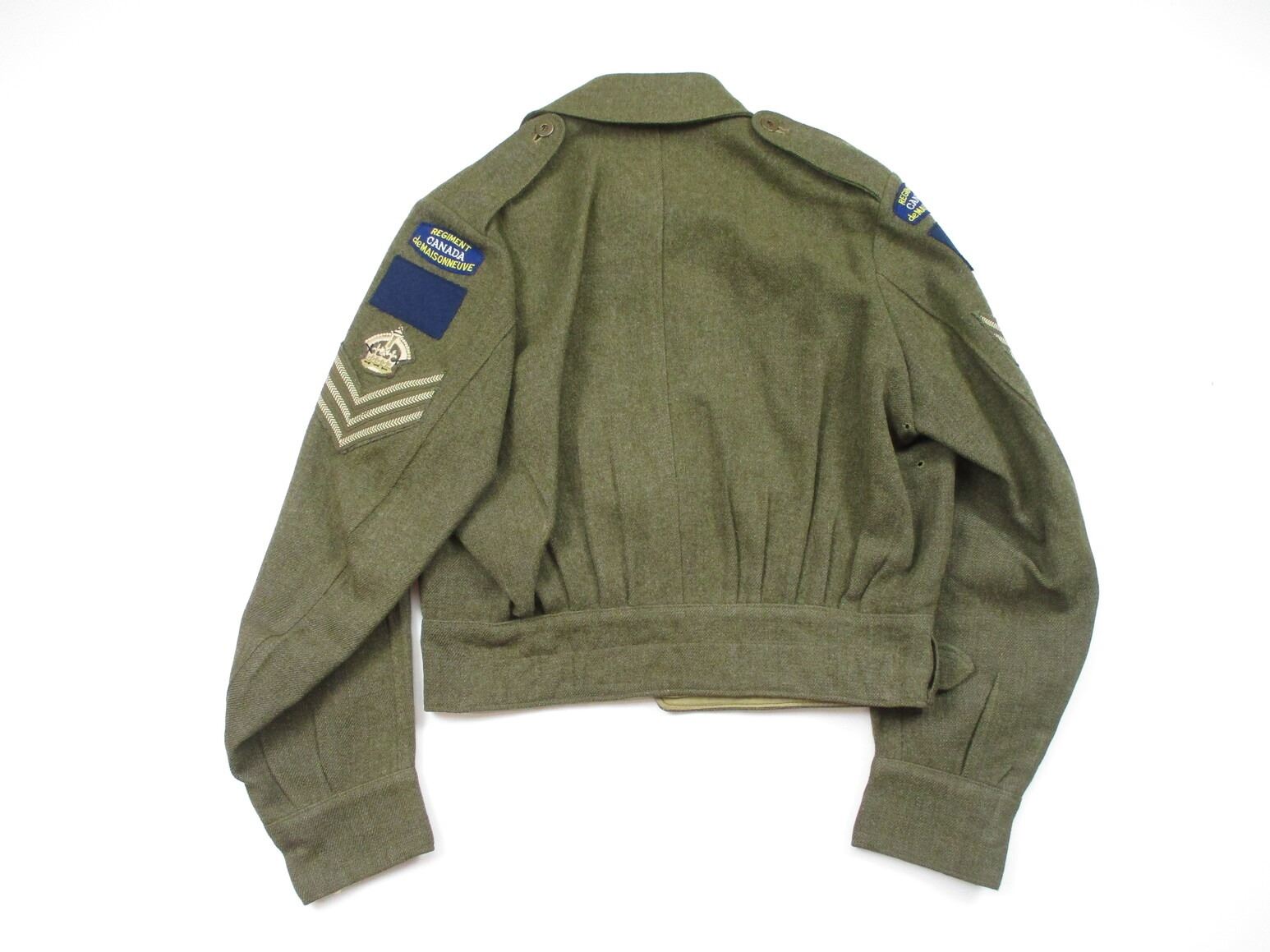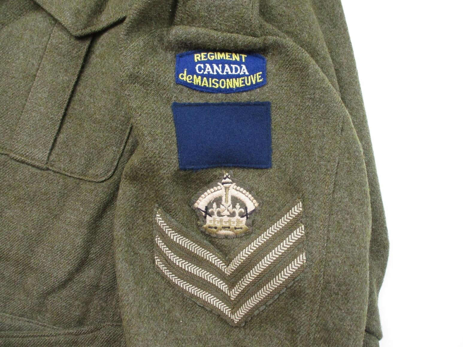 WWII CANADIAN MILITARY BATTLEDRESS UNIFORM, LOT INCLUDES; (1) GREEN WOOL JACKET, CANADA REGIMENT DE MAISONNEUVE (2ND RESERVE BATTALION), ATLANTIC COMMAND DIVISION, STAFF SERGEANT RANKING WITH 4-SERVICE CHEVRONS & RIBBON BAR (1939-1945 STAR, FRANCE & GERMANY STAR, DEFENCE MEDAL, CANADIAN VOLUNTEER SERVICE (AND MAPLE LEAF PIN) & WAR MEDAL 1939-1945), FLY-FRONTED, MARKED: "BATTLE DRESS, BLOUSES SERGE, SIZE NO.8, ….. , TIP TOP TAILORS LTD., FEB 1944" & C-BROAD ARROW & (1) PAIR GREEN WOOL PANTS, MARKED: "BATTLE DRESS, SERGE-DRAB TROUSERS, SIZE NO.8, THE MARITIME PANT CO. LTD., AMHERST, N.S." & C-BROAD ARROW. SEE PHOTOS.