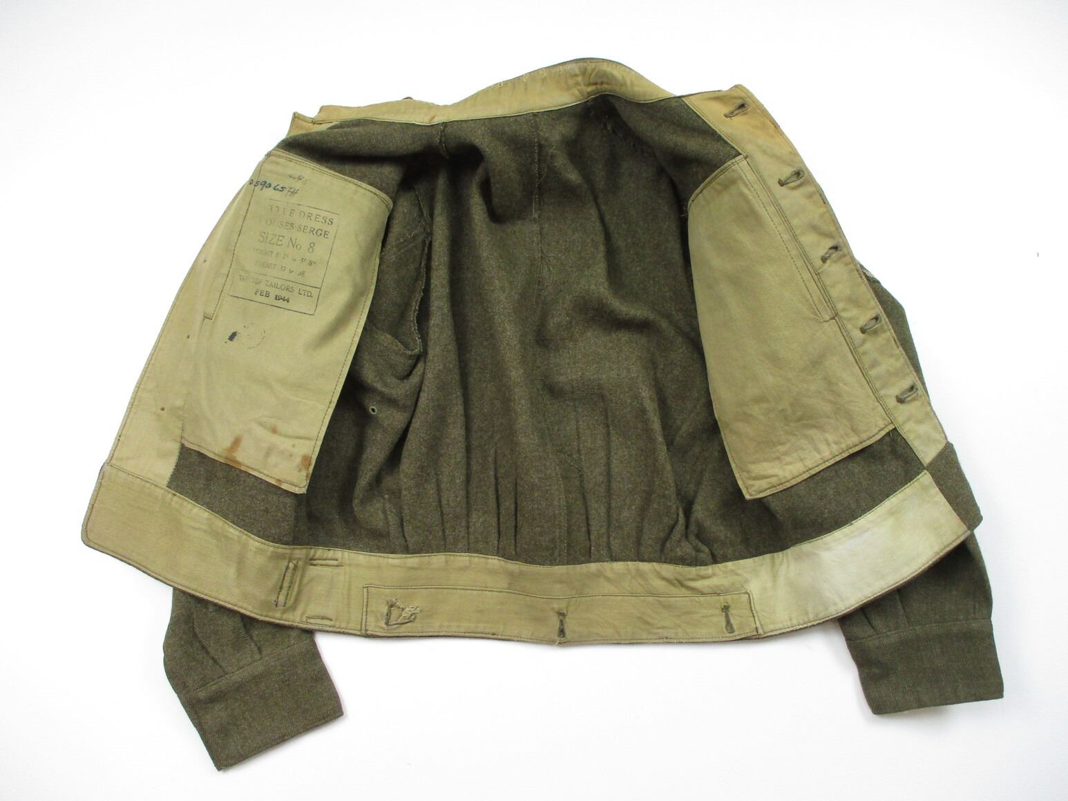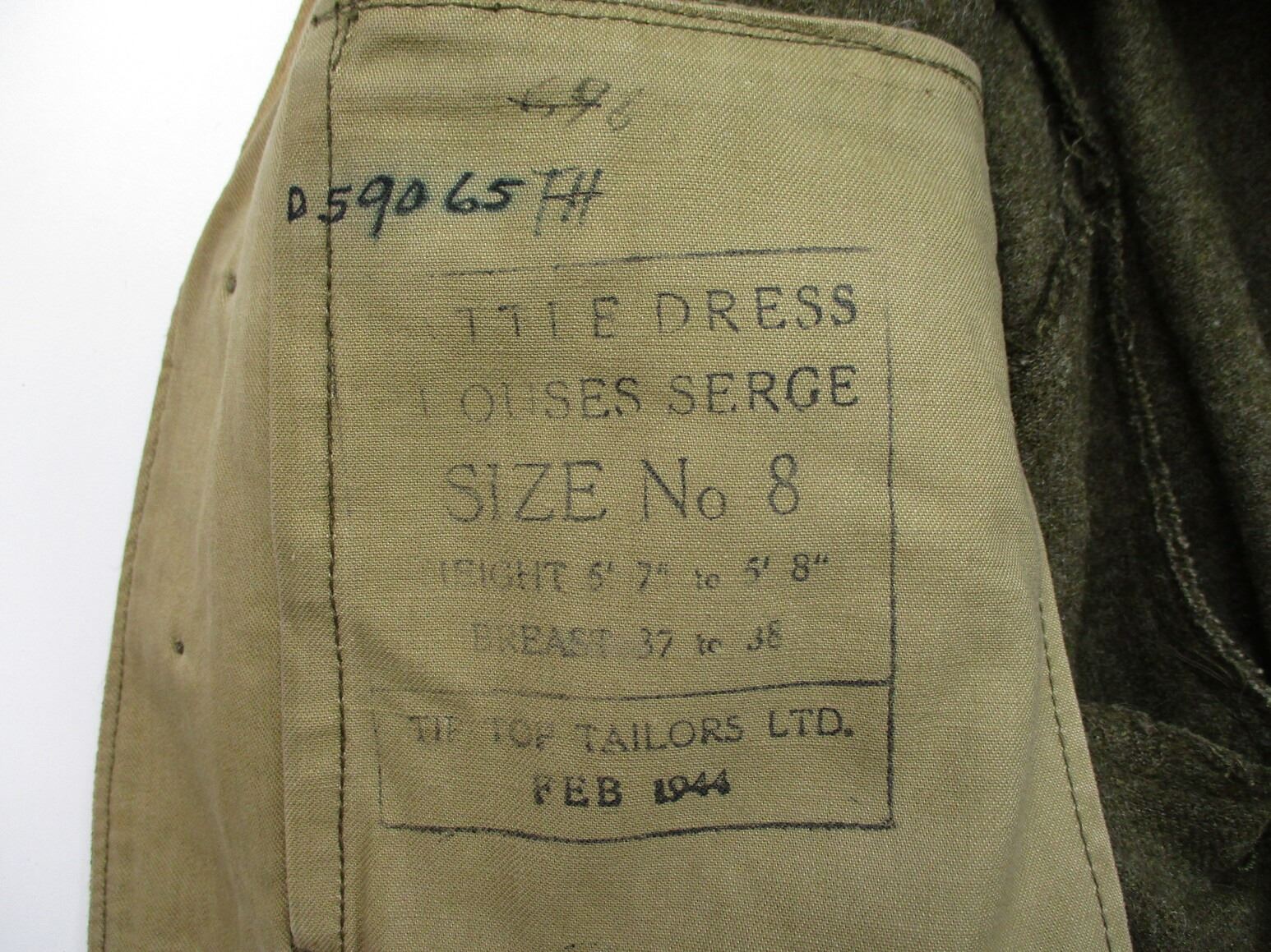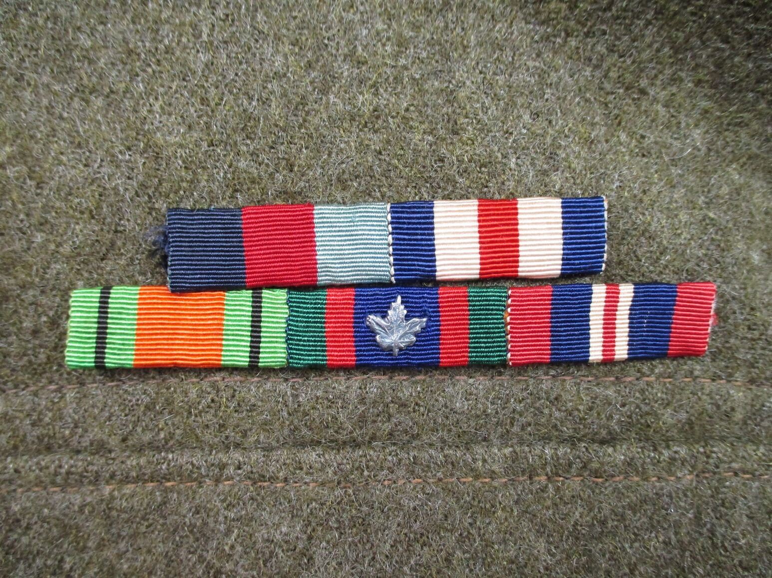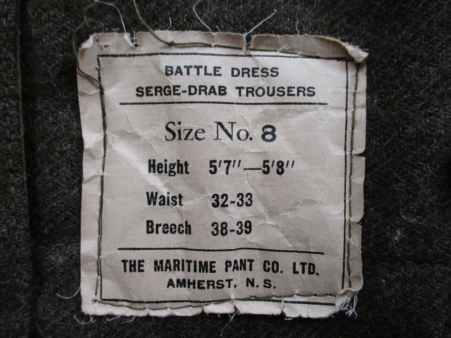 WWII CANADIAN MILITARY BATTLEDRESS UNIFORM, LOT INCLUDES; (1) GREEN WOOL JACKET, CANADA REGIMENT DE MAISONNEUVE (2ND RESERVE BATTALION), ATLANTIC COMMAND DIVISION, STAFF SERGEANT RANKING WITH 4-SERVICE CHEVRONS & RIBBON BAR (1939-1945 STAR, FRANCE & GERMANY STAR, DEFENCE MEDAL, CANADIAN VOLUNTEER SERVICE (AND MAPLE LEAF PIN) & WAR MEDAL 1939-1945), FLY-FRONTED, MARKED: "BATTLE DRESS, BLOUSES SERGE, SIZE NO.8, ….. , TIP TOP TAILORS LTD., FEB 1944" & C-BROAD ARROW & (1) PAIR GREEN WOOL PANTS, MARKED: "BATTLE DRESS, SERGE-DRAB TROUSERS, SIZE NO.8, THE MARITIME PANT CO. LTD., AMHERST, N.S." & C-BROAD ARROW. SEE PHOTOS.