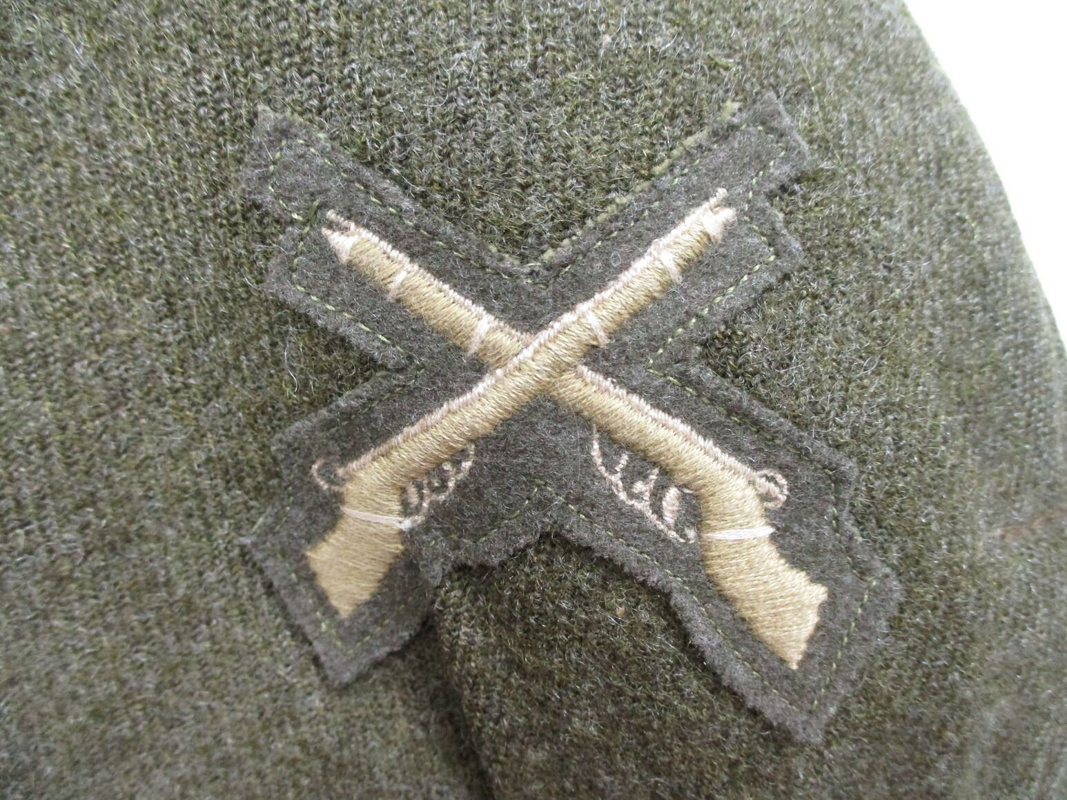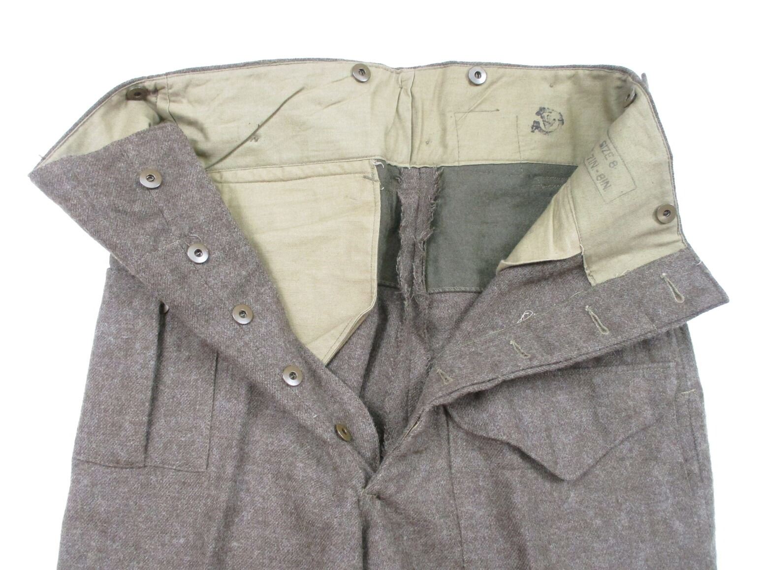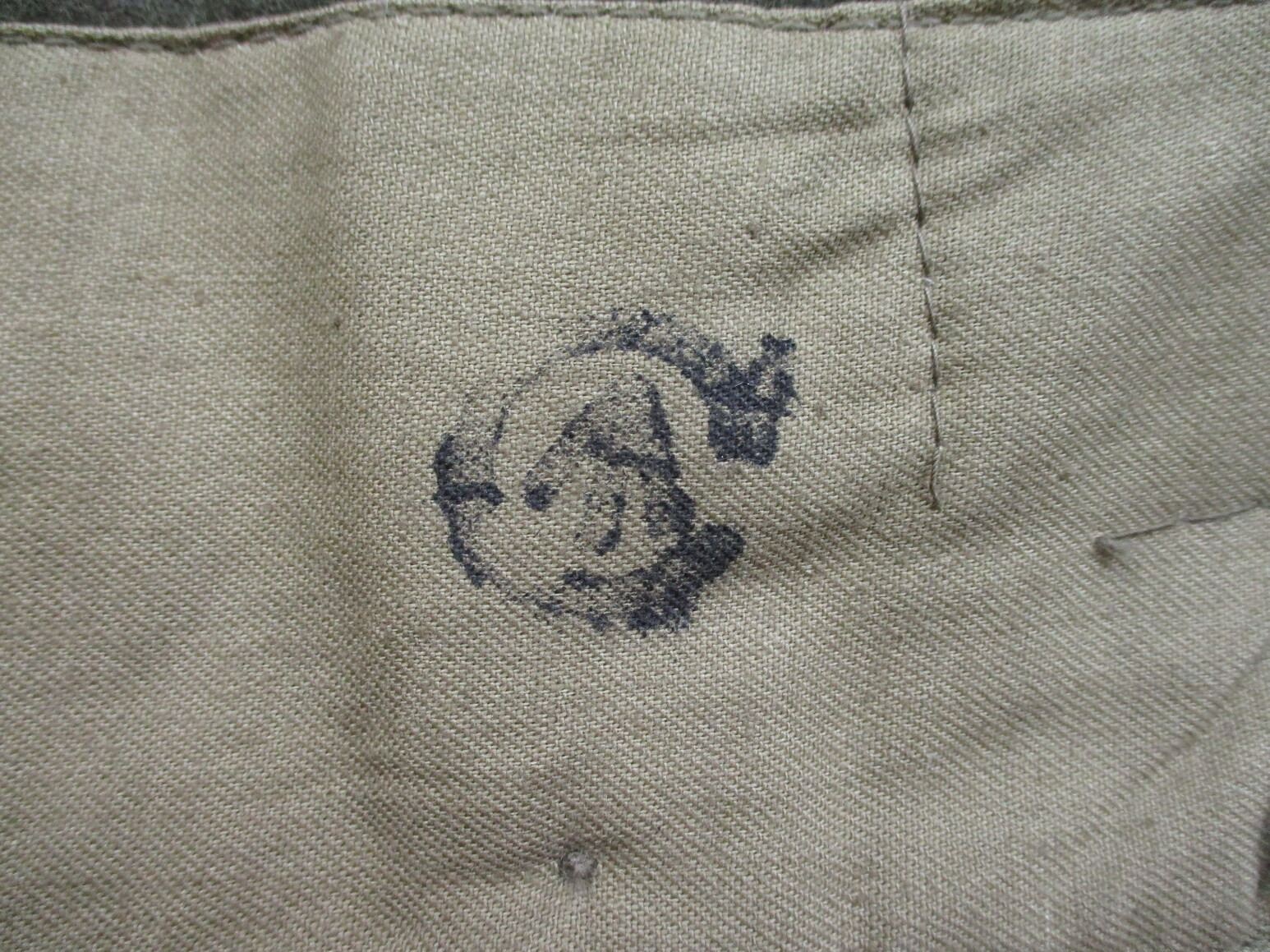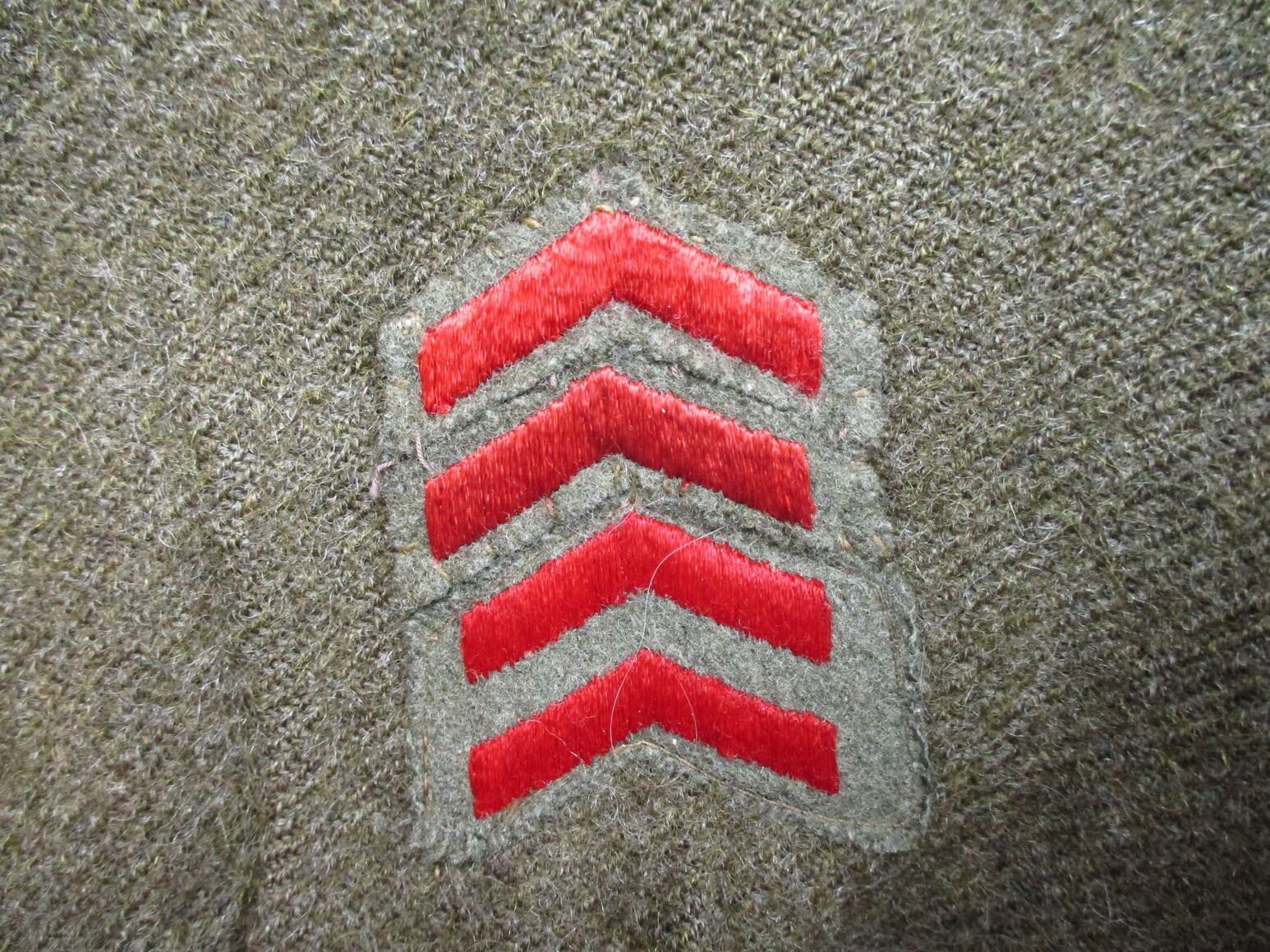 WWII CANADIAN MILITARY BATTLEDRESS UNIFORM, LOT INCLUDES; (1) GREEN WOOL JACKET, CANADA REGIMENT DE MAISONNEUVE (2ND RESERVE BATTALION), ATLANTIC COMMAND DIVISION, STAFF SERGEANT RANKING WITH 4-SERVICE CHEVRONS & RIBBON BAR (1939-1945 STAR, FRANCE & GERMANY STAR, DEFENCE MEDAL, CANADIAN VOLUNTEER SERVICE (AND MAPLE LEAF PIN) & WAR MEDAL 1939-1945), FLY-FRONTED, MARKED: "BATTLE DRESS, BLOUSES SERGE, SIZE NO.8, ….. , TIP TOP TAILORS LTD., FEB 1944" & C-BROAD ARROW & (1) PAIR GREEN WOOL PANTS, MARKED: "BATTLE DRESS, SERGE-DRAB TROUSERS, SIZE NO.8, THE MARITIME PANT CO. LTD., AMHERST, N.S." & C-BROAD ARROW. SEE PHOTOS.