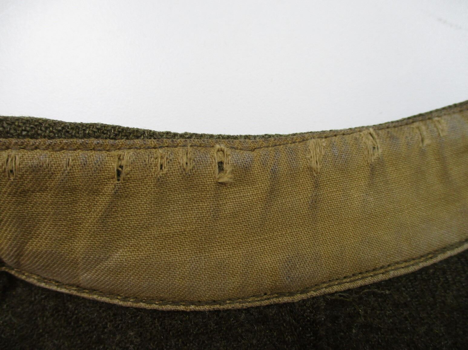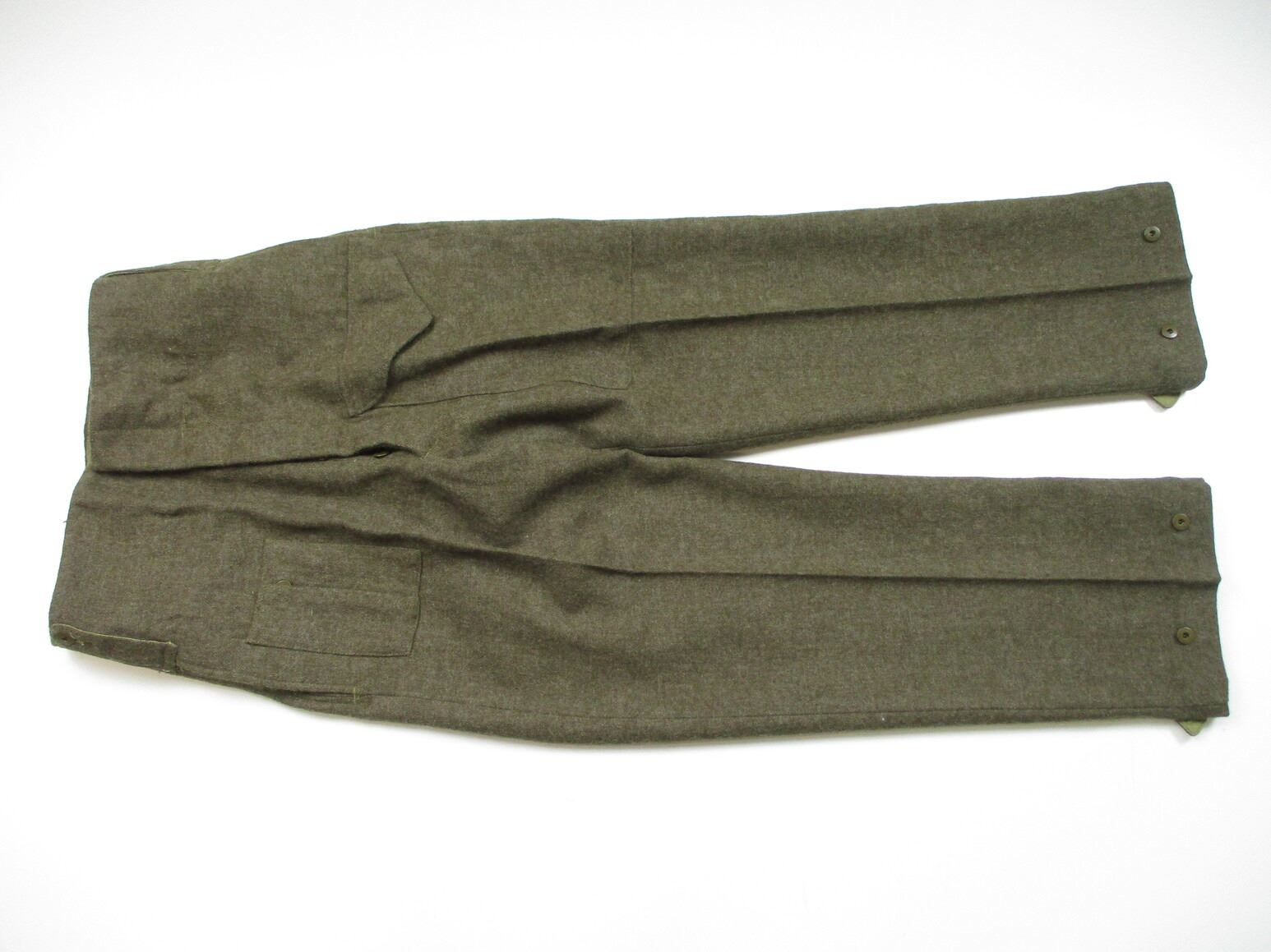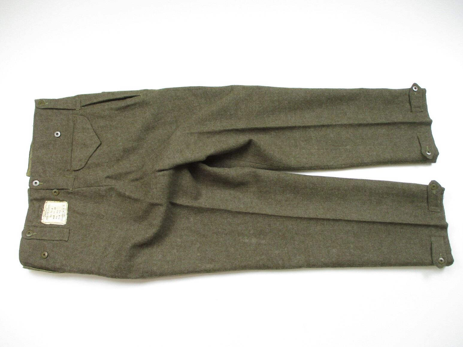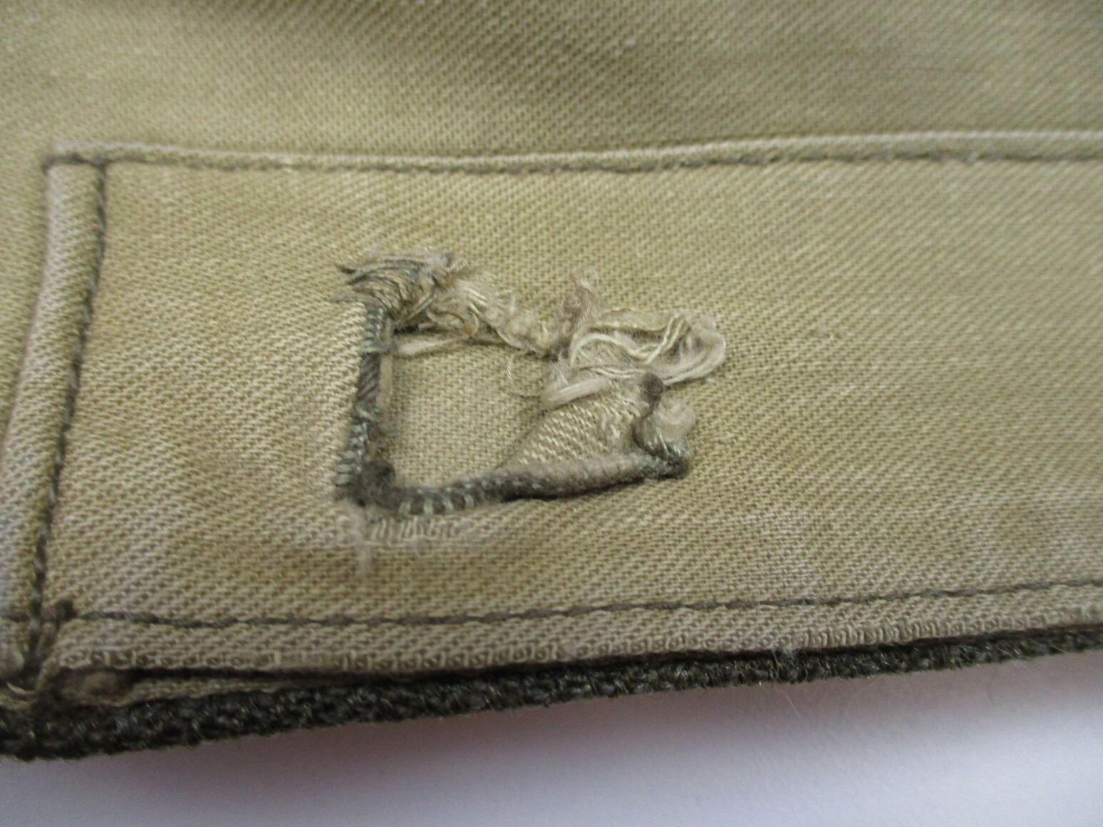 WWII CANADIAN MILITARY BATTLEDRESS UNIFORM, LOT INCLUDES; (1) GREEN WOOL JACKET, CANADA REGIMENT DE MAISONNEUVE (2ND RESERVE BATTALION), ATLANTIC COMMAND DIVISION, STAFF SERGEANT RANKING WITH 4-SERVICE CHEVRONS & RIBBON BAR (1939-1945 STAR, FRANCE & GERMANY STAR, DEFENCE MEDAL, CANADIAN VOLUNTEER SERVICE (AND MAPLE LEAF PIN) & WAR MEDAL 1939-1945), FLY-FRONTED, MARKED: "BATTLE DRESS, BLOUSES SERGE, SIZE NO.8, ….. , TIP TOP TAILORS LTD., FEB 1944" & C-BROAD ARROW & (1) PAIR GREEN WOOL PANTS, MARKED: "BATTLE DRESS, SERGE-DRAB TROUSERS, SIZE NO.8, THE MARITIME PANT CO. LTD., AMHERST, N.S." & C-BROAD ARROW. SEE PHOTOS.